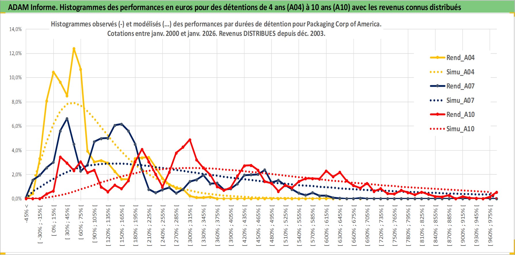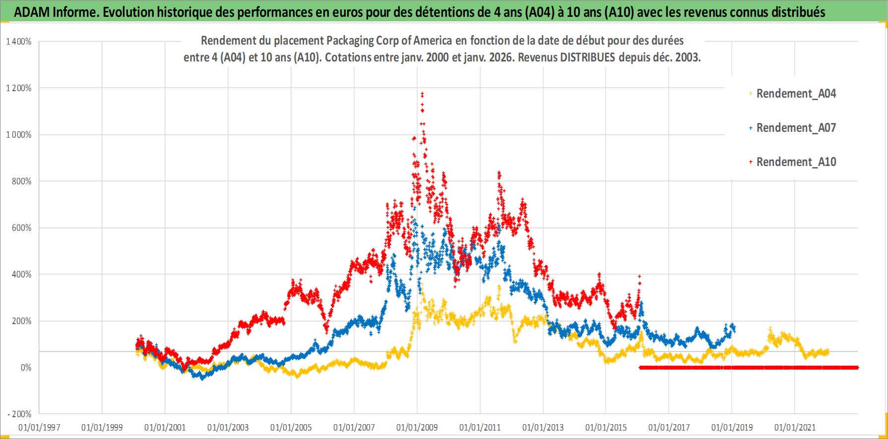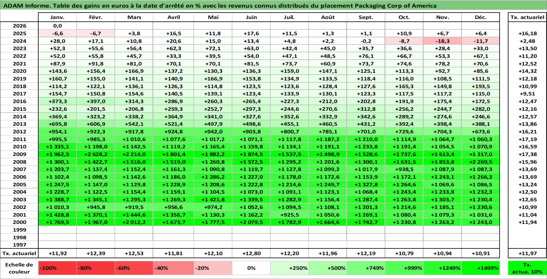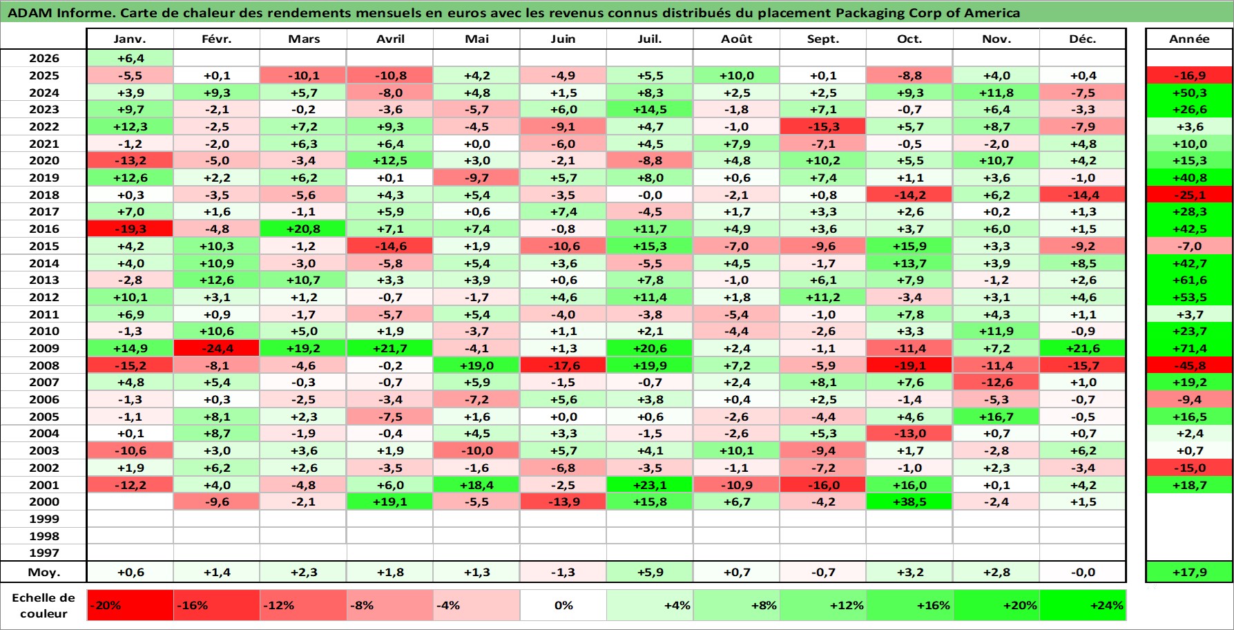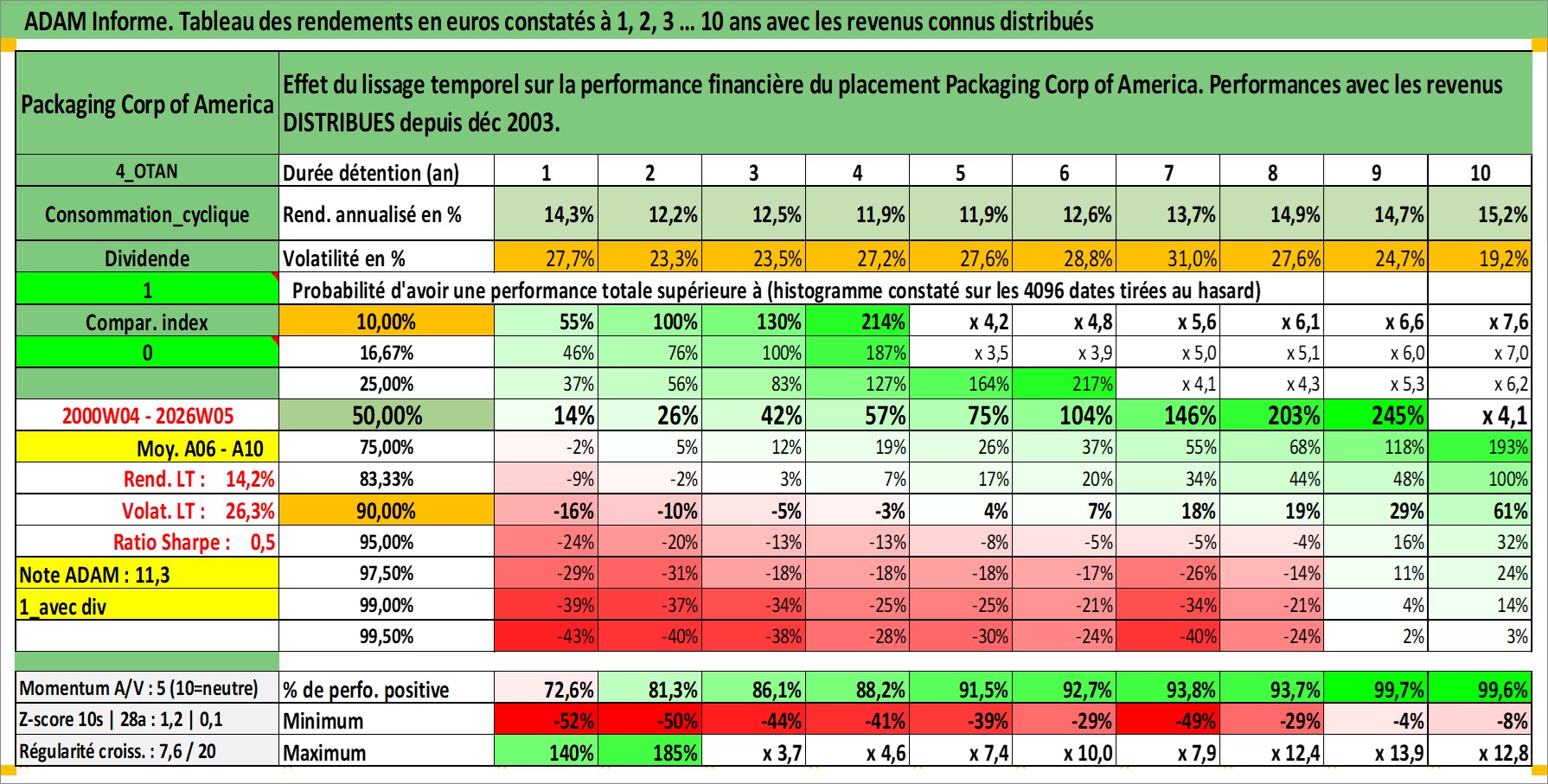 Site dédié aux investisseursPage dédiée sur site financeAnalyse des valorisations hebdomadaires de l'action Packaging Corp of America. Cet actif est cote en USD. Les valorisations sont en contrevaleur EURO et couvrent les semaines 2000W04 a 2026W05. Les revenus de cet actif financier sont pris en compte depuis la semaine 2003W50. La note globale ESG de cet actif est estimee a 12.0 (apres rebasage entre 0 et 20).