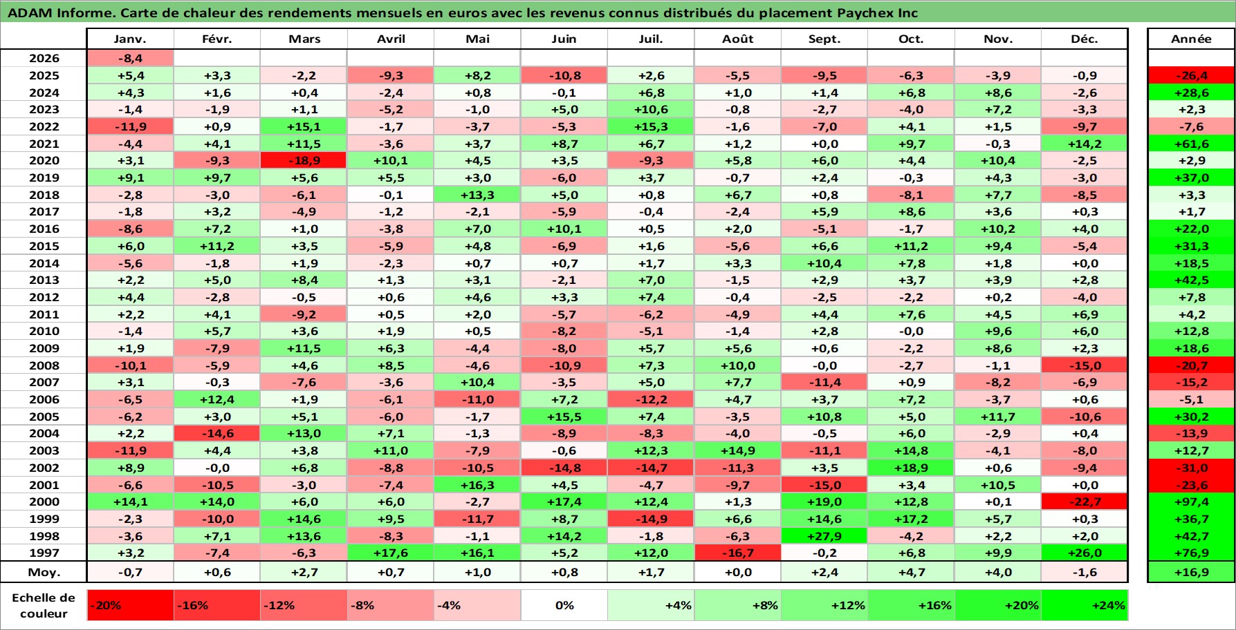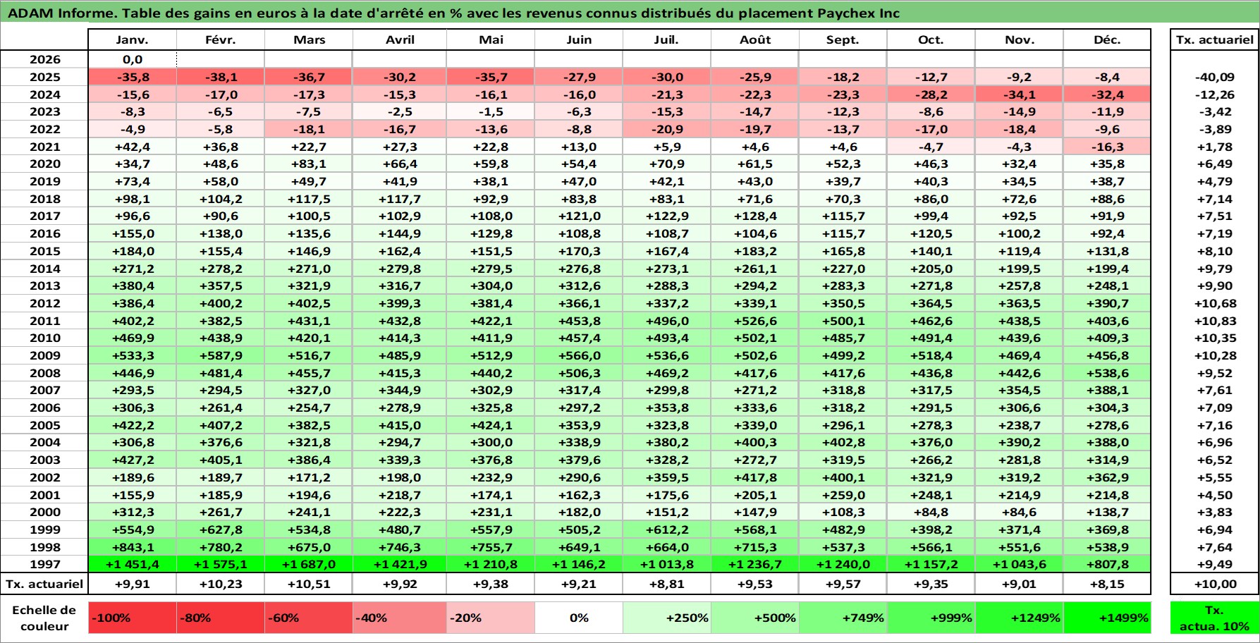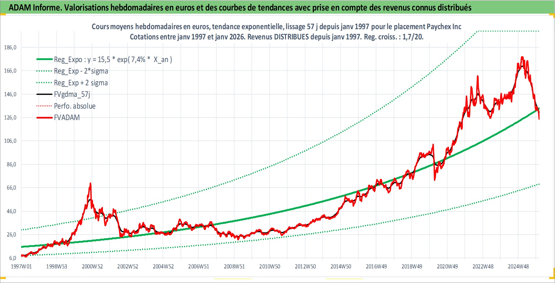 Site dédié aux investisseursPage dédiée sur site financeAnalyse des valorisations hebdomadaires de l'action Paychex Inc. Cet actif est cote en USD. Les valorisations sont en contrevaleur EURO et couvrent les semaines 1997W01 a 2026W05. Les revenus de cet actif financier sont pris en compte depuis la semaine 1997W05. La note globale ESG de cet actif est estimee a 12.0 (apres rebasage entre 0 et 20).