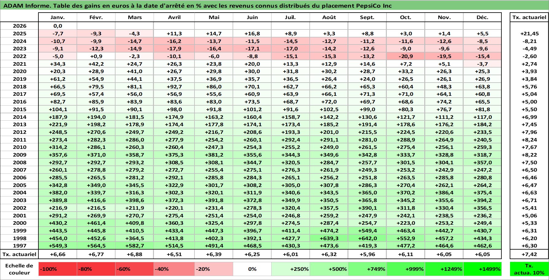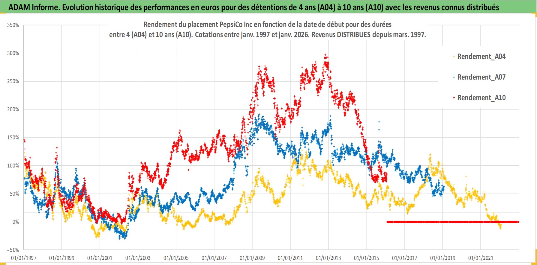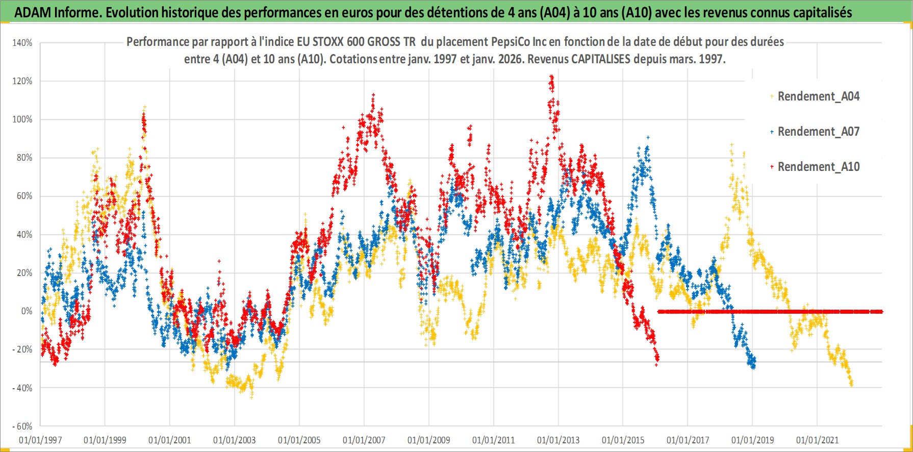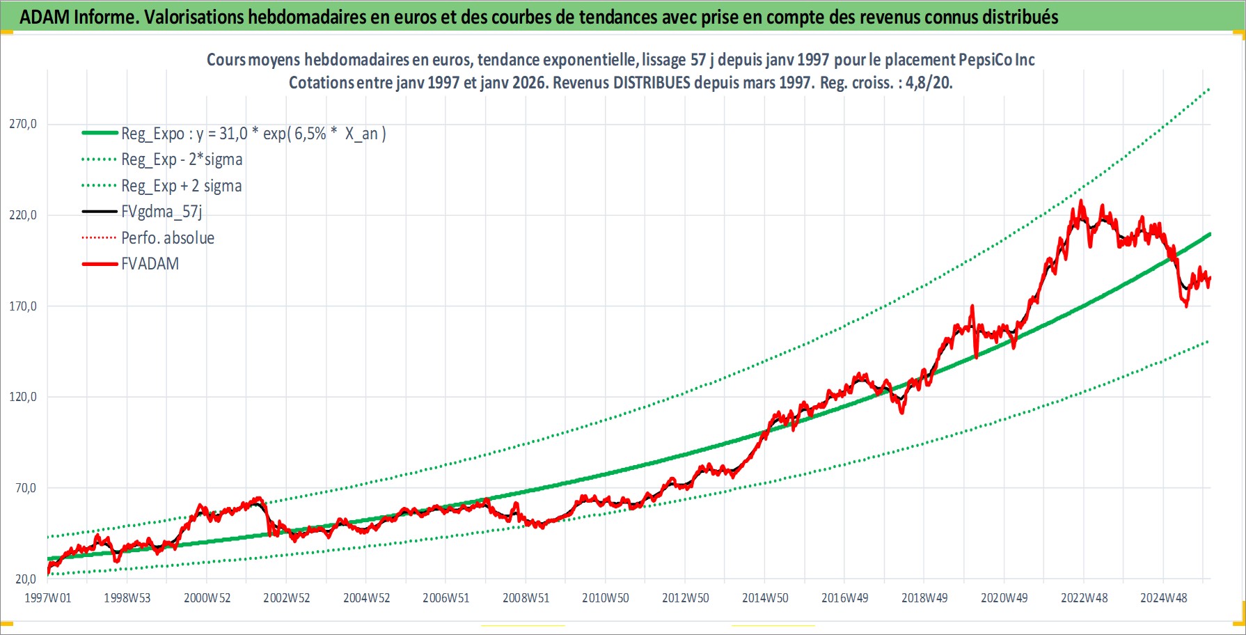 Site dédié aux investisseursPage dédiée sur site financeAnalyse des valorisations hebdomadaires de l'action PepsiCo Inc. Cet actif est cote en USD. Les valorisations sont en contrevaleur EURO et couvrent les semaines 1997W01 a 2026W05. Les revenus de cet actif financier sont pris en compte depuis la semaine 1997W11. La note globale ESG de cet actif est estimee a 13.0 (apres rebasage entre 0 et 20).