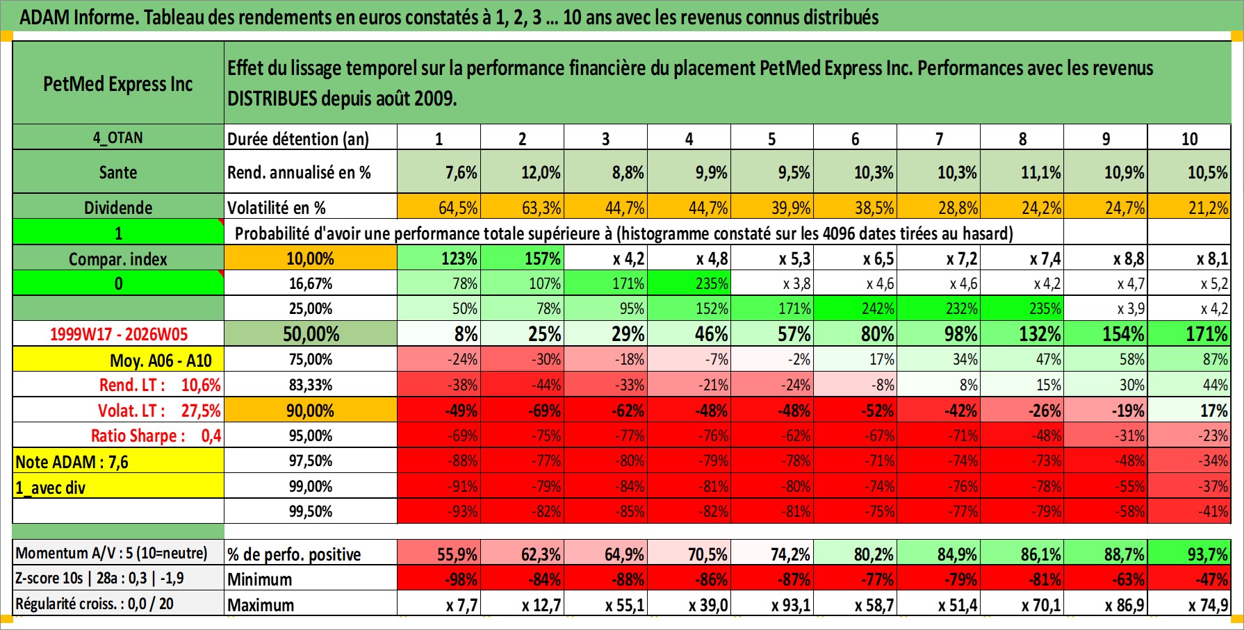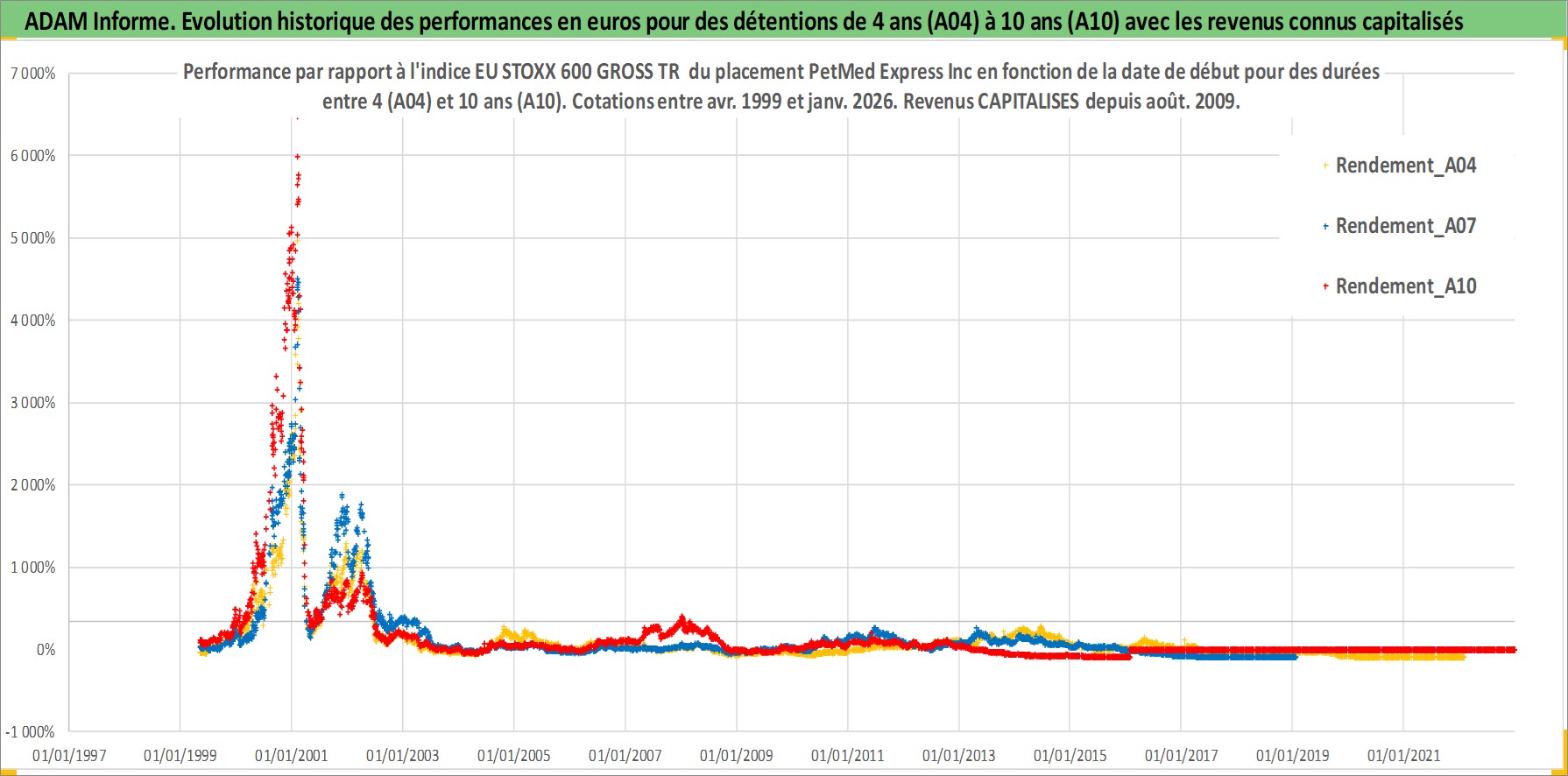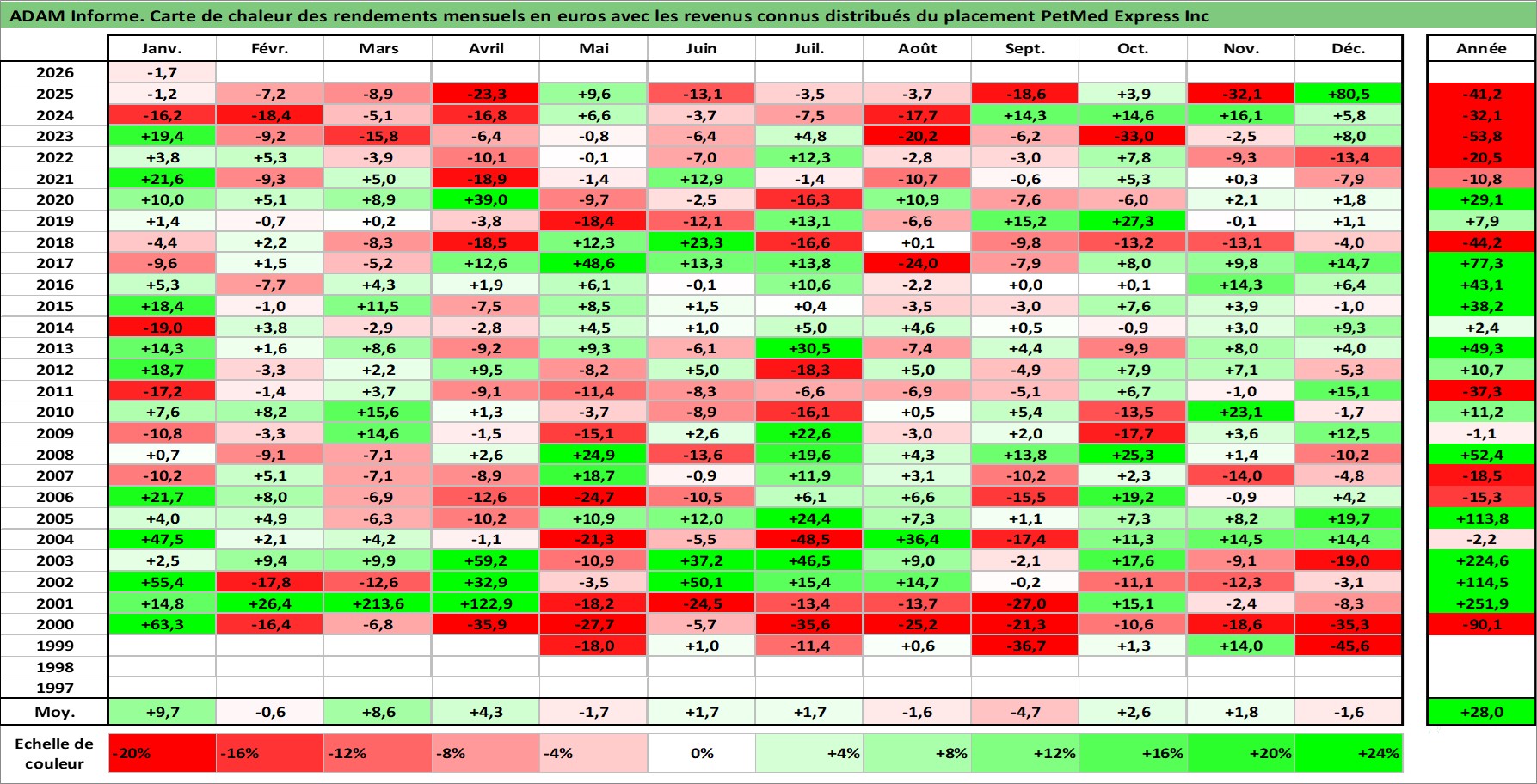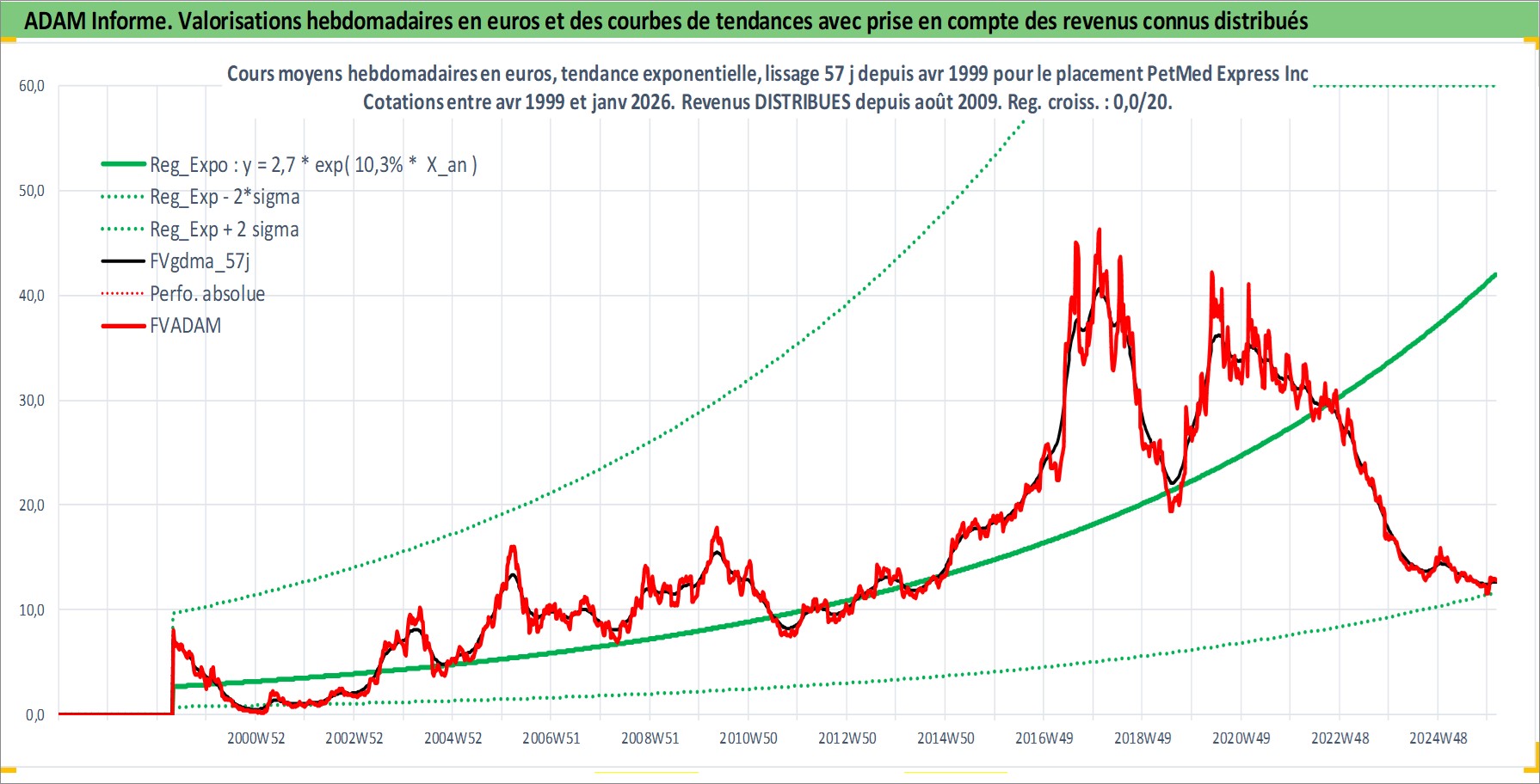 Site dédié aux investisseursPage dédiée sur site financeAnalyse des valorisations hebdomadaires de l'action PetMed Express Inc. Cet actif est cote en USD. Les valorisations sont en contrevaleur EURO et couvrent les semaines 1999W17 a 2026W05. Les revenus de cet actif financier sont pris en compte depuis la semaine 2009W33. La note ESG de cet actif n'est pas connue.