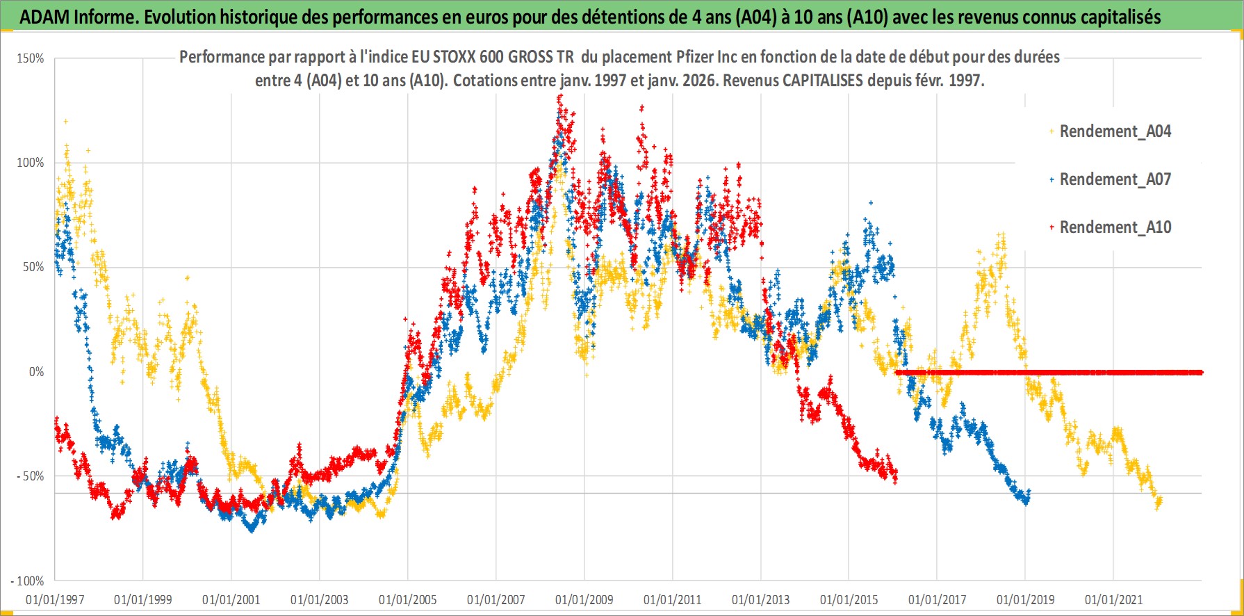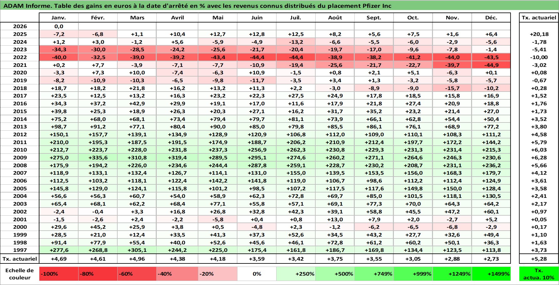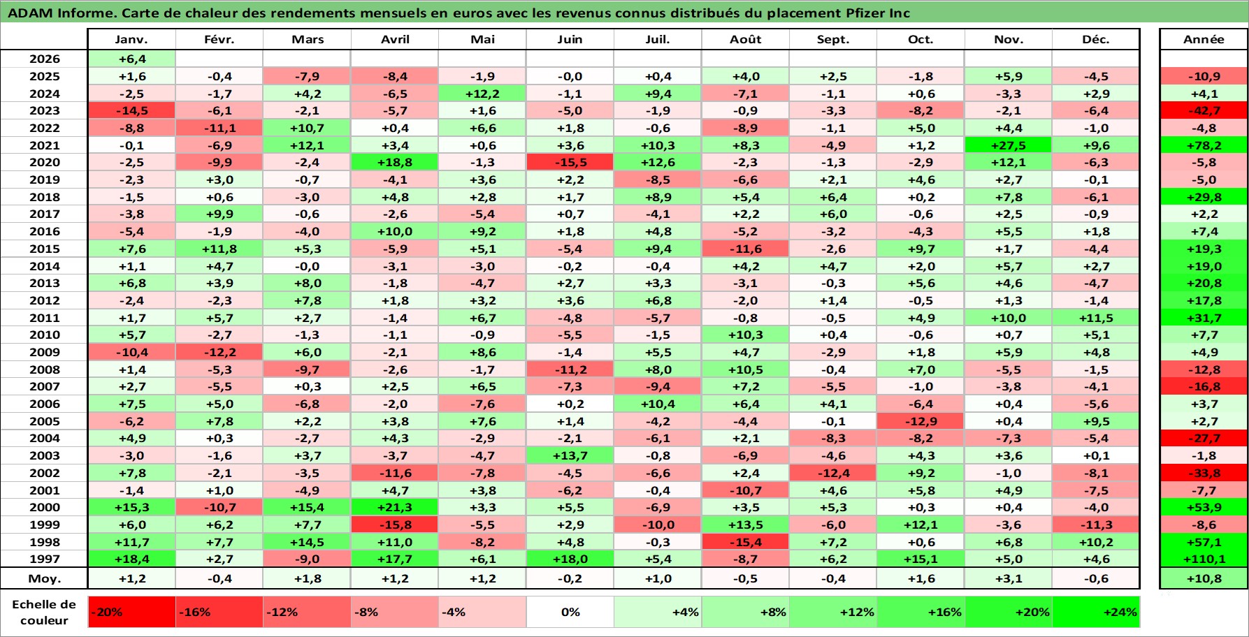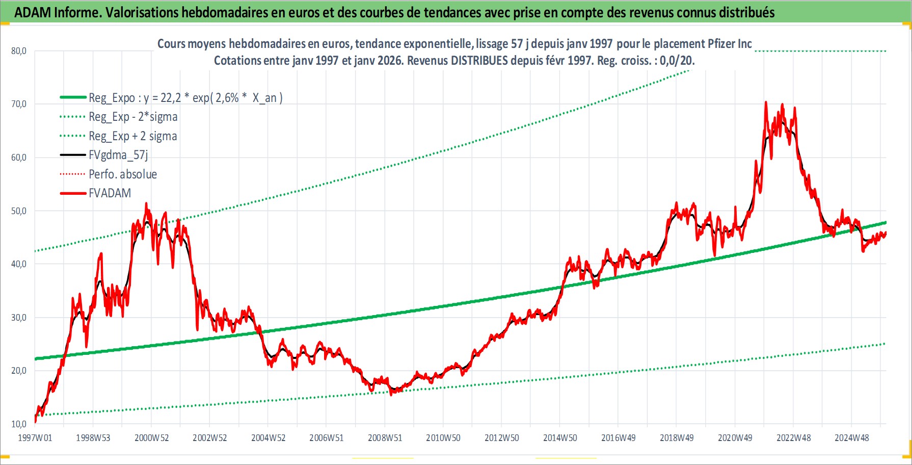 Site dédié aux investisseursPage dédiée sur site financeAnalyse des valorisations hebdomadaires de l'action Pfizer Inc. Cet actif est cote en USD. Les valorisations sont en contrevaleur EURO et couvrent les semaines 1997W01 a 2026W05. Les revenus de cet actif financier sont pris en compte depuis la semaine 1997W06. La note globale ESG de cet actif est estimee a 7.0 (apres rebasage entre 0 et 20).