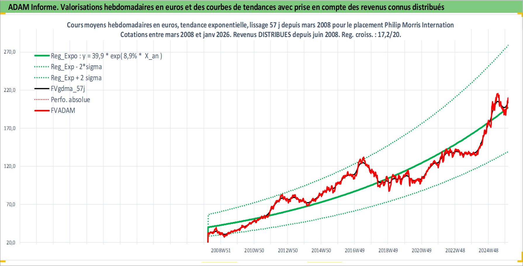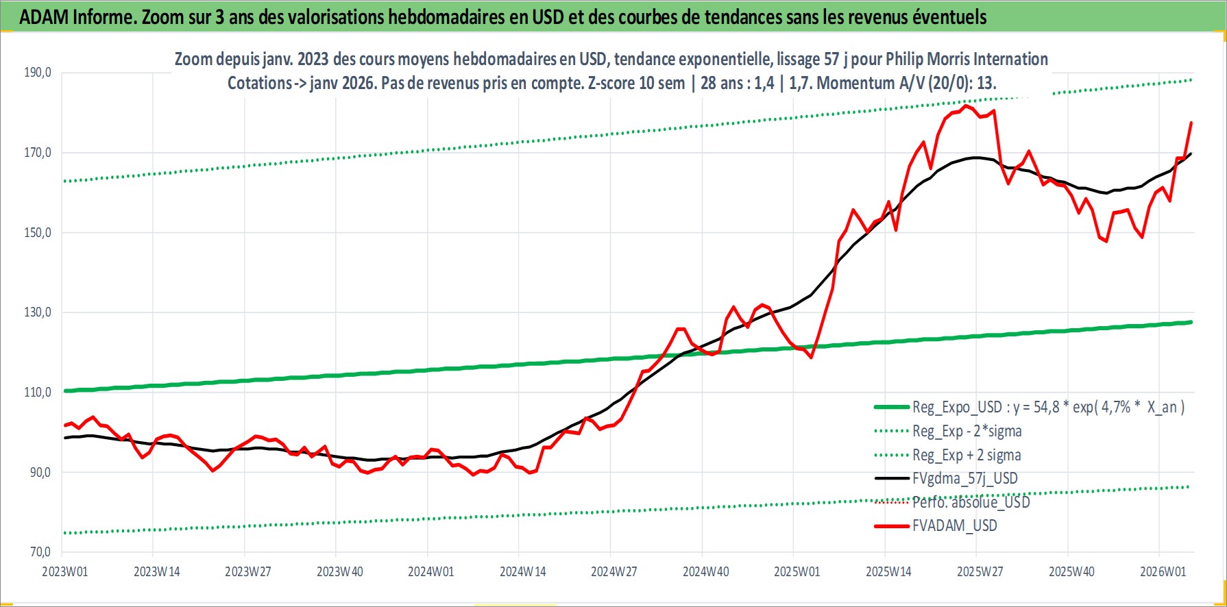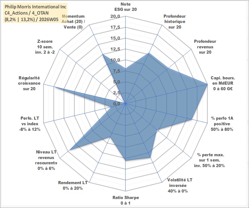 Site dédié aux investisseursPage dédiée sur site financeAnalyse des valorisations hebdomadaires de l'action Philip Morris International Inc. Cet actif est cote en USD. Les valorisations sont en contrevaleur EURO et couvrent les semaines 2008W12 a 2026W05. Les revenus de cet actif financier sont pris en compte depuis la semaine 2008W26. La note globale ESG de cet actif est estimee a 8.0 (apres rebasage entre 0 et 20).