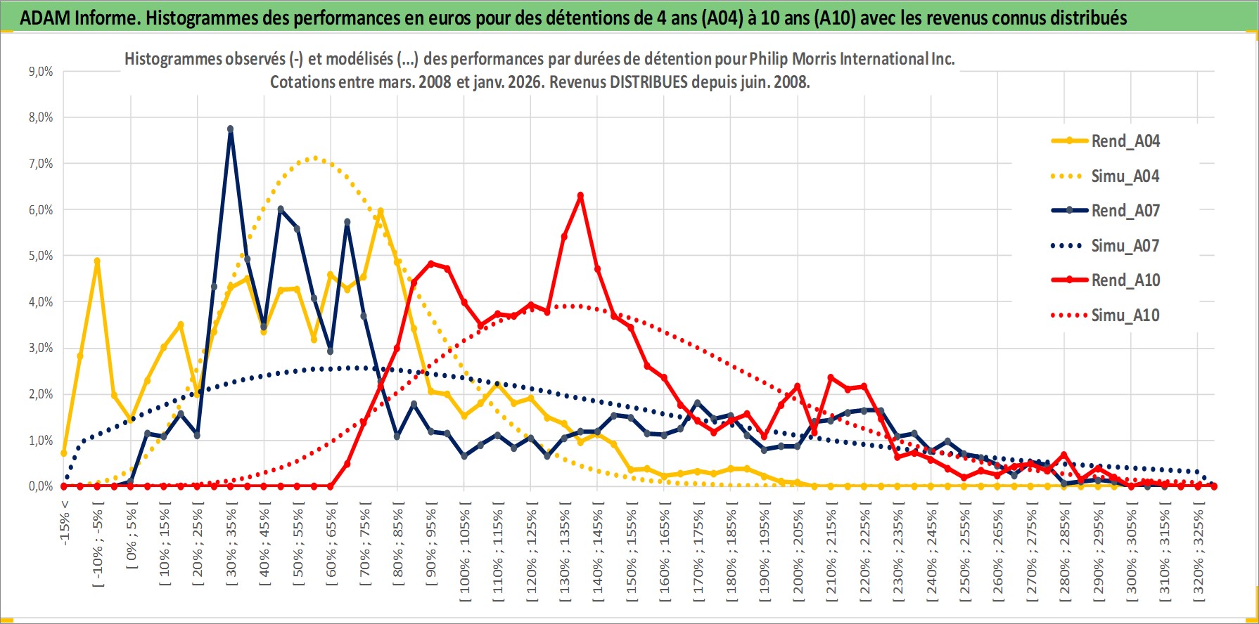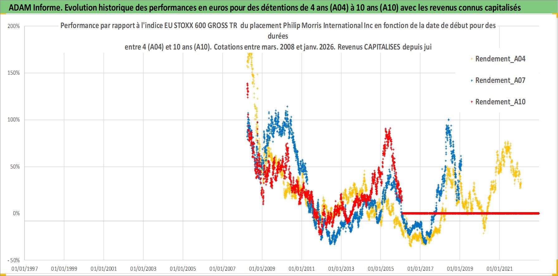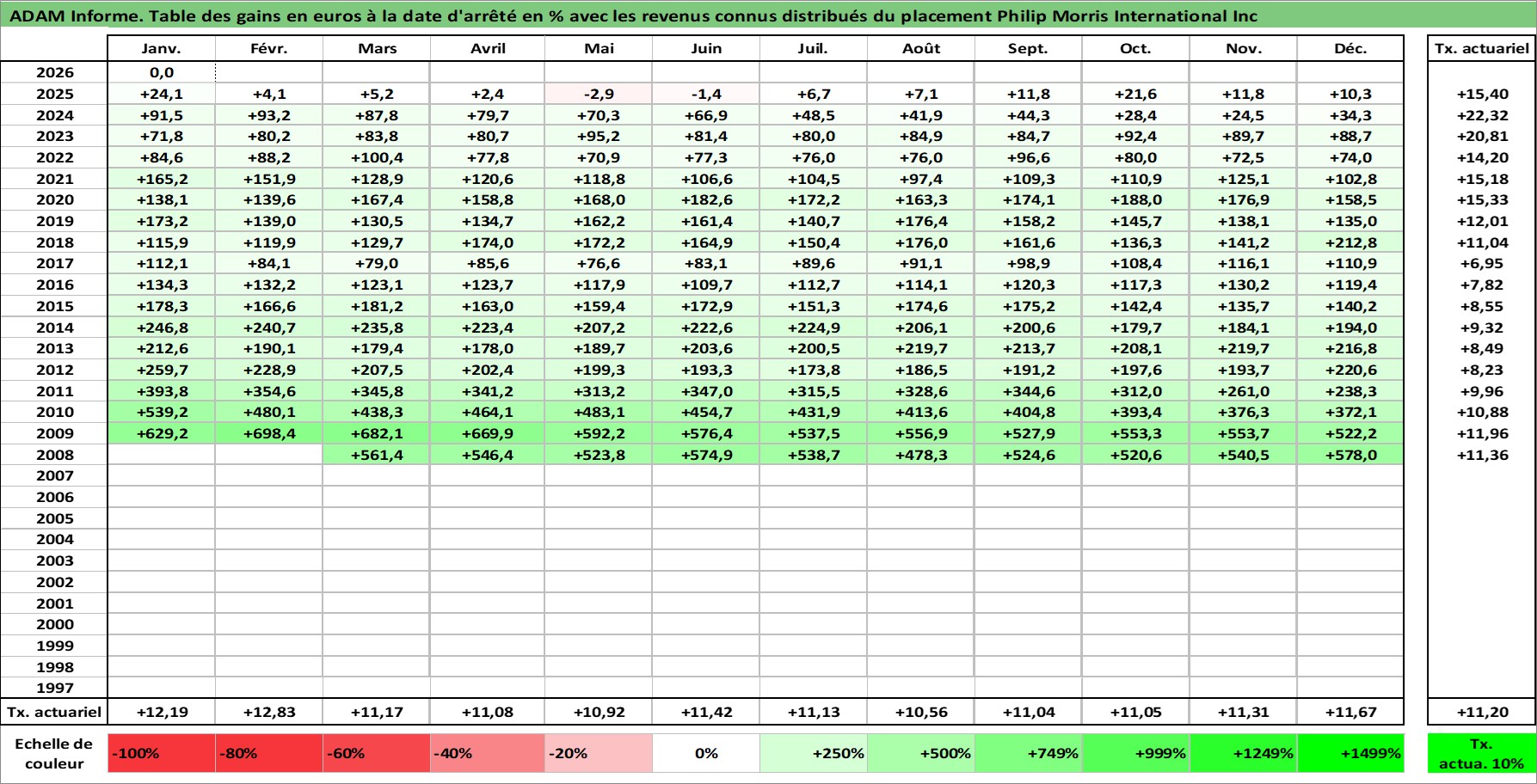 Site dédié aux investisseursPage dédiée sur site financeAnalyse des valorisations hebdomadaires de l'action Philip Morris International Inc. Cet actif est cote en USD. Les valorisations sont en contrevaleur EURO et couvrent les semaines 2008W12 a 2026W05. Les revenus de cet actif financier sont pris en compte depuis la semaine 2008W26. La note globale ESG de cet actif est estimee a 8.0 (apres rebasage entre 0 et 20).