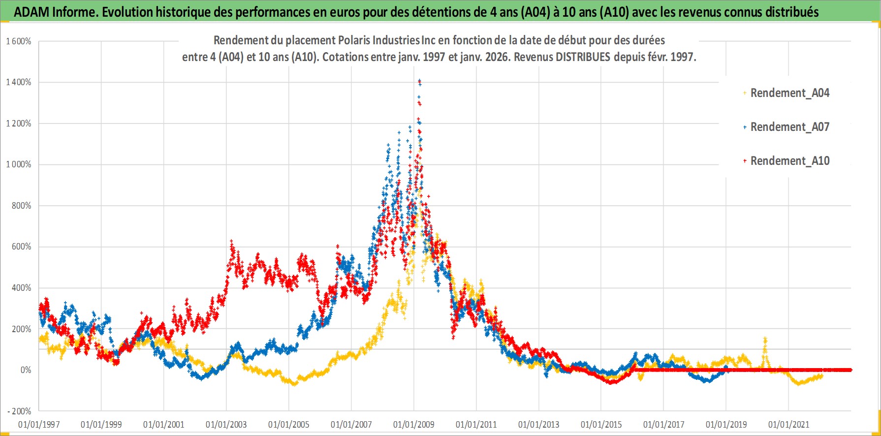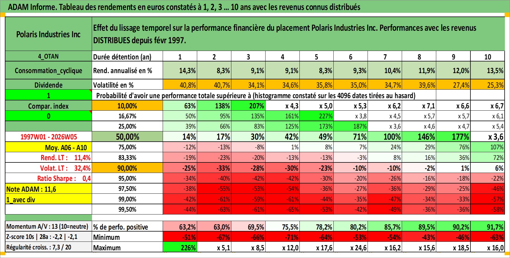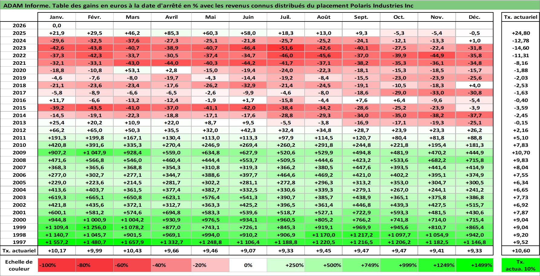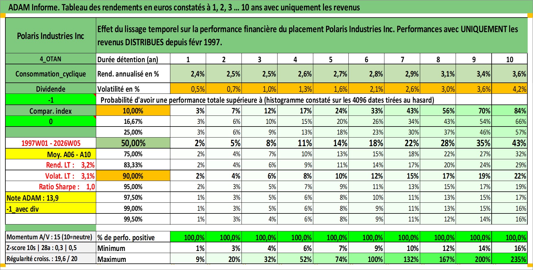 Site dédié aux investisseursPage dédiée sur site financeAnalyse des valorisations hebdomadaires de l'action Polaris Industries Inc. Cet actif est cote en USD. Les valorisations sont en contrevaleur EURO et couvrent les semaines 1997W01 a 2026W05. Les revenus de cet actif financier sont pris en compte depuis la semaine 1997W06. La note globale ESG de cet actif est estimee a 16.0 (apres rebasage entre 0 et 20).