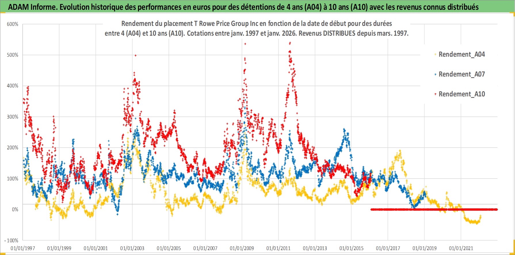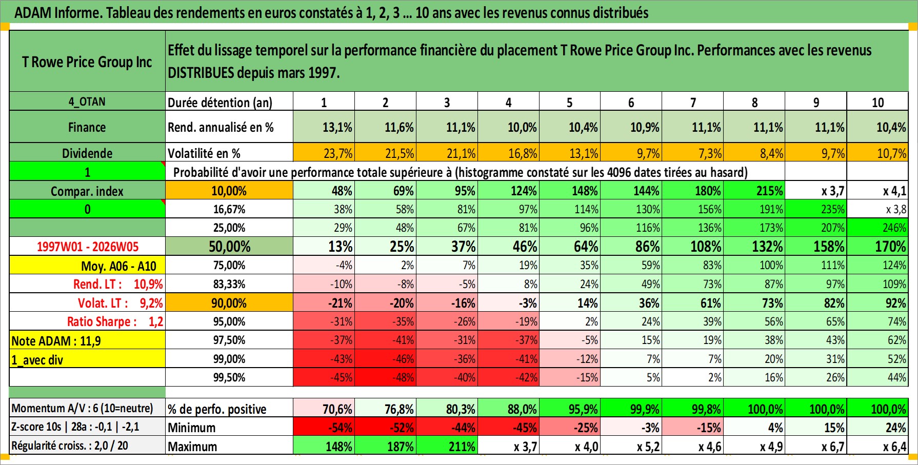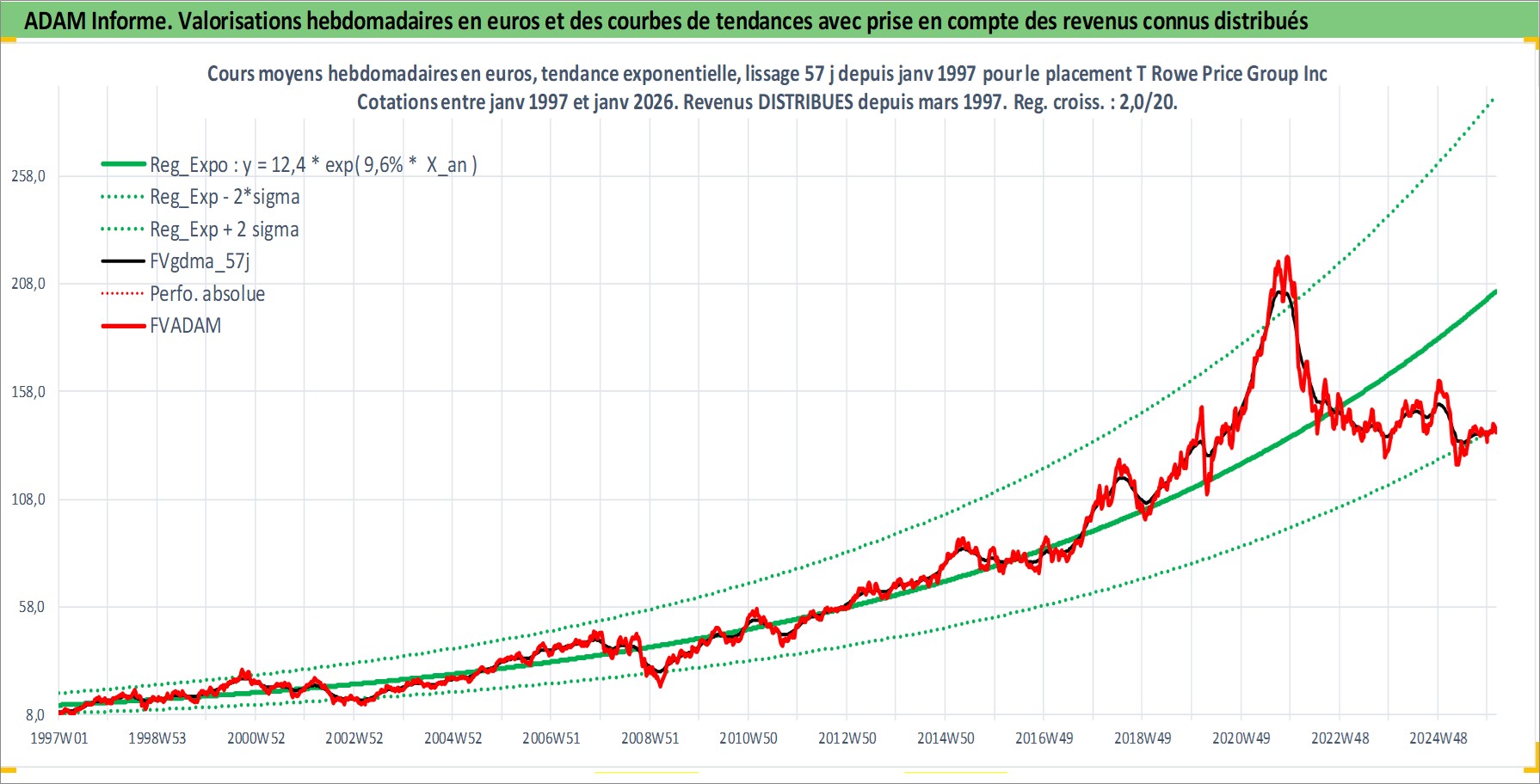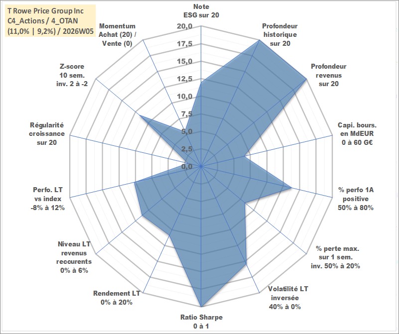 Site dédié aux investisseursPage dédiée sur site financeAnalyse des valorisations hebdomadaires de l'action T Rowe Price Group Inc. Cet actif est cote en USD. Les valorisations sont en contrevaleur EURO et couvrent les semaines 1997W01 a 2026W05. Les revenus de cet actif financier sont pris en compte depuis la semaine 1997W12. La note globale ESG de cet actif est estimee a 12.0 (apres rebasage entre 0 et 20).