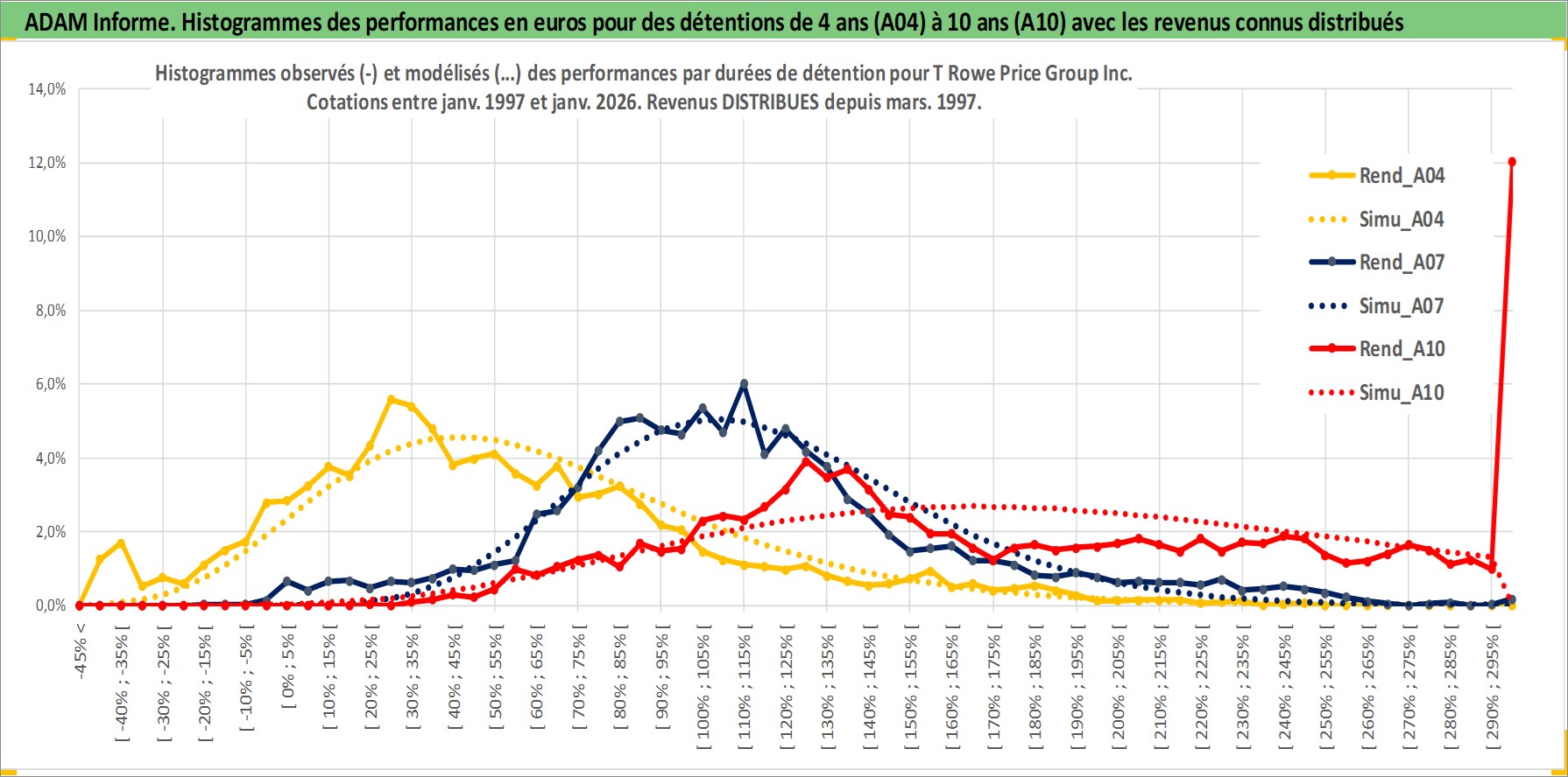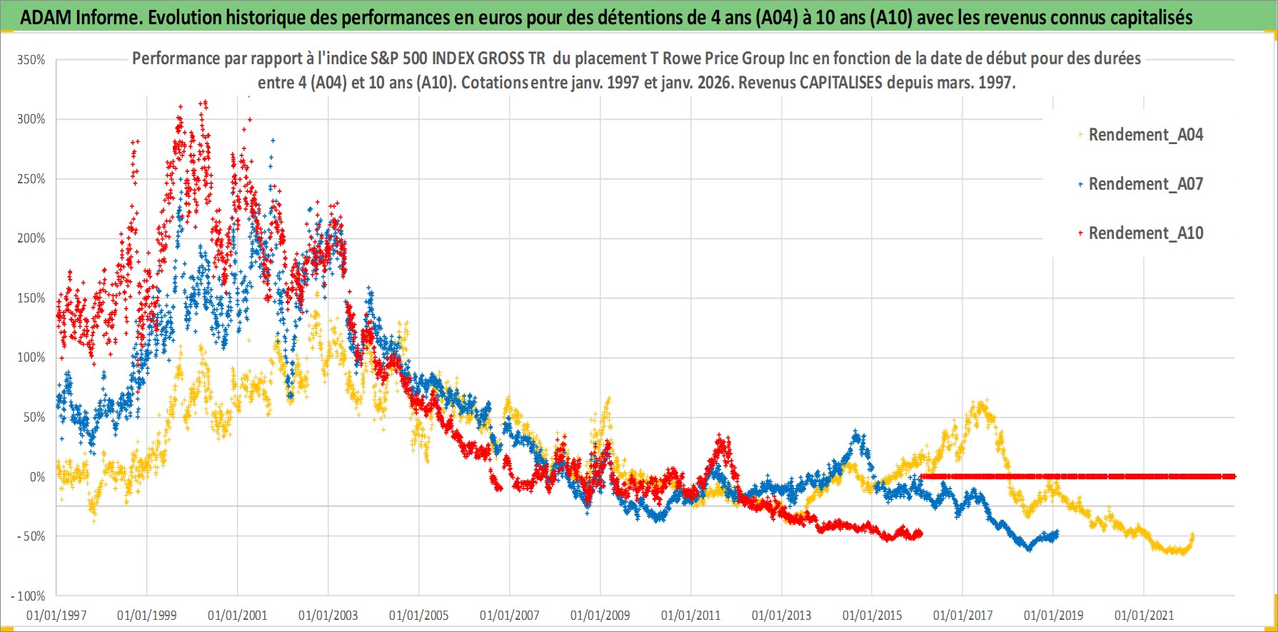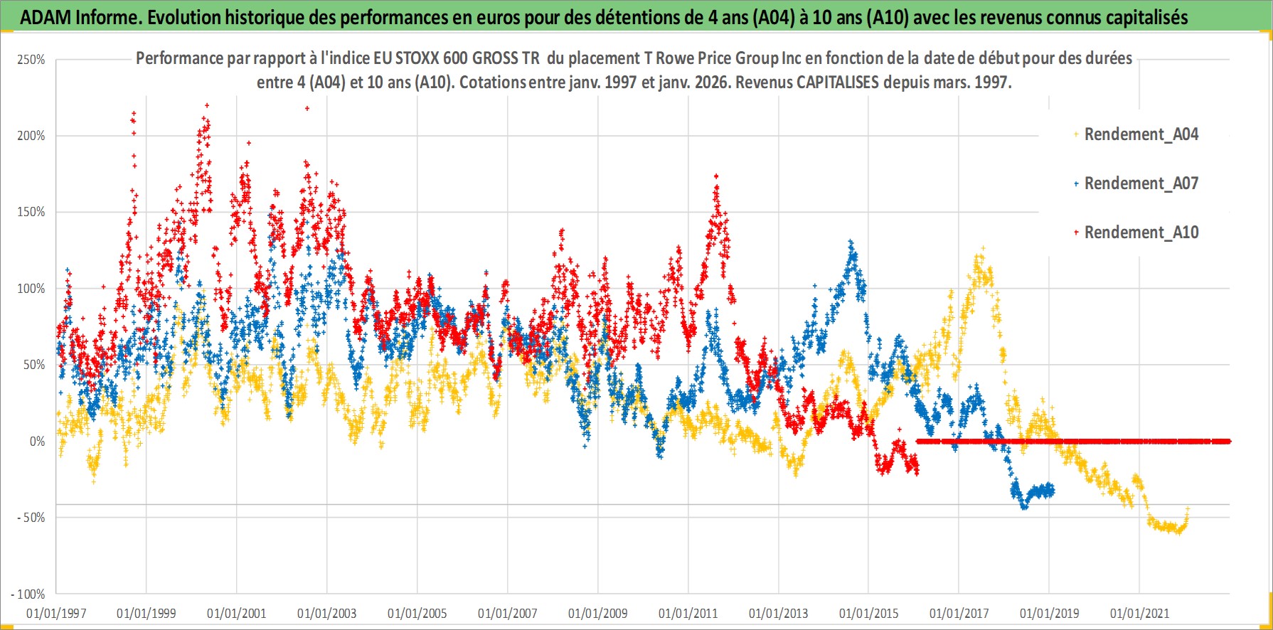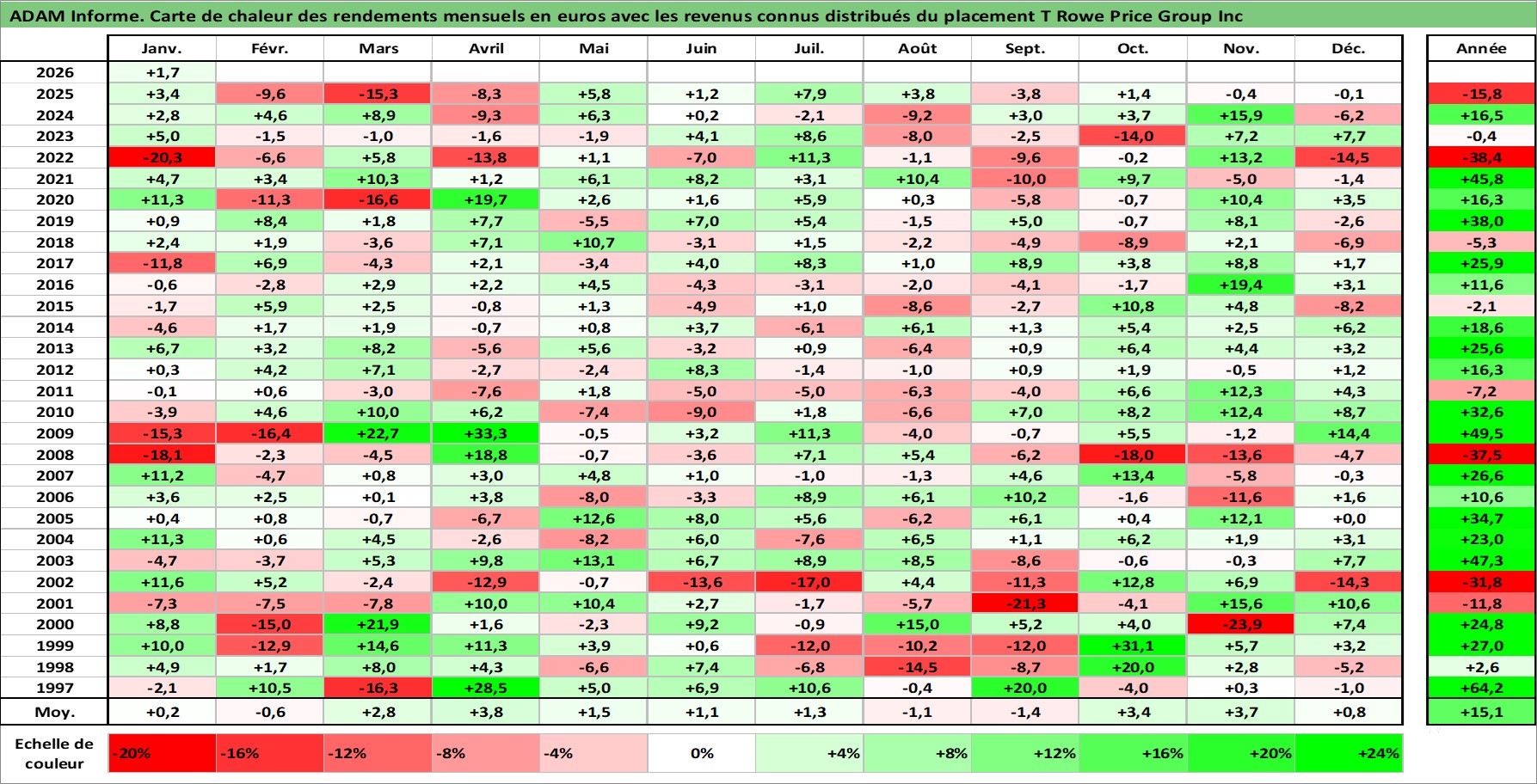 Site dédié aux investisseursPage dédiée sur site financeAnalyse des valorisations hebdomadaires de l'action T Rowe Price Group Inc. Cet actif est cote en USD. Les valorisations sont en contrevaleur EURO et couvrent les semaines 1997W01 a 2026W05. Les revenus de cet actif financier sont pris en compte depuis la semaine 1997W12. La note globale ESG de cet actif est estimee a 12.0 (apres rebasage entre 0 et 20).