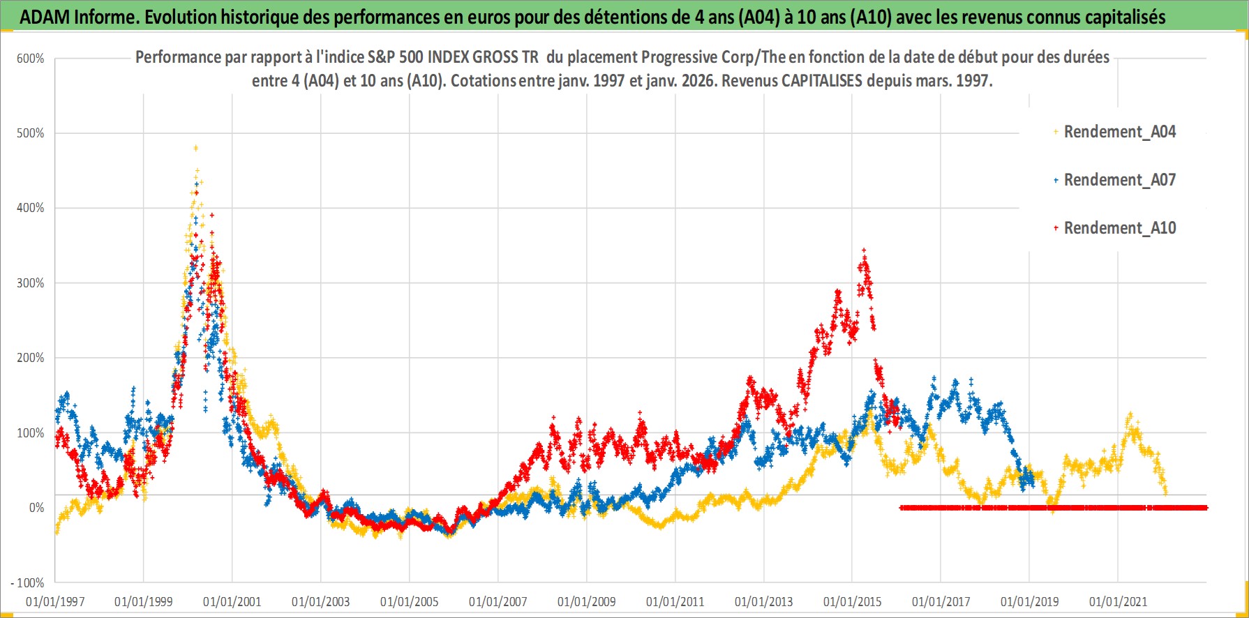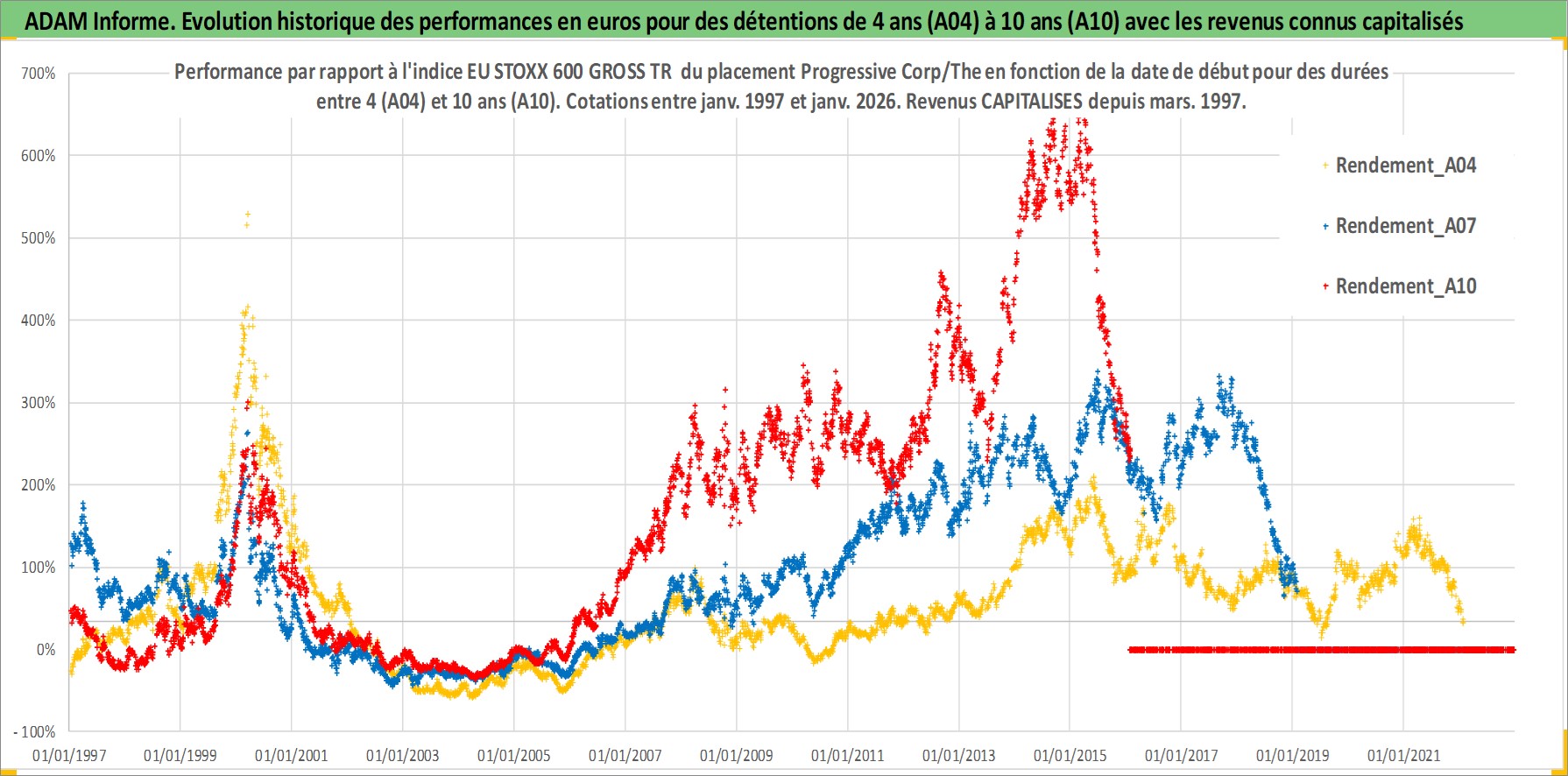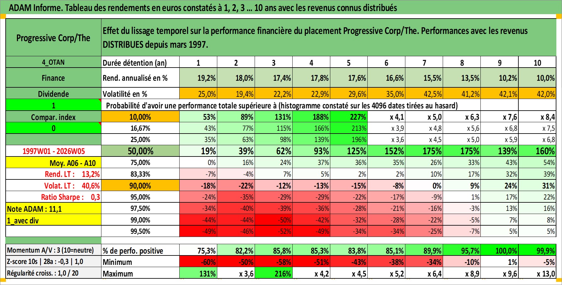 Site dédié aux investisseursPage dédiée sur site financeAnalyse des valorisations hebdomadaires de l'action Progressive Corp/The. Cet actif est cote en USD. Les valorisations sont en contrevaleur EURO et couvrent les semaines 1997W01 a 2026W05. Les revenus de cet actif financier sont pris en compte depuis la semaine 1997W11. La note globale ESG de cet actif est estimee a 10.0 (apres rebasage entre 0 et 20).