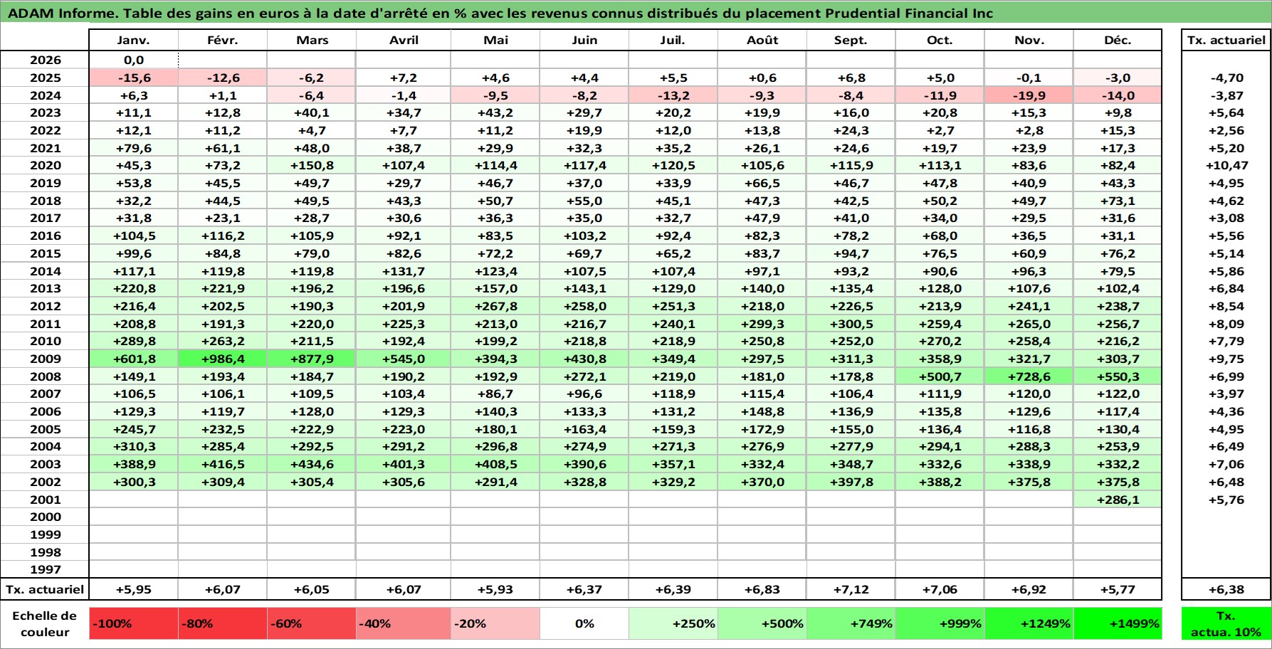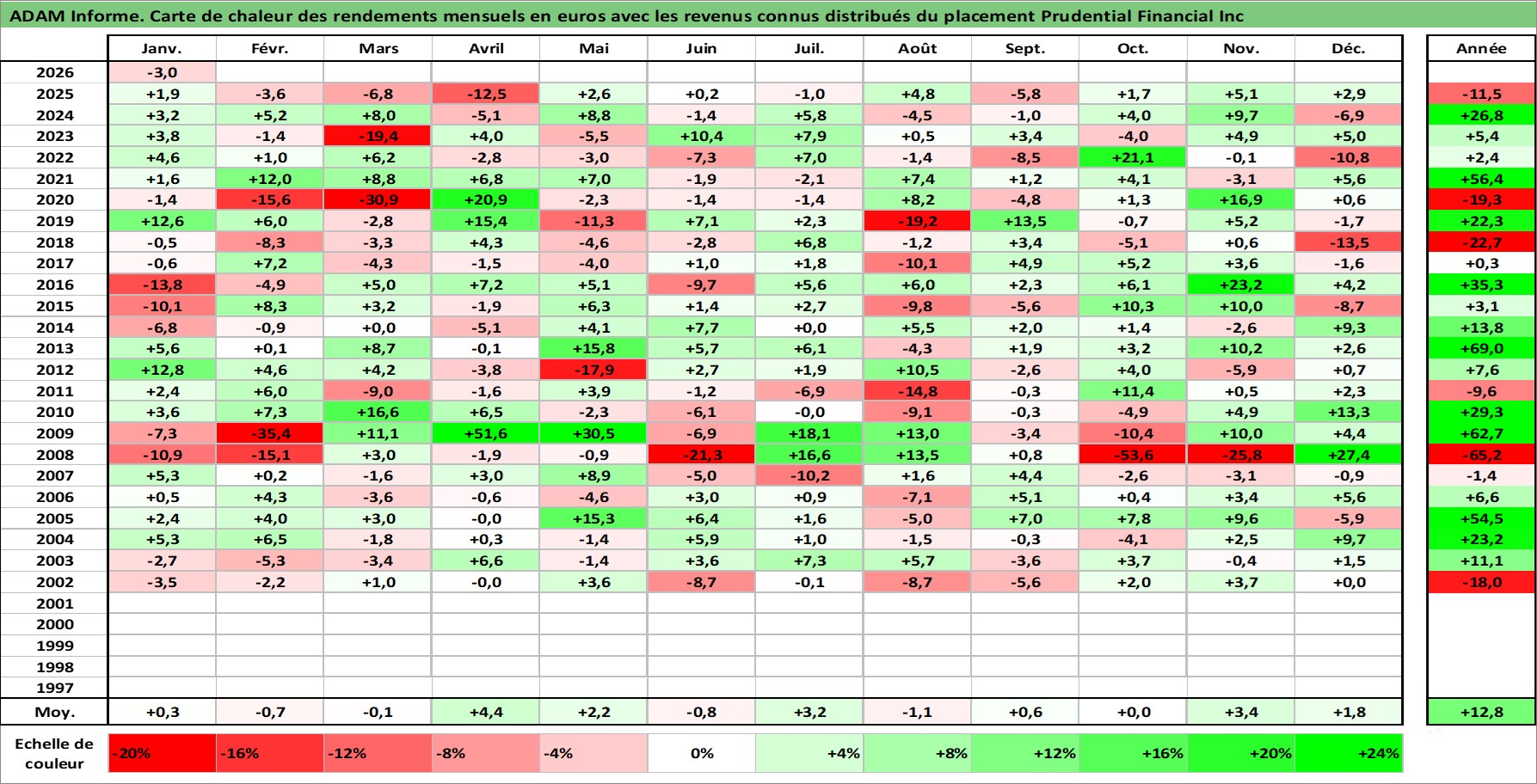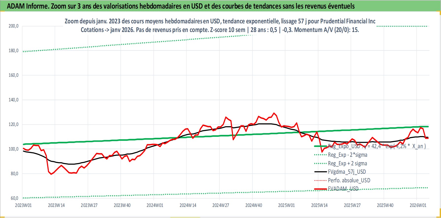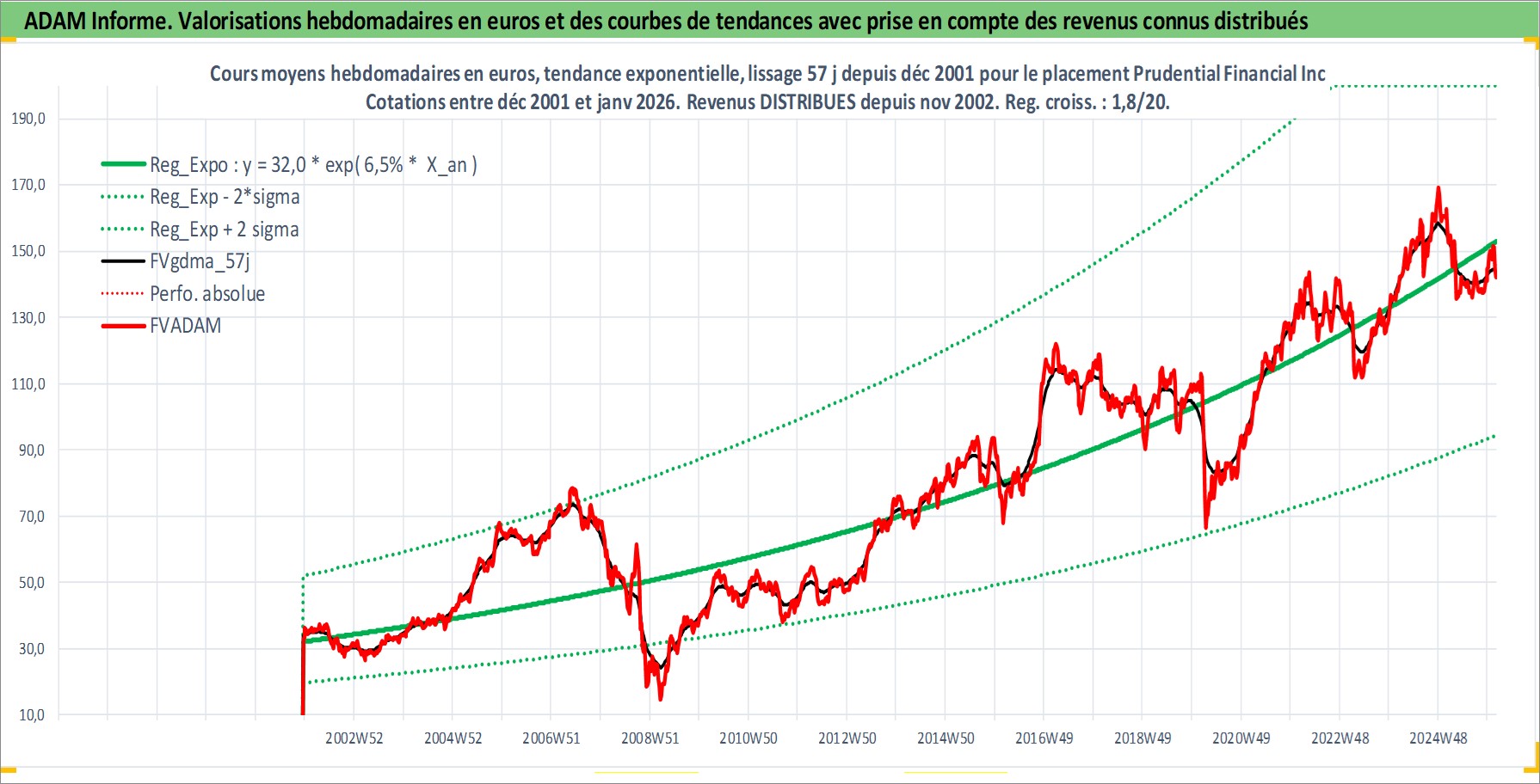 Site dédié aux investisseursPage dédiée sur site financeAnalyse des valorisations hebdomadaires de l'action Prudential Financial Inc. Cet actif est cote en USD. Les valorisations sont en contrevaleur EURO et couvrent les semaines 2001W50 a 2026W05. Les revenus de cet actif financier sont pris en compte depuis la semaine 2002W47. La note globale ESG de cet actif est estimee a 13.0 (apres rebasage entre 0 et 20).