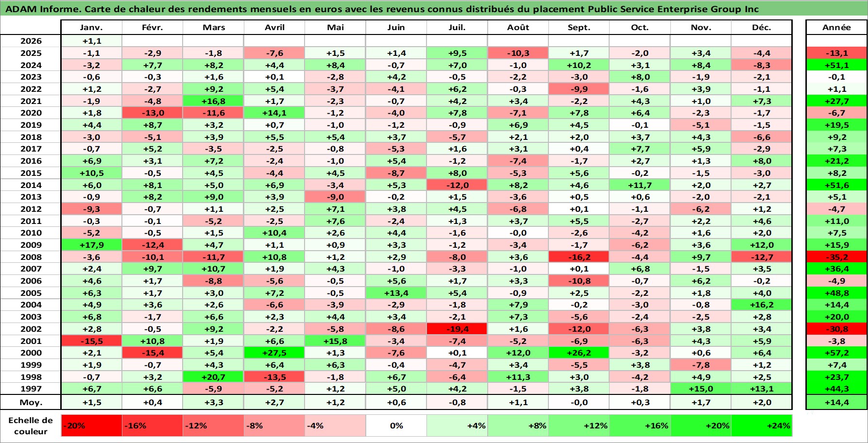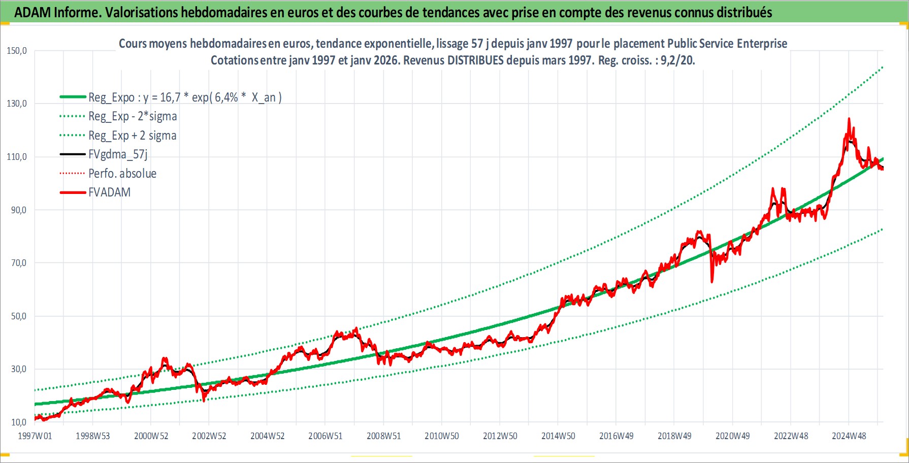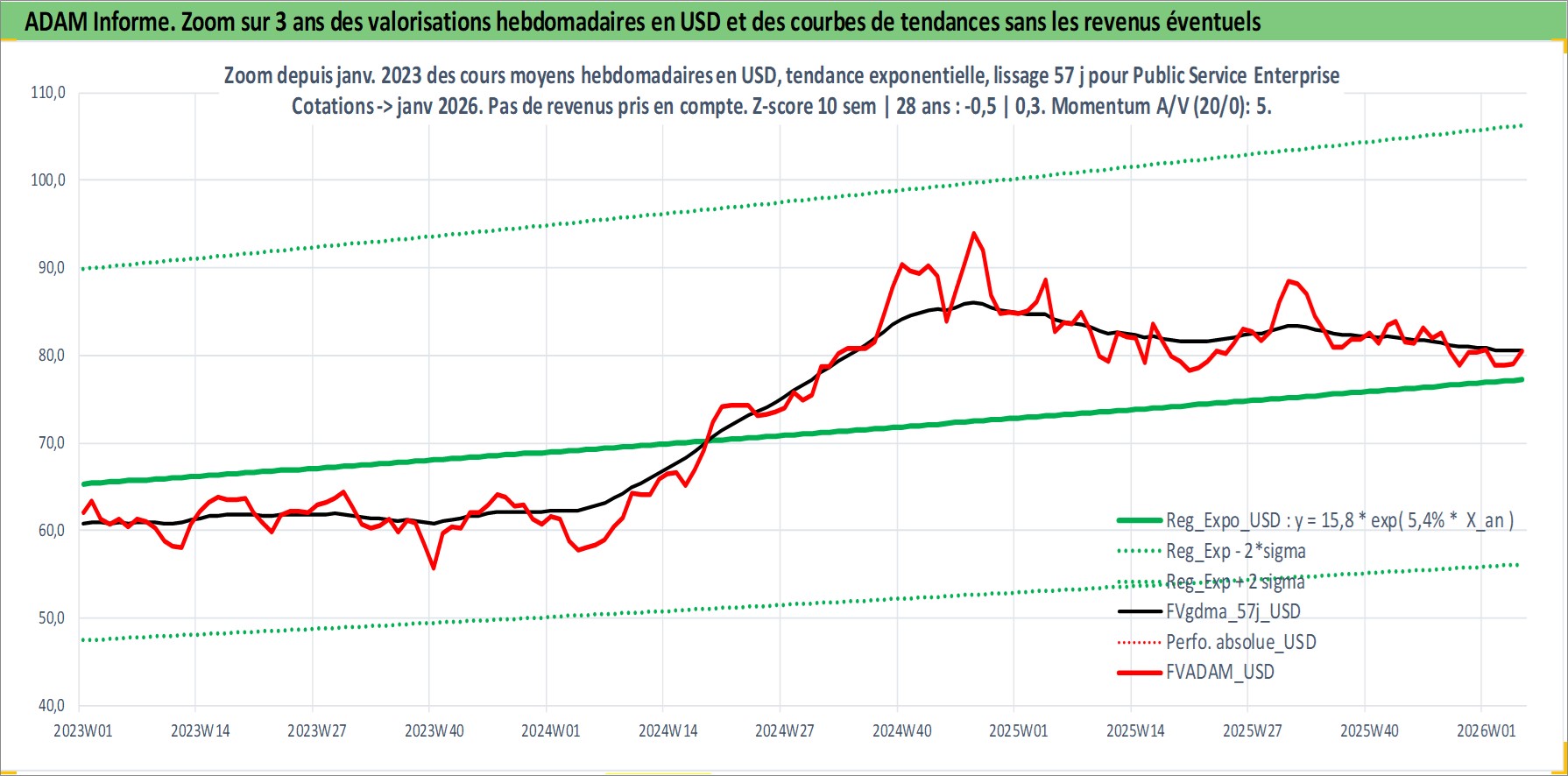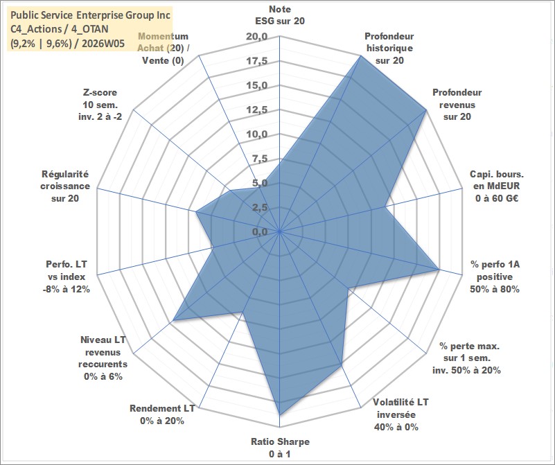 Site dédié aux investisseursPage dédiée sur site financeAnalyse des valorisations hebdomadaires de l'action Public Service Enterprise Group Inc. Cet actif est cote en USD. Les valorisations sont en contrevaleur EURO et couvrent les semaines 1997W01 a 2026W05. Les revenus de cet actif financier sont pris en compte depuis la semaine 1997W10. La note globale ESG de cet actif est estimee a 7.0 (apres rebasage entre 0 et 20).