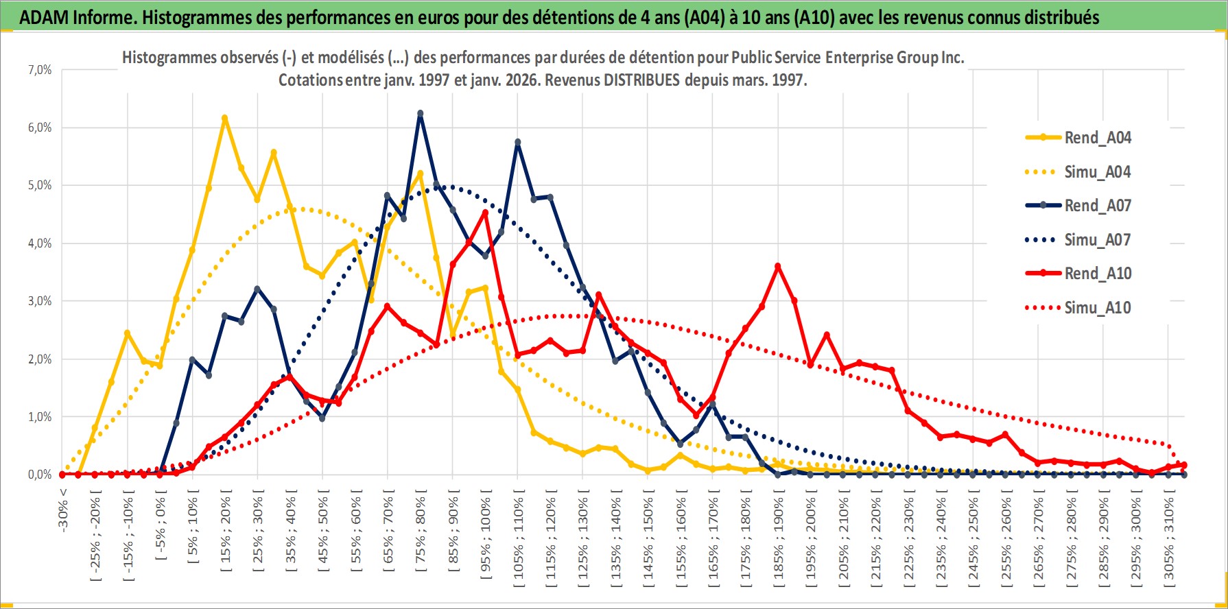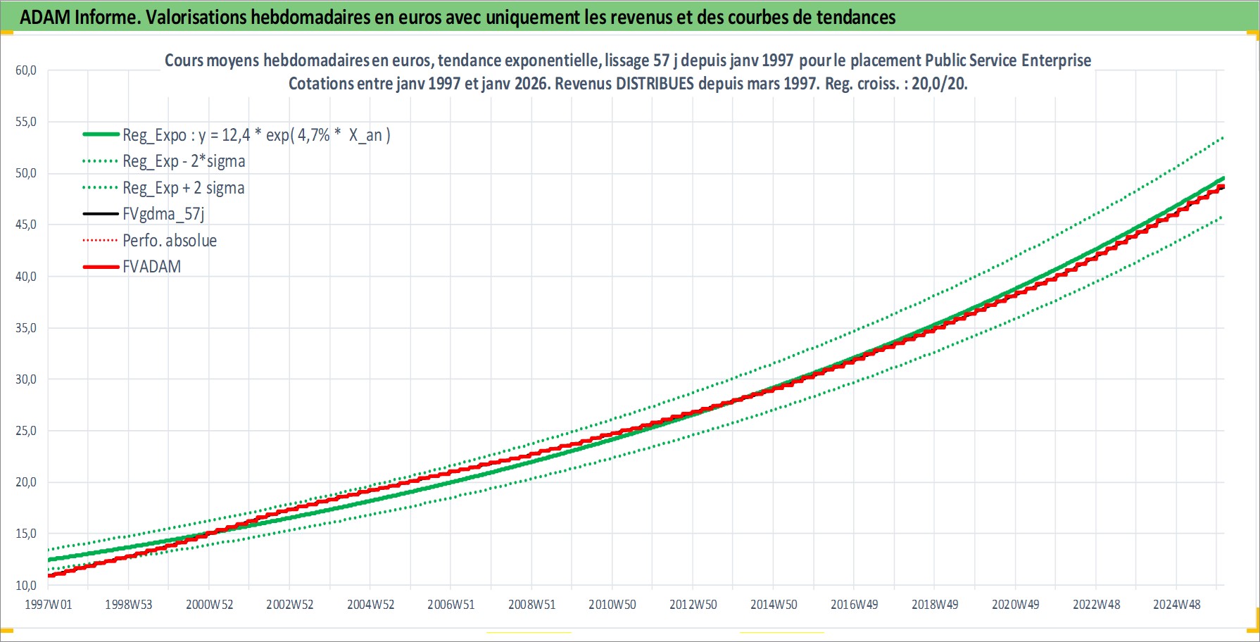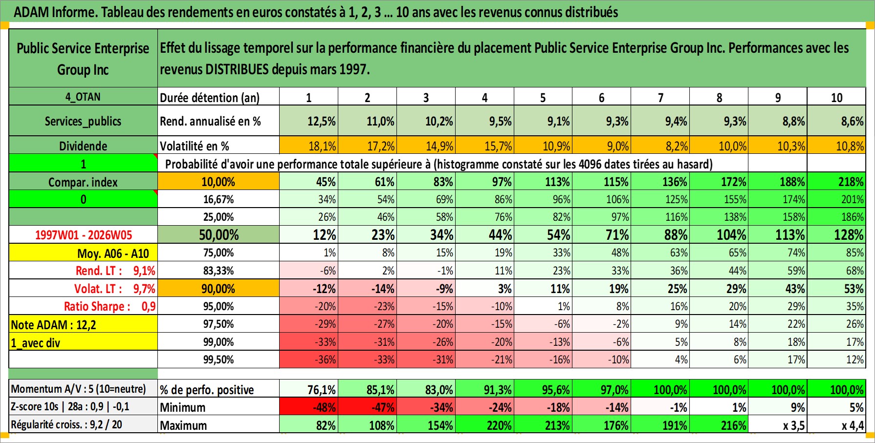 Site dédié aux investisseursPage dédiée sur site financeAnalyse des valorisations hebdomadaires de l'action Public Service Enterprise Group Inc. Cet actif est cote en USD. Les valorisations sont en contrevaleur EURO et couvrent les semaines 1997W01 a 2026W05. Les revenus de cet actif financier sont pris en compte depuis la semaine 1997W10. La note globale ESG de cet actif est estimee a 7.0 (apres rebasage entre 0 et 20).
