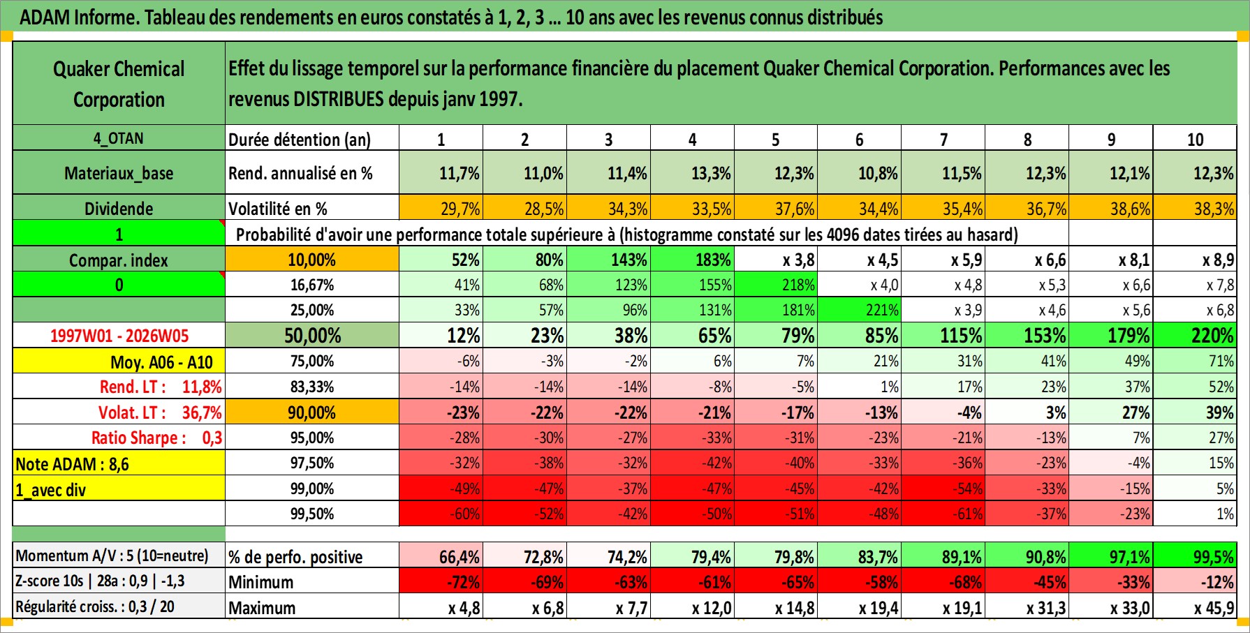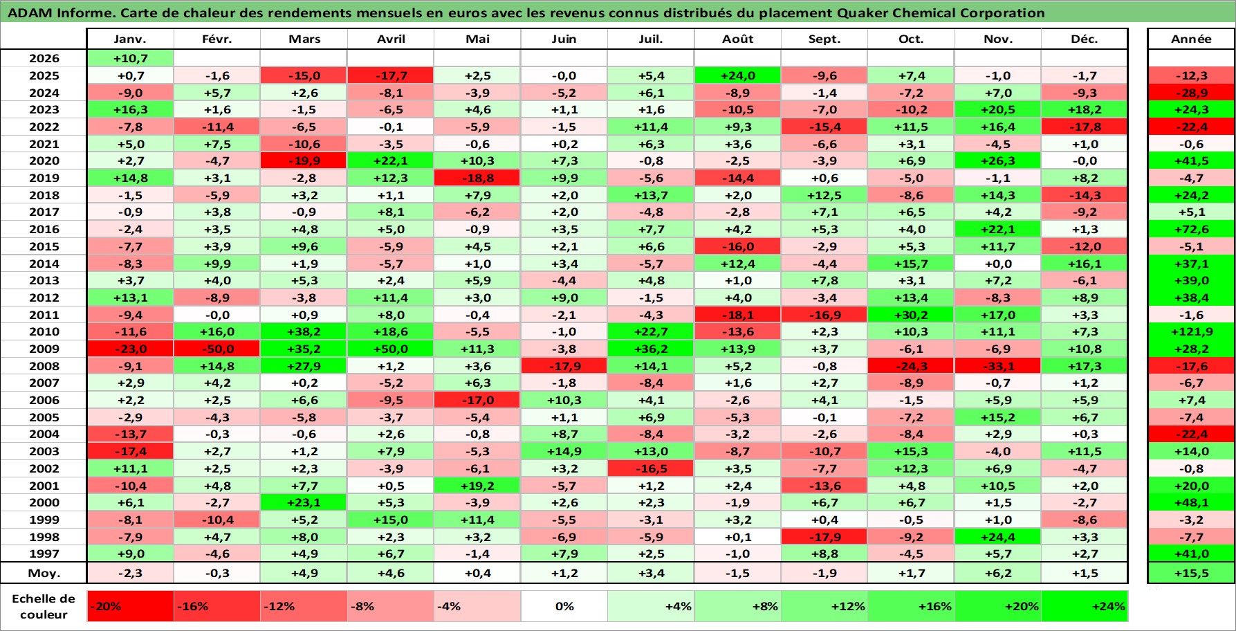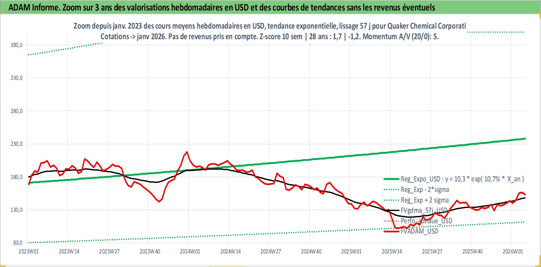 Site dédié aux investisseursPage dédiée sur site financeAnalyse des valorisations hebdomadaires de l'action Quaker Chemical Corporation. Cet actif est cote en USD. Les valorisations sont en contrevaleur EURO et couvrent les semaines 1997W01 a 2026W05. Les revenus de cet actif financier sont pris en compte depuis la semaine 1997W03. La note ESG de cet actif n'est pas connue.