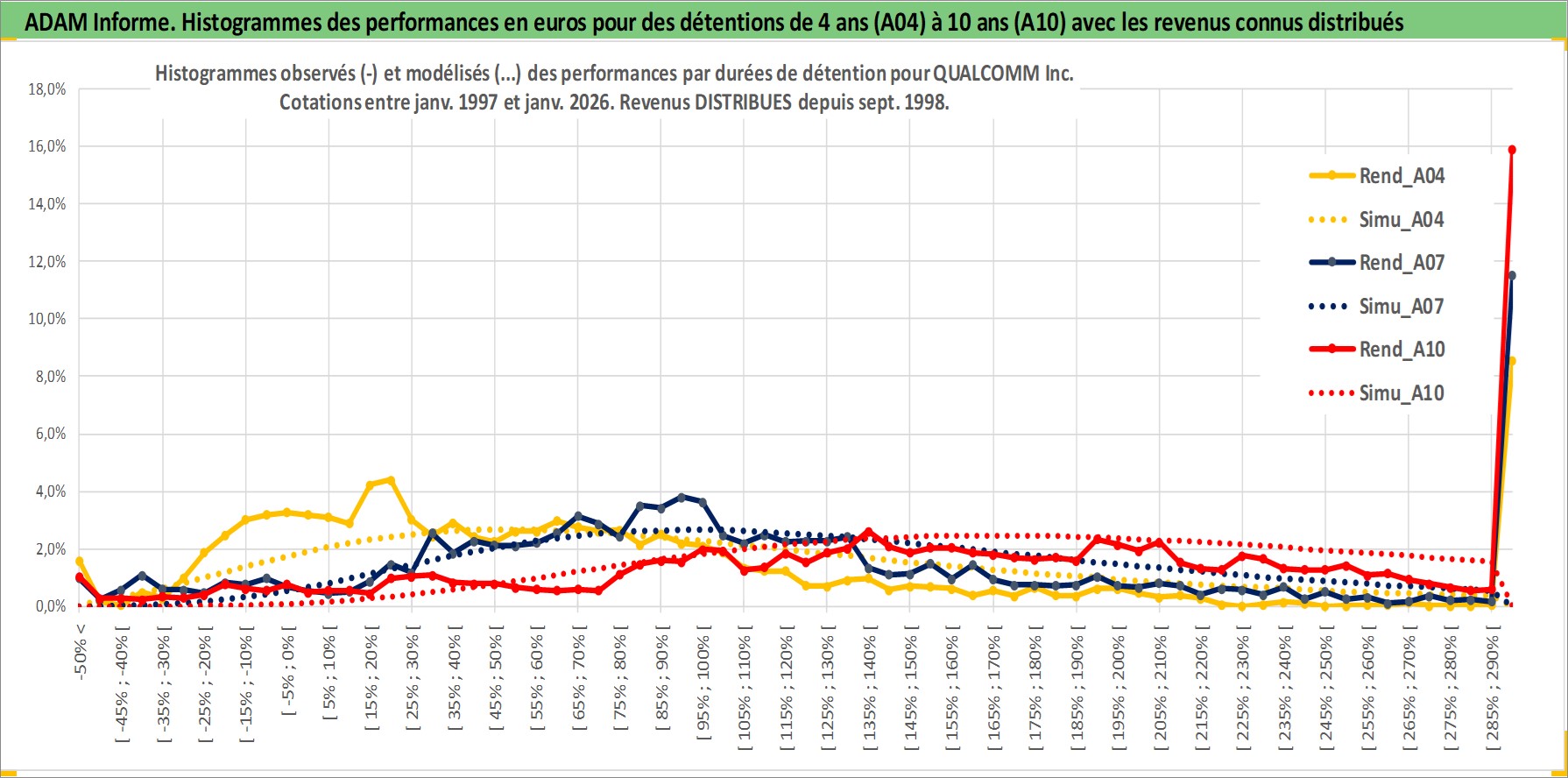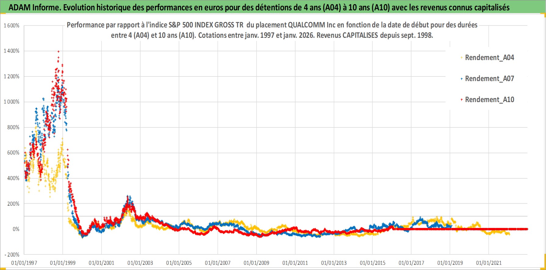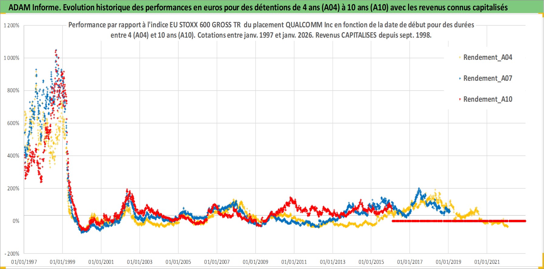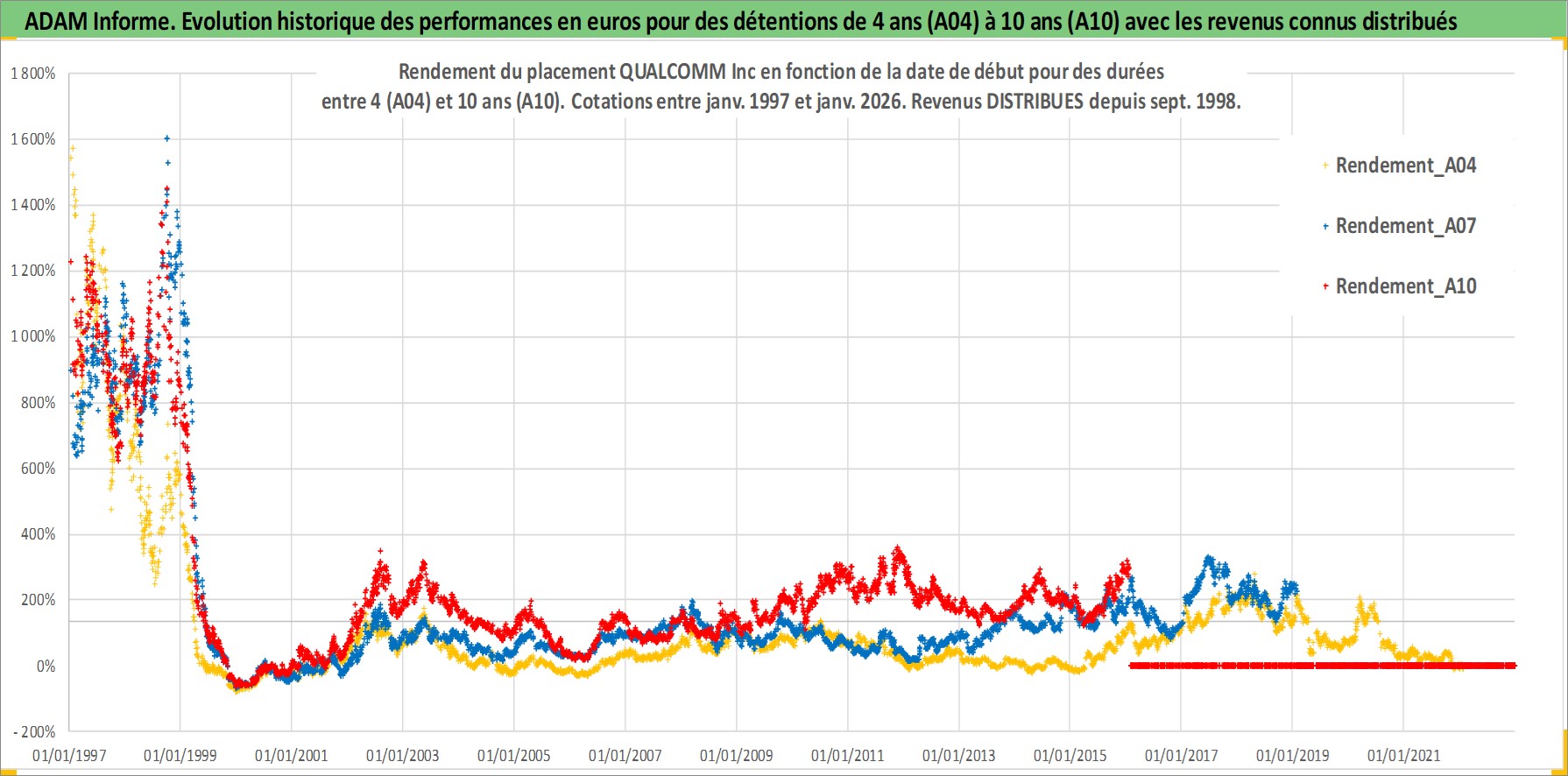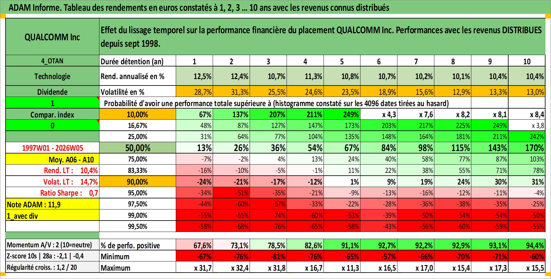 Site dédié aux investisseursPage dédiée sur site financeAnalyse des valorisations hebdomadaires de l'action QUALCOMM Inc. Cet actif est cote en USD. Les valorisations sont en contrevaleur EURO et couvrent les semaines 1997W01 a 2026W05. Les revenus de cet actif financier sont pris en compte depuis la semaine 1998W39. La note globale ESG de cet actif est estimee a 12.0 (apres rebasage entre 0 et 20).