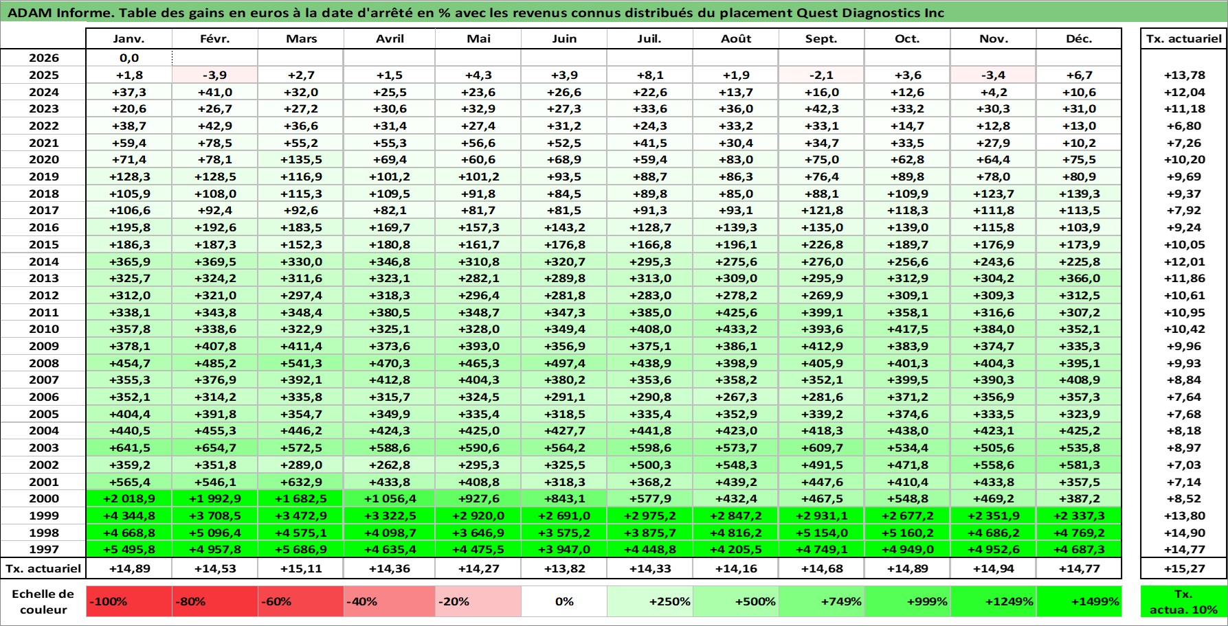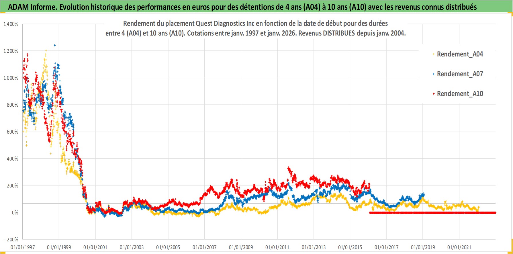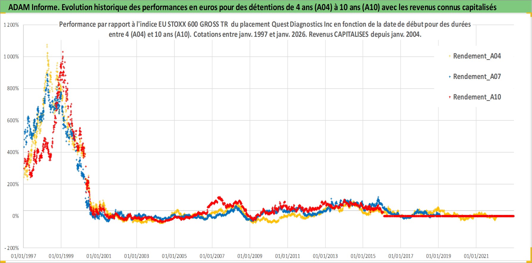 Site dédié aux investisseursPage dédiée sur site financeAnalyse des valorisations hebdomadaires de l'action Quest Diagnostics Inc. Cet actif est cote en USD. Les valorisations sont en contrevaleur EURO et couvrent les semaines 1997W01 a 2026W05. Les revenus de cet actif financier sont pris en compte depuis la semaine 2004W02. La note globale ESG de cet actif est estimee a 10.0 (apres rebasage entre 0 et 20).