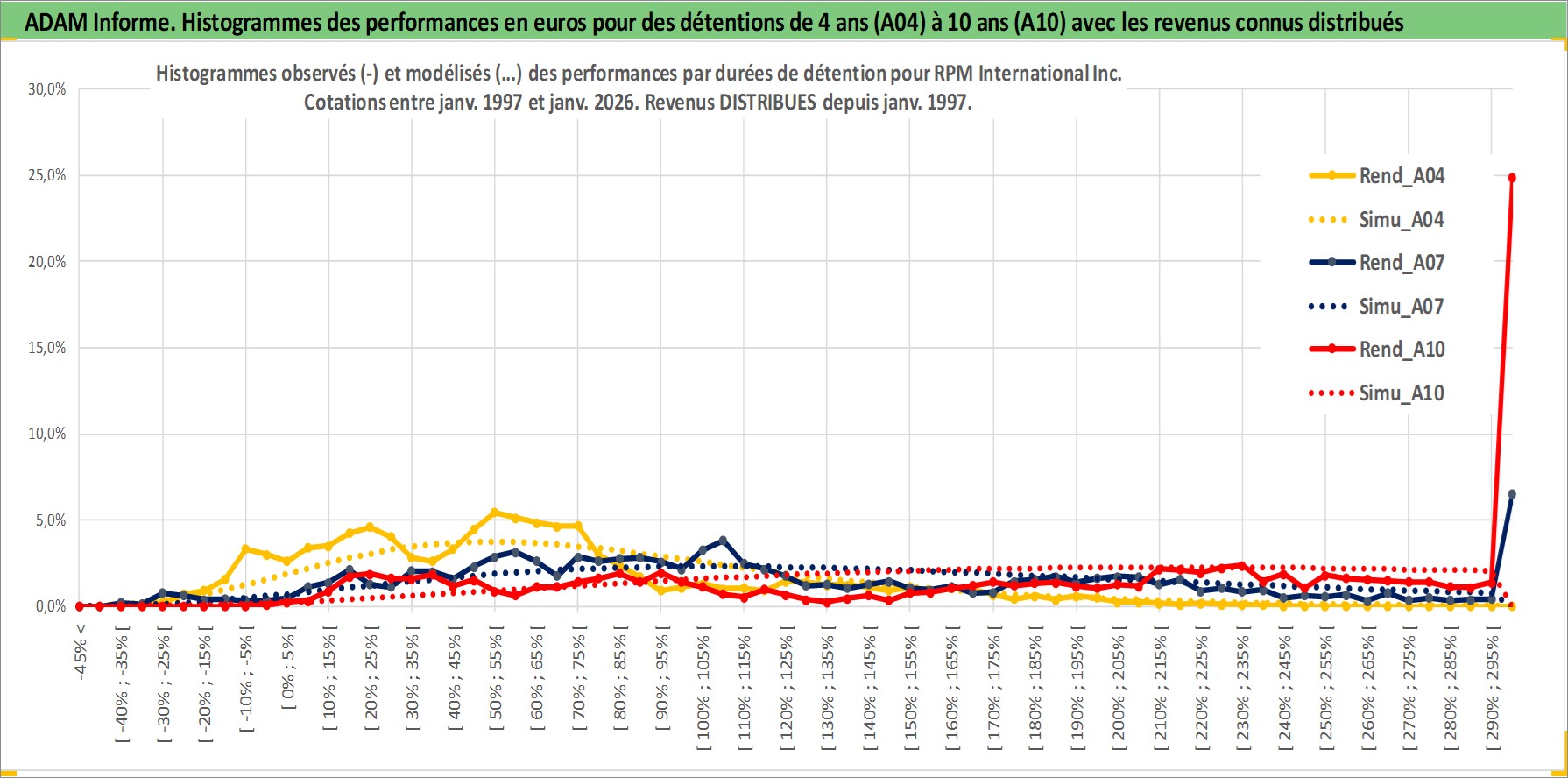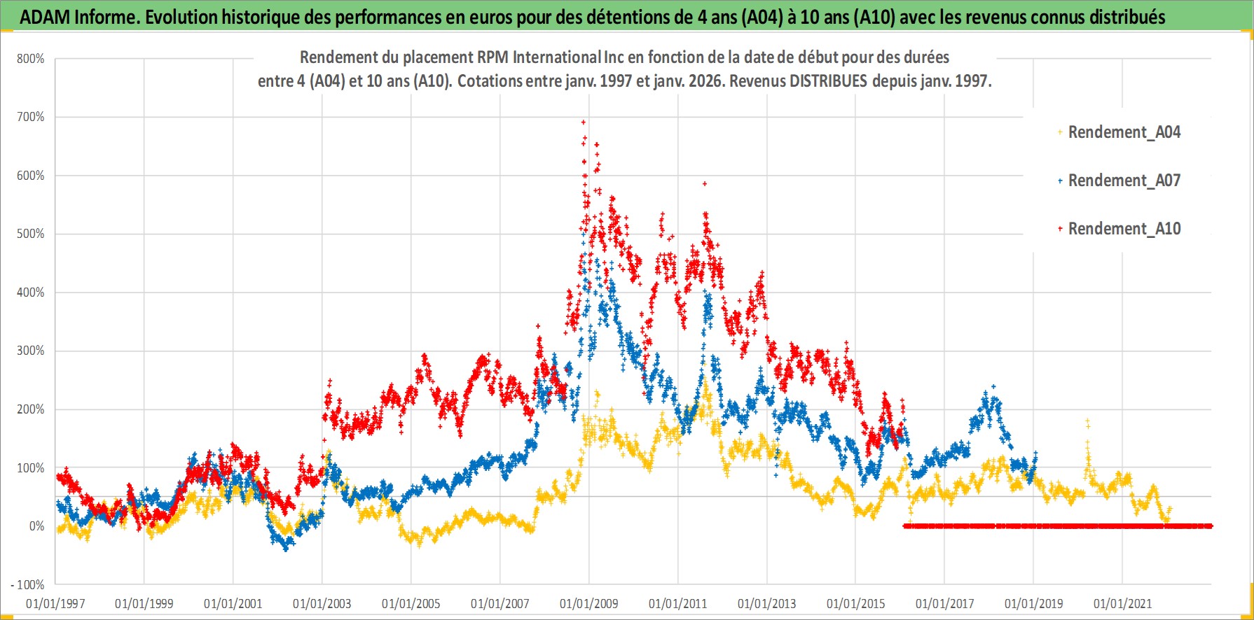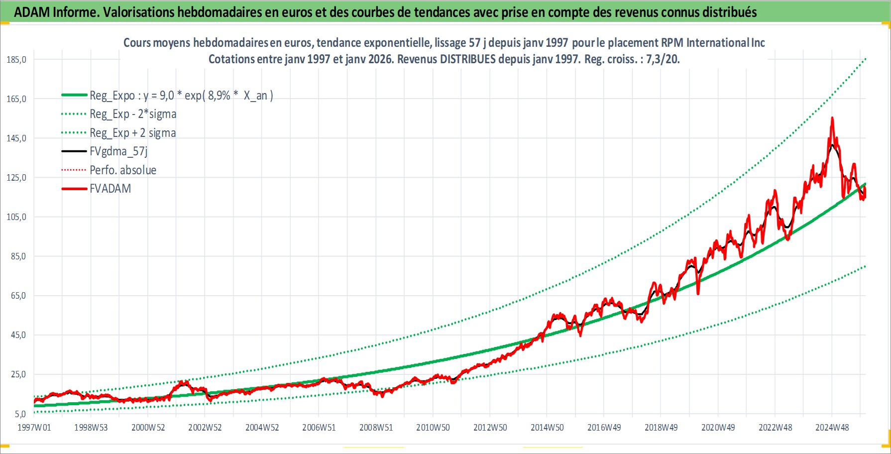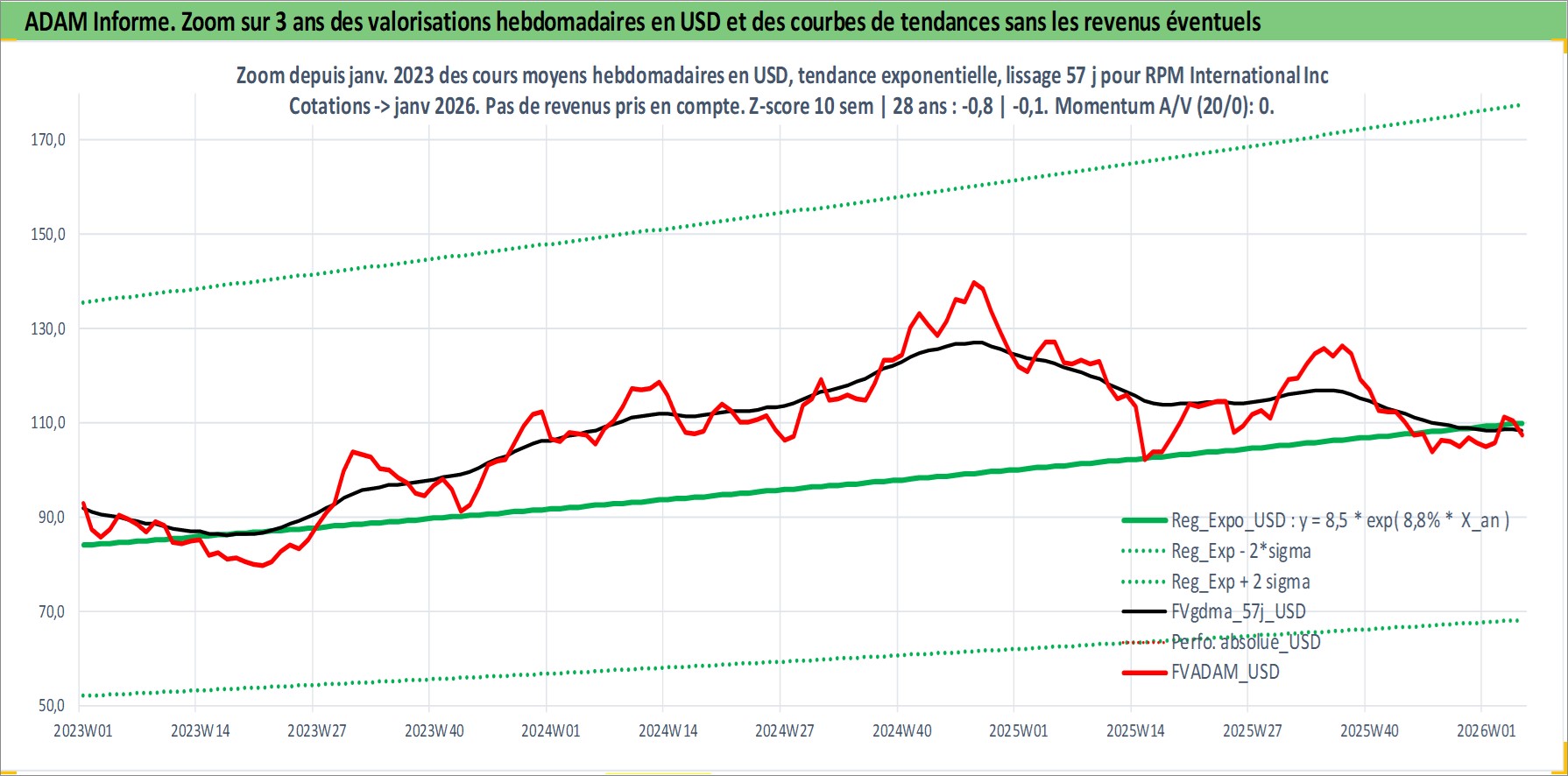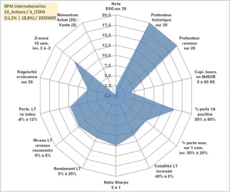 Site dédié aux investisseursPage dédiée sur site financeAnalyse des valorisations hebdomadaires de l'action RPM International Inc. Cet actif est cote en USD. Les valorisations sont en contrevaleur EURO et couvrent les semaines 1997W01 a 2026W05. Les revenus de cet actif financier sont pris en compte depuis la semaine 1997W03. La note globale ESG de cet actif est estimee a 2.0 (apres rebasage entre 0 et 20).