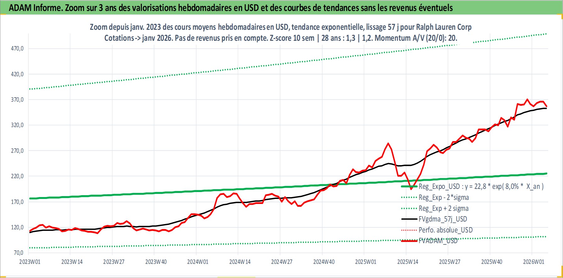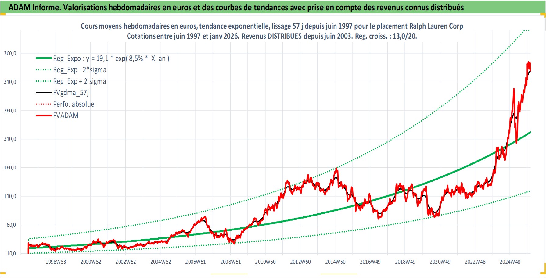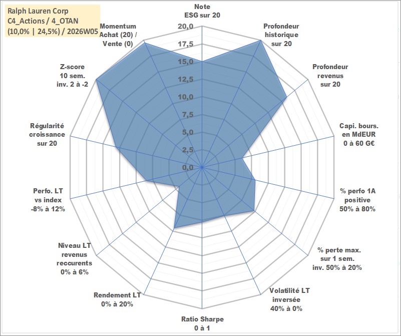 Site dédié aux investisseursPage dédiée sur site financeAnalyse des valorisations hebdomadaires de l'action Ralph Lauren Corp. Cet actif est cote en USD. Les valorisations sont en contrevaleur EURO et couvrent les semaines 1997W24 a 2026W05. Les revenus de cet actif financier sont pris en compte depuis la semaine 2003W26. La note globale ESG de cet actif est estimee a 15.0 (apres rebasage entre 0 et 20).