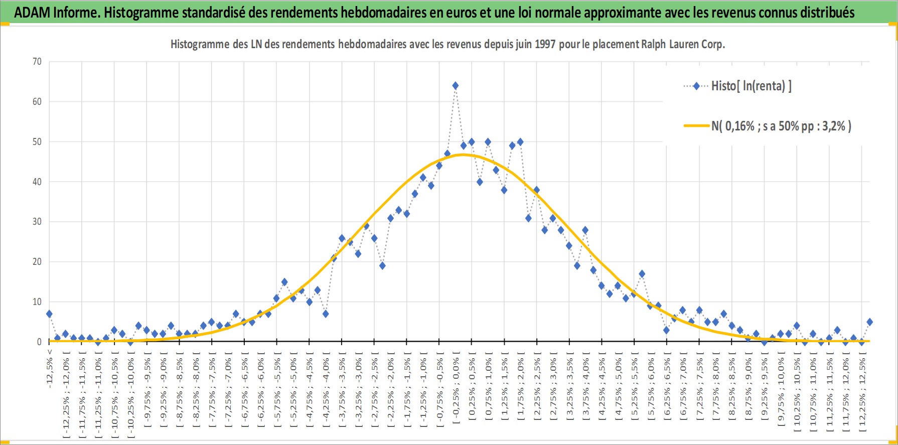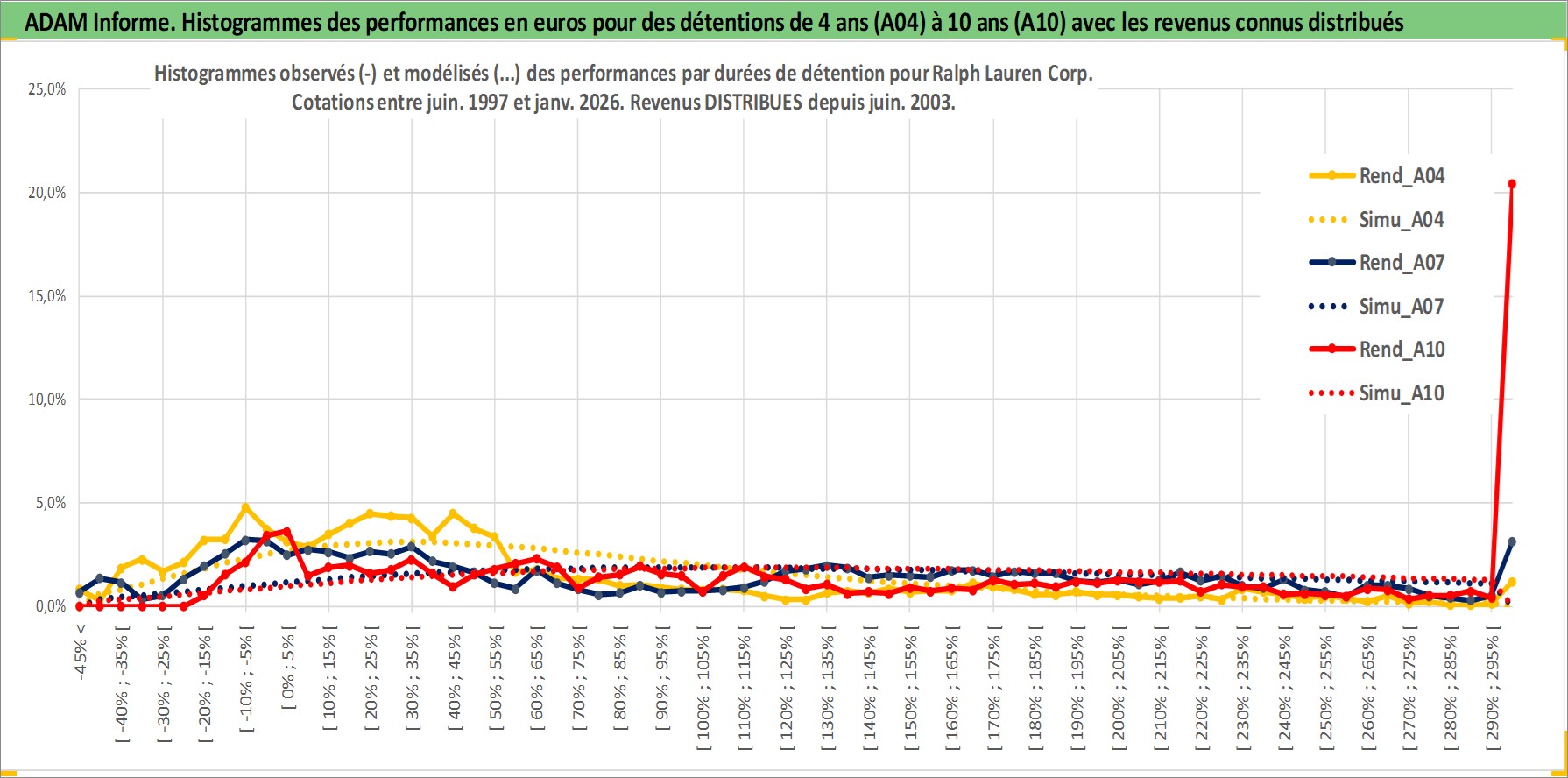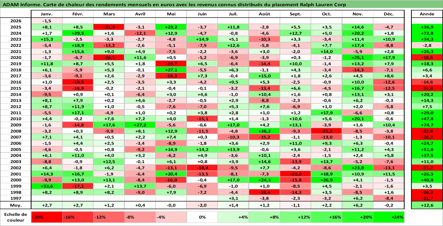 Site dédié aux investisseursPage dédiée sur site financeAnalyse des valorisations hebdomadaires de l'action Ralph Lauren Corp. Cet actif est cote en USD. Les valorisations sont en contrevaleur EURO et couvrent les semaines 1997W24 a 2026W05. Les revenus de cet actif financier sont pris en compte depuis la semaine 2003W26. La note globale ESG de cet actif est estimee a 15.0 (apres rebasage entre 0 et 20).