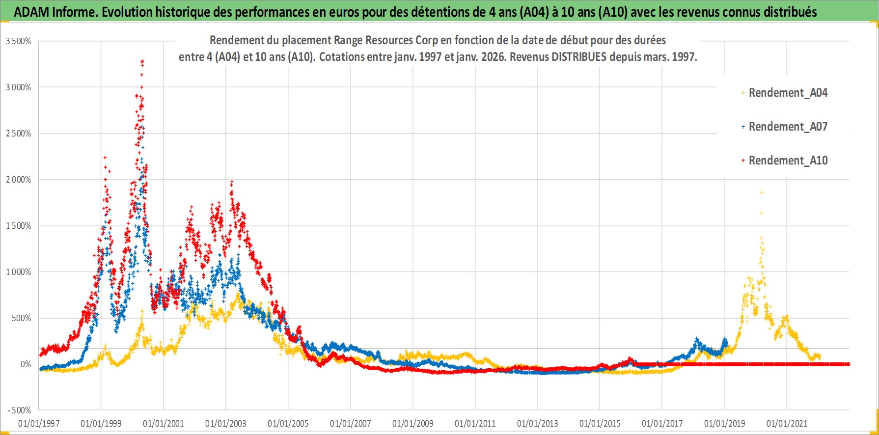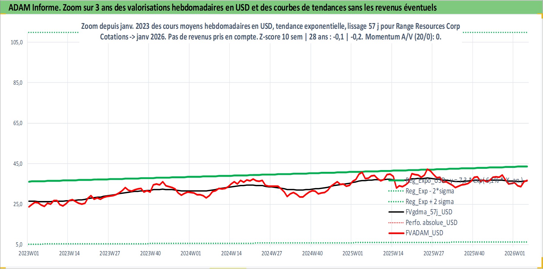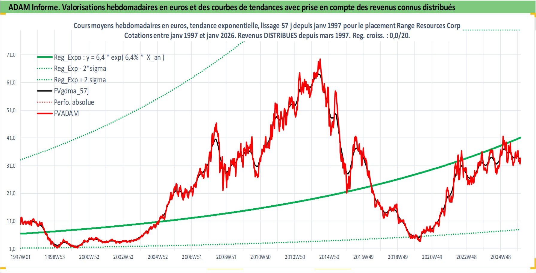 Site dédié aux investisseursPage dédiée sur site financeAnalyse des valorisations hebdomadaires de l'action Range Resources Corp. Cet actif est cote en USD. Les valorisations sont en contrevaleur EURO et couvrent les semaines 1997W01 a 2026W05. Les revenus de cet actif financier sont pris en compte depuis la semaine 1997W13. La note globale ESG de cet actif est estimee a 1.0 (apres rebasage entre 0 et 20).