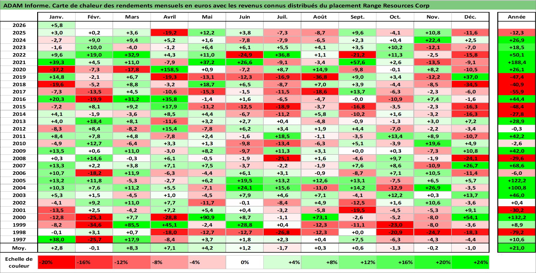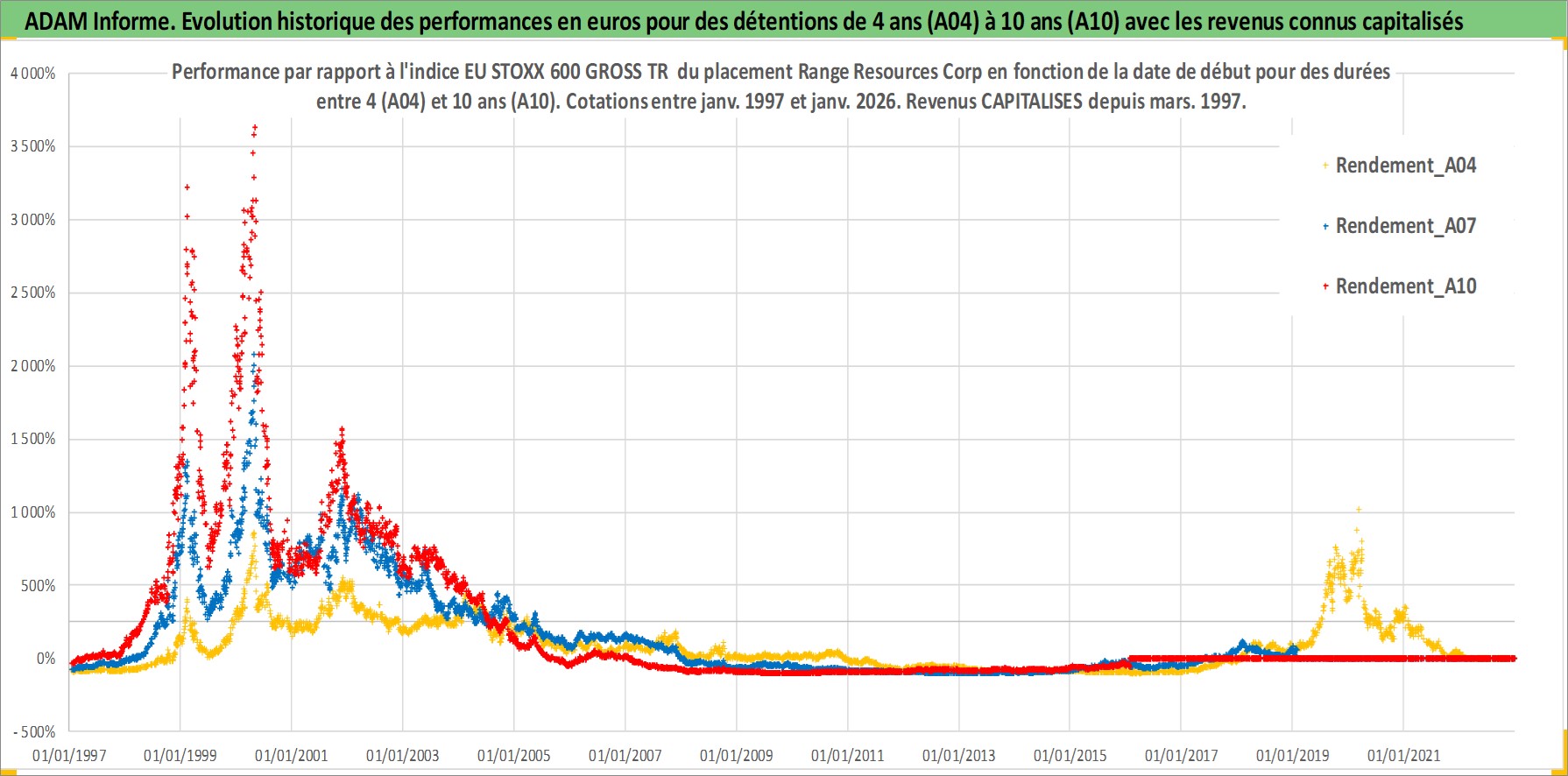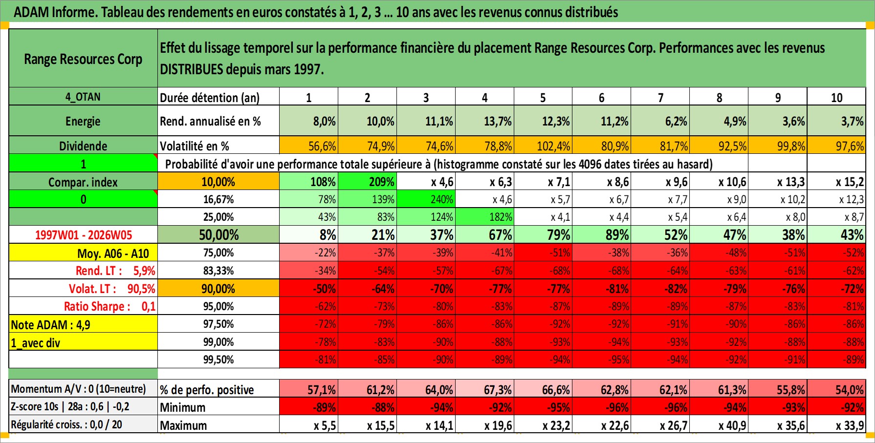 Site dédié aux investisseursPage dédiée sur site financeAnalyse des valorisations hebdomadaires de l'action Range Resources Corp. Cet actif est cote en USD. Les valorisations sont en contrevaleur EURO et couvrent les semaines 1997W01 a 2026W05. Les revenus de cet actif financier sont pris en compte depuis la semaine 1997W13. La note globale ESG de cet actif est estimee a 1.0 (apres rebasage entre 0 et 20).