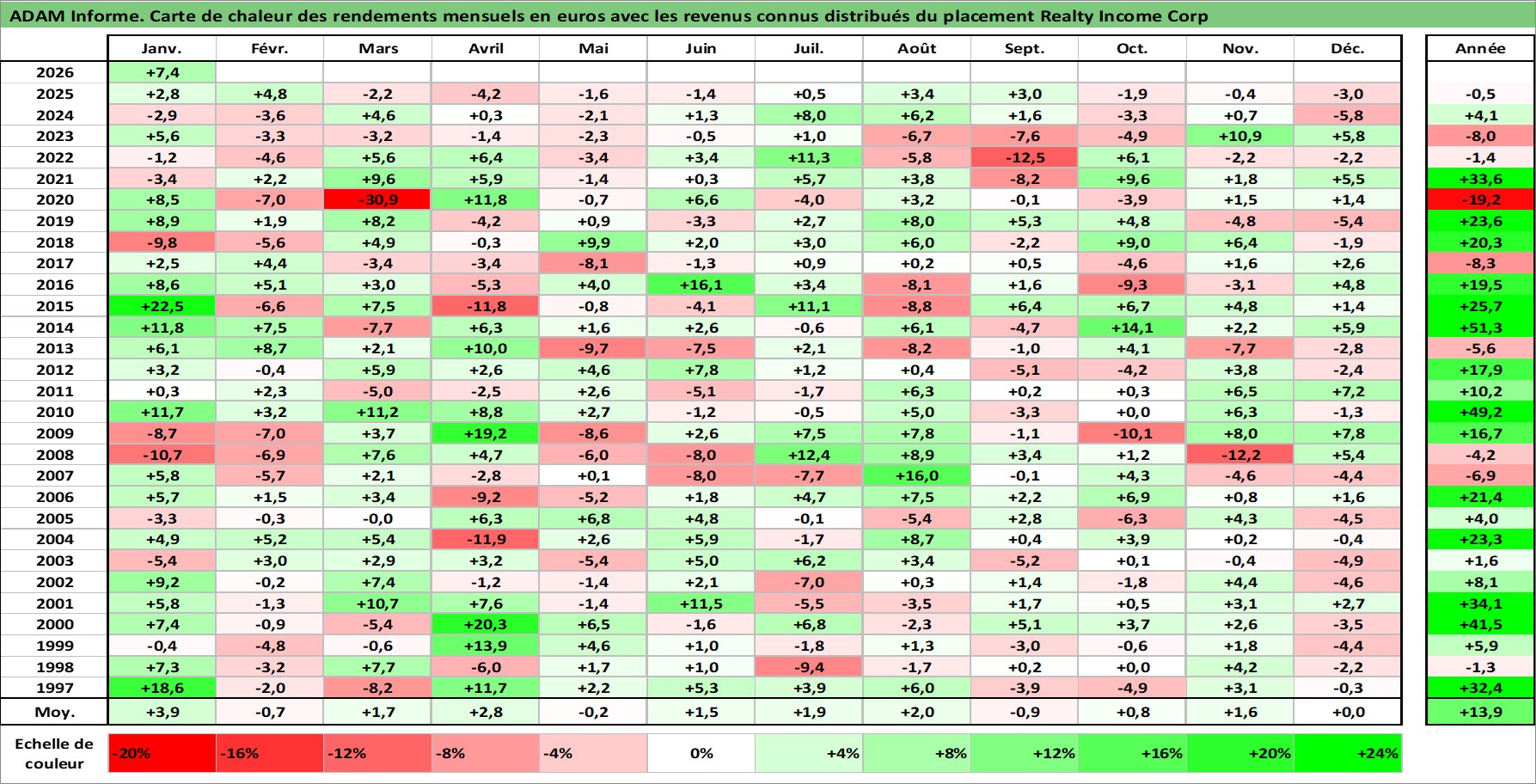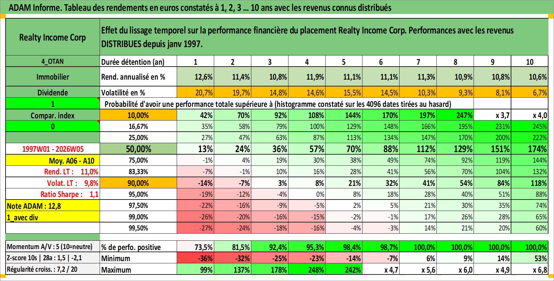 Site dédié aux investisseursPage dédiée sur site financeAnalyse des valorisations hebdomadaires de l'action Realty Income Corp. Cet actif est cote en USD. Les valorisations sont en contrevaleur EURO et couvrent les semaines 1997W01 a 2026W05. Les revenus de cet actif financier sont pris en compte depuis la semaine 1997W05. La note globale ESG de cet actif est estimee a 13.0 (apres rebasage entre 0 et 20).