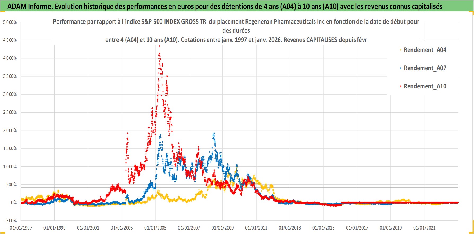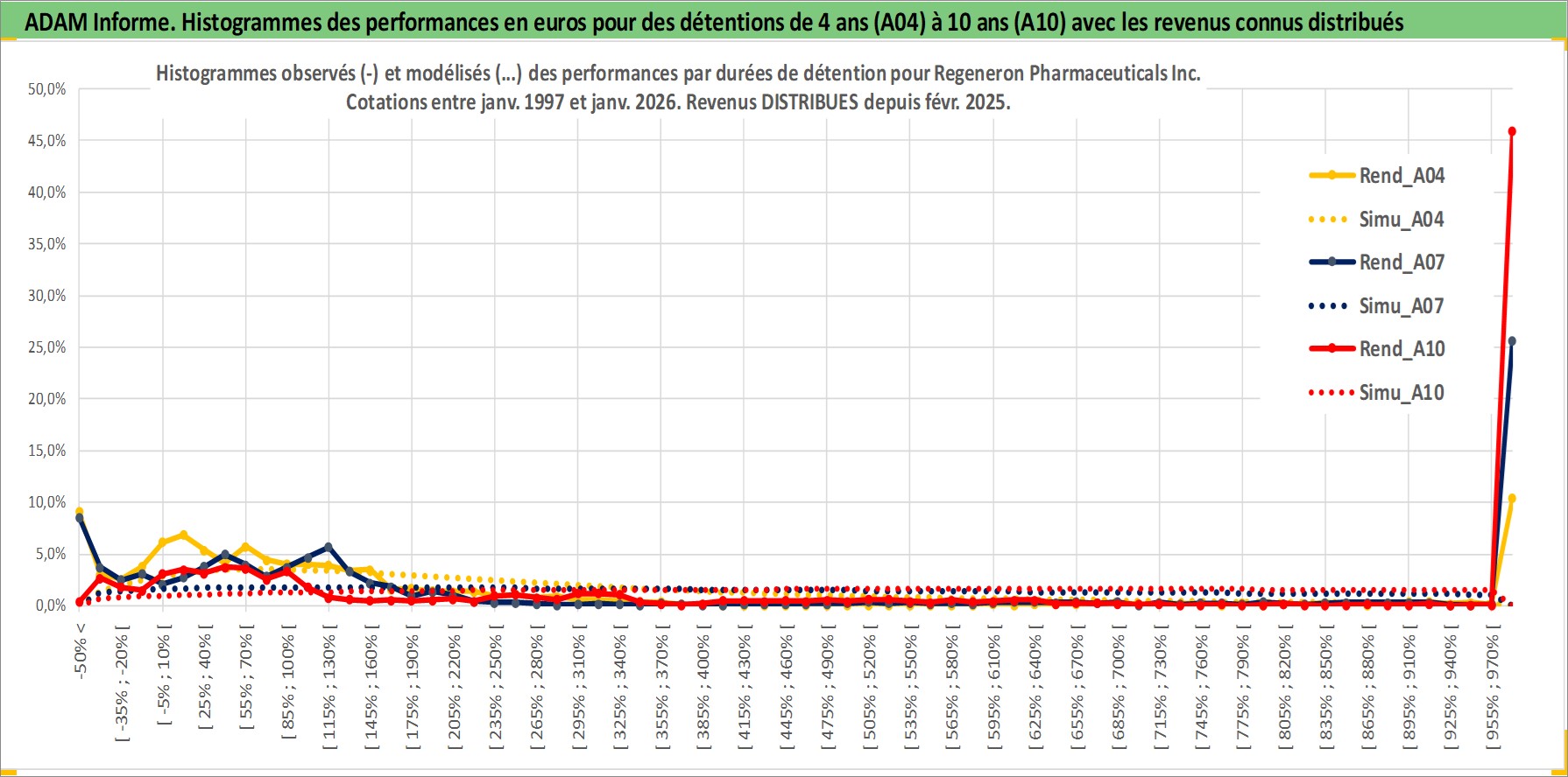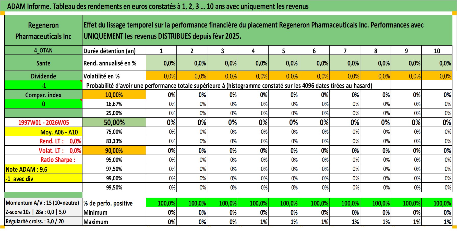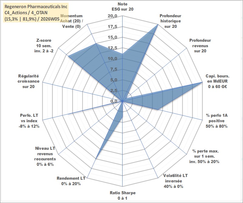 Site dédié aux investisseursPage dédiée sur site financeAnalyse des valorisations hebdomadaires de l'action Regeneron Pharmaceuticals Inc. Cet actif est cote en USD. Les valorisations sont en contrevaleur EURO et couvrent les semaines 1997W01 a 2026W05. Les revenus de cet actif financier sont pris en compte depuis la semaine 2025W08. La note globale ESG de cet actif est estimee a 11.0 (apres rebasage entre 0 et 20).