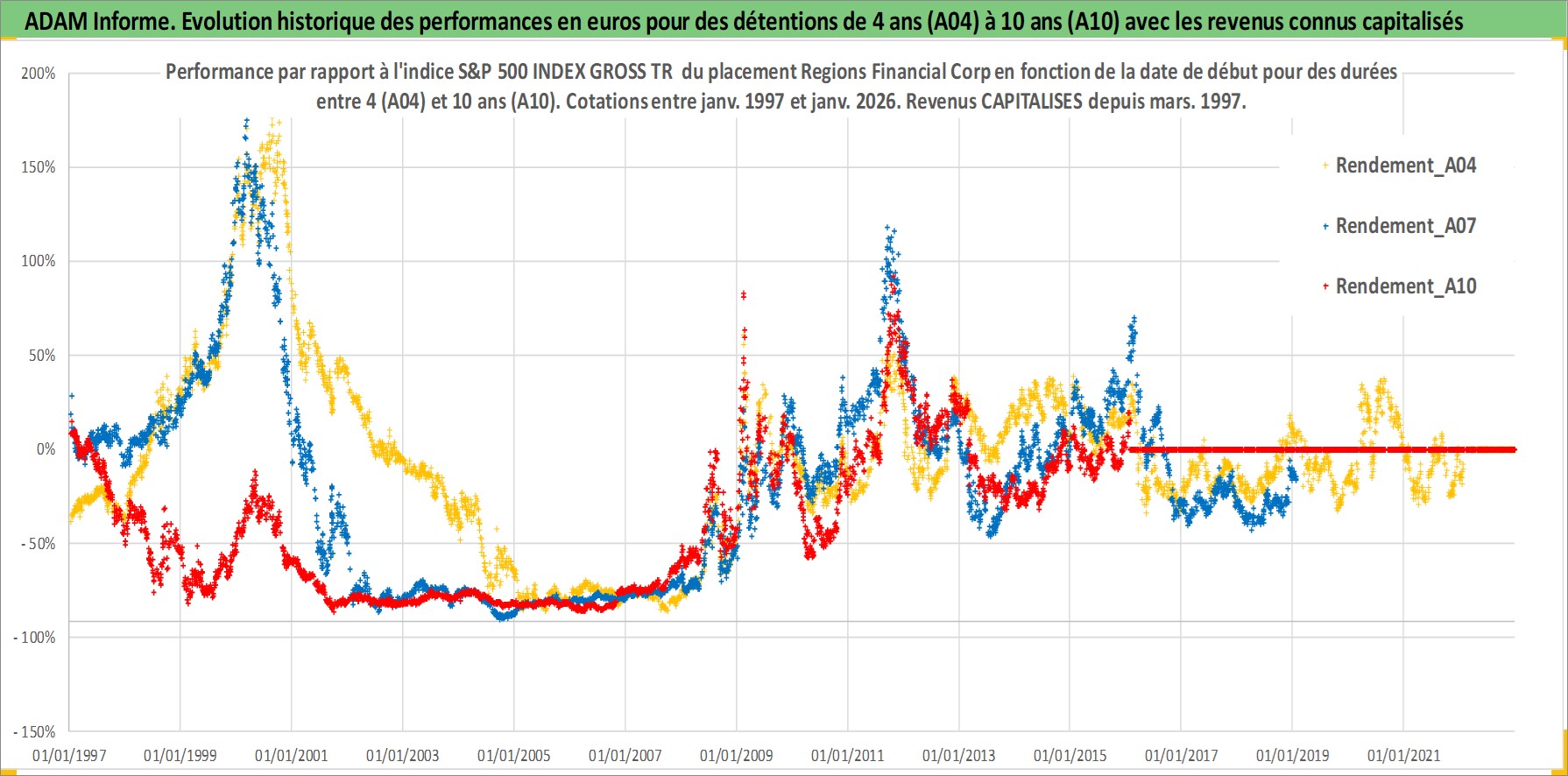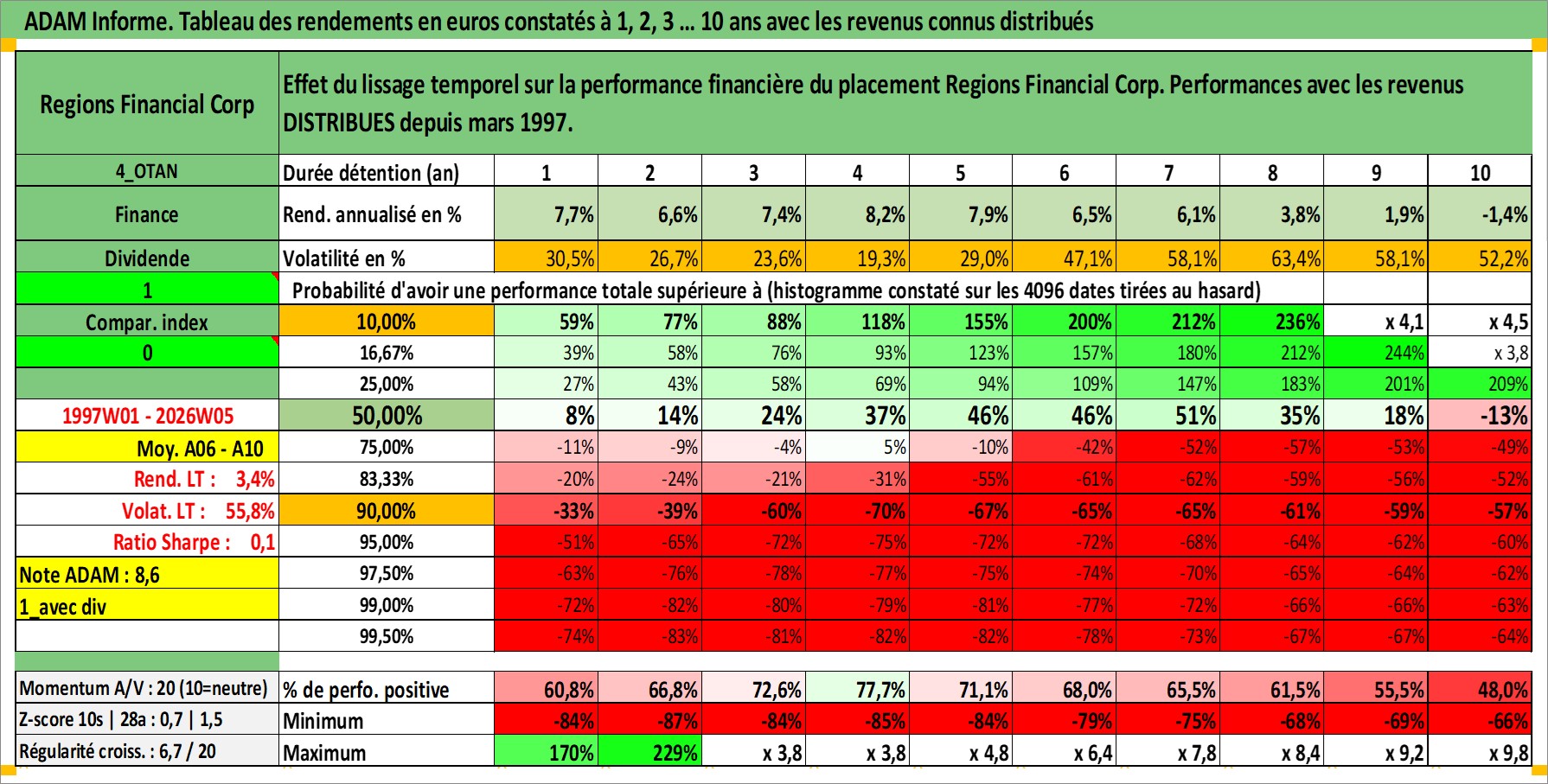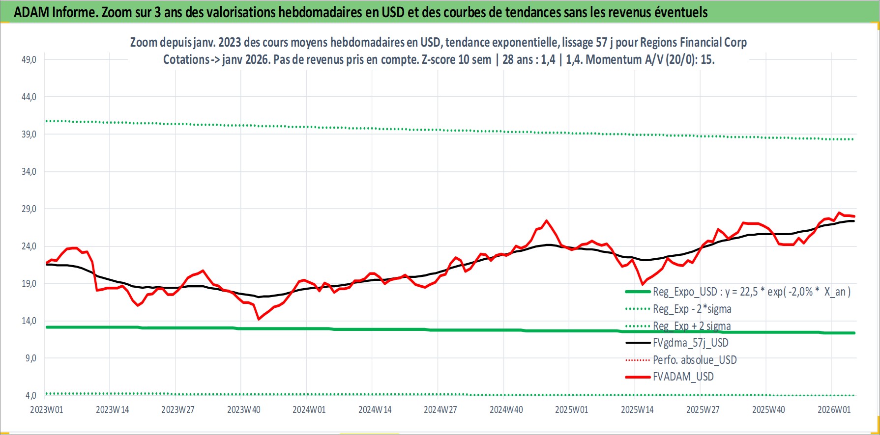 Site dédié aux investisseursPage dédiée sur site financeAnalyse des valorisations hebdomadaires de l'action Regions Financial Corp. Cet actif est cote en USD. Les valorisations sont en contrevaleur EURO et couvrent les semaines 1997W01 a 2026W05. Les revenus de cet actif financier sont pris en compte depuis la semaine 1997W11. La note globale ESG de cet actif est estimee a 13.0 (apres rebasage entre 0 et 20).