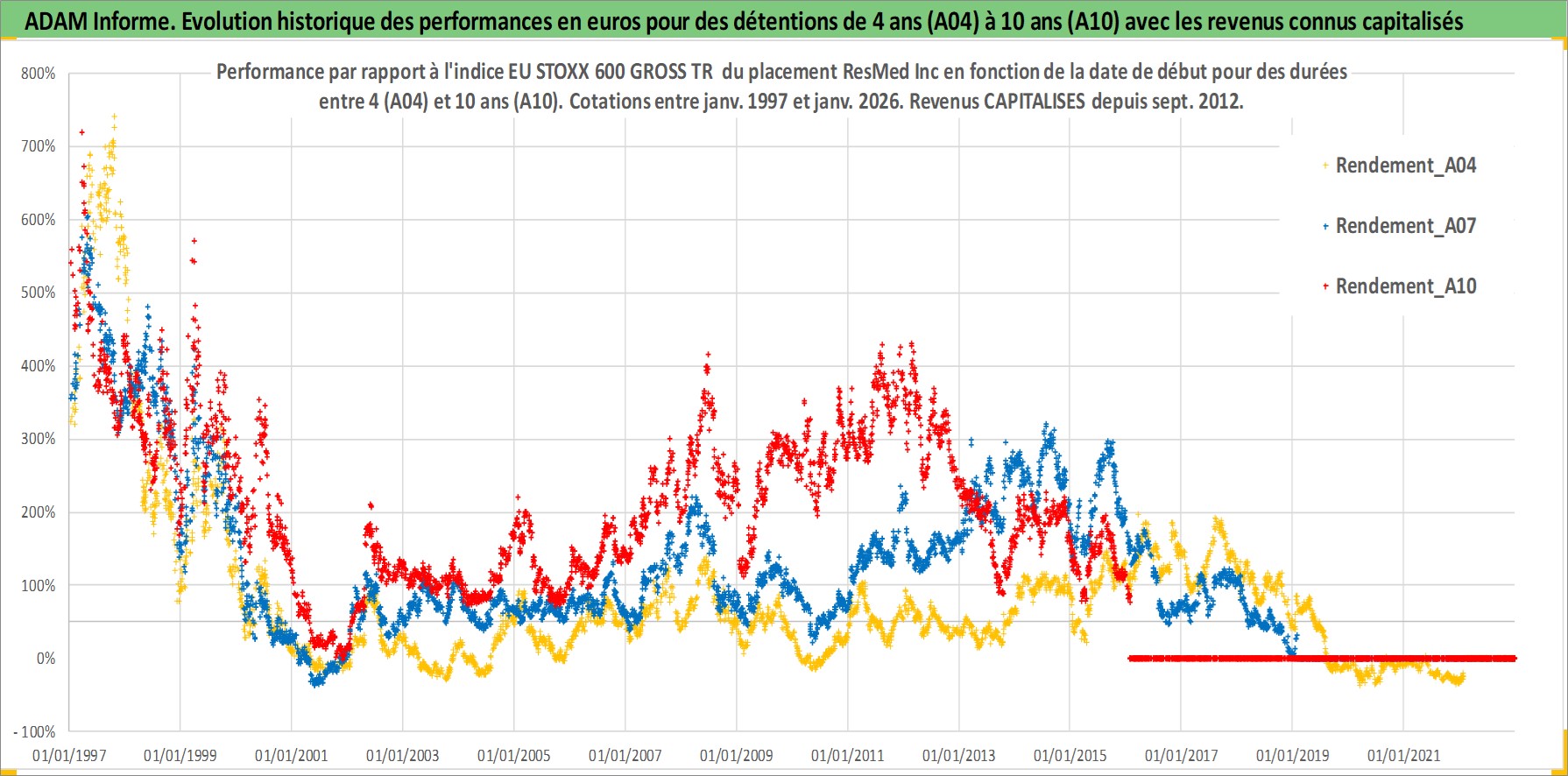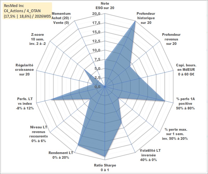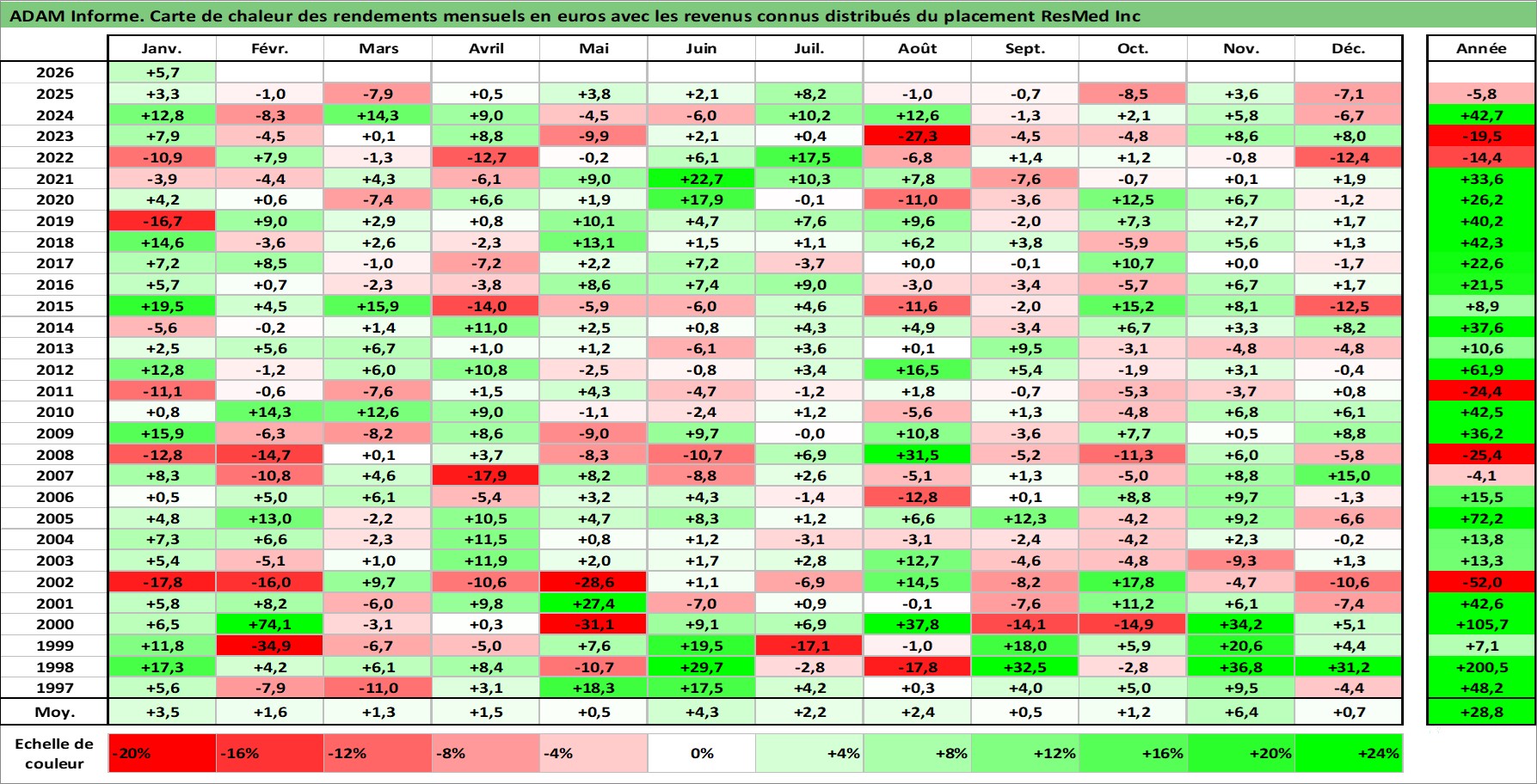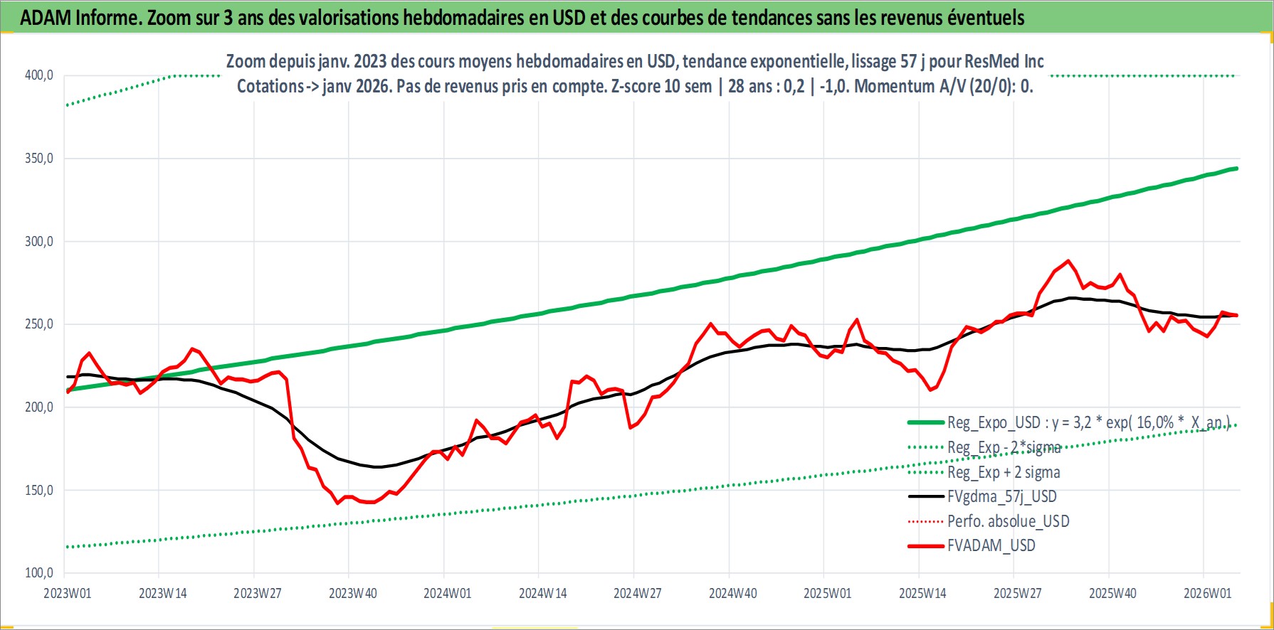 Site dédié aux investisseursPage dédiée sur site financeAnalyse des valorisations hebdomadaires de l'action ResMed Inc. Cet actif est cote en USD. Les valorisations sont en contrevaleur EURO et couvrent les semaines 1997W01 a 2026W05. Les revenus de cet actif financier sont pris en compte depuis la semaine 2012W36. La note globale ESG de cet actif est estimee a 7.0 (apres rebasage entre 0 et 20).