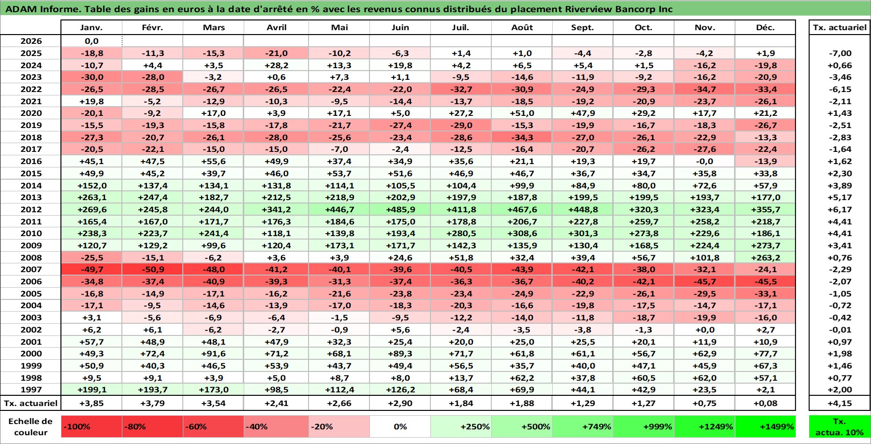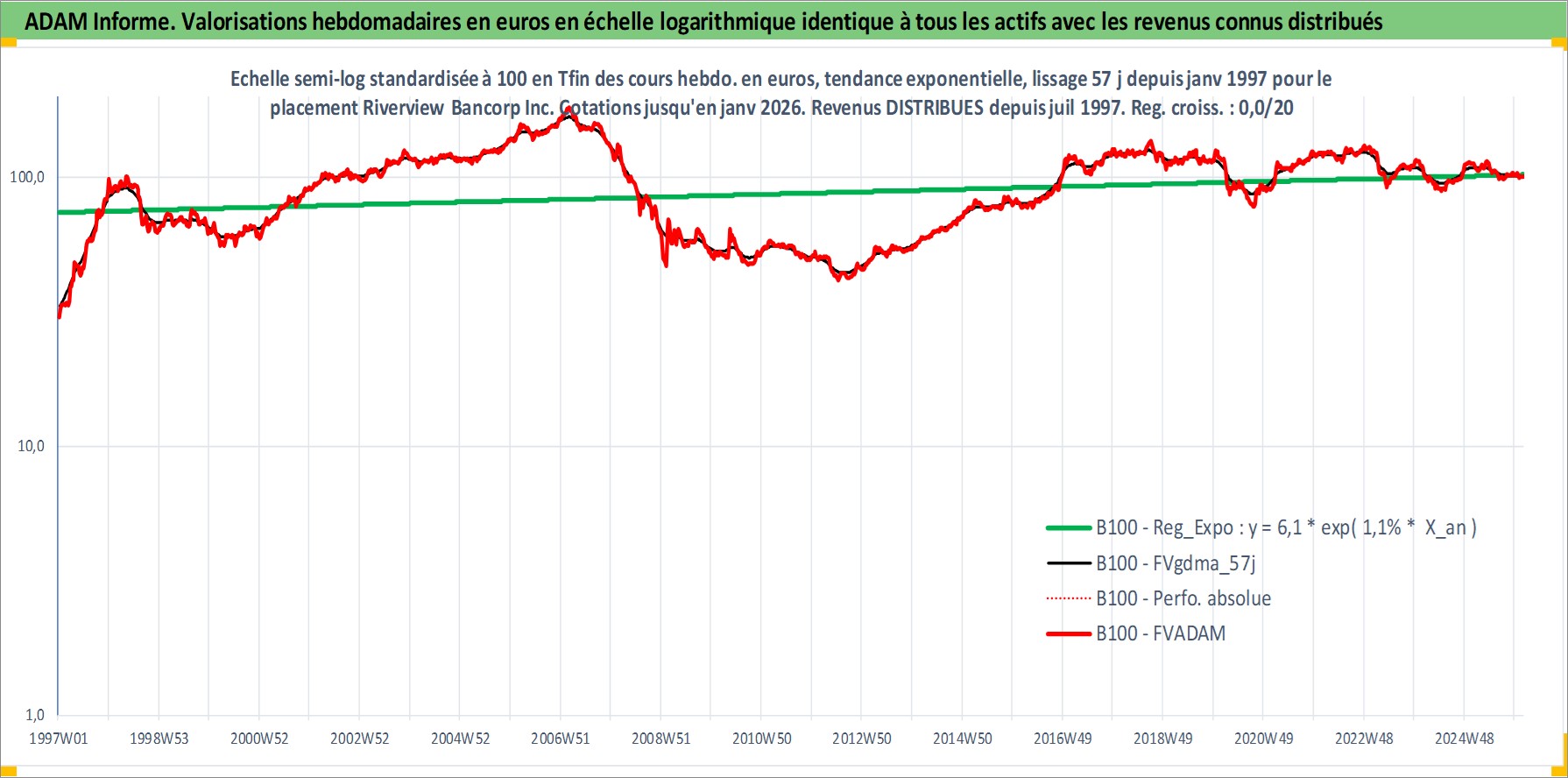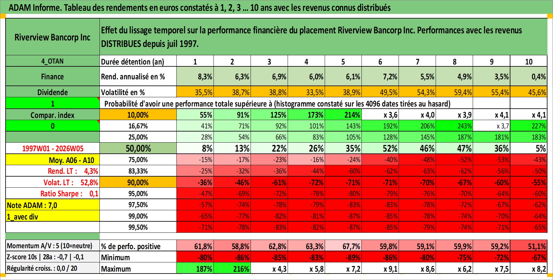 Site dédié aux investisseursPage dédiée sur site financeAnalyse des valorisations hebdomadaires de l'action Riverview Bancorp Inc. Cet actif est cote en USD. Les valorisations sont en contrevaleur EURO et couvrent les semaines 1997W01 a 2026W05. Les revenus de cet actif financier sont pris en compte depuis la semaine 1997W27. La note ESG de cet actif n'est pas connue.
