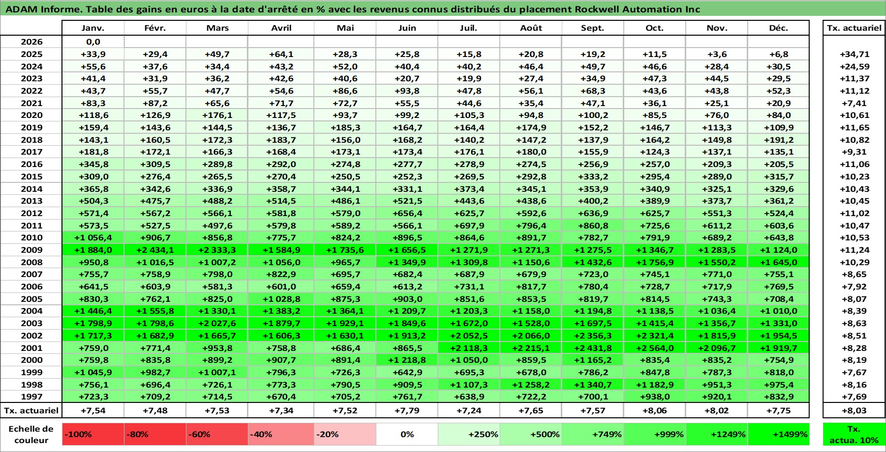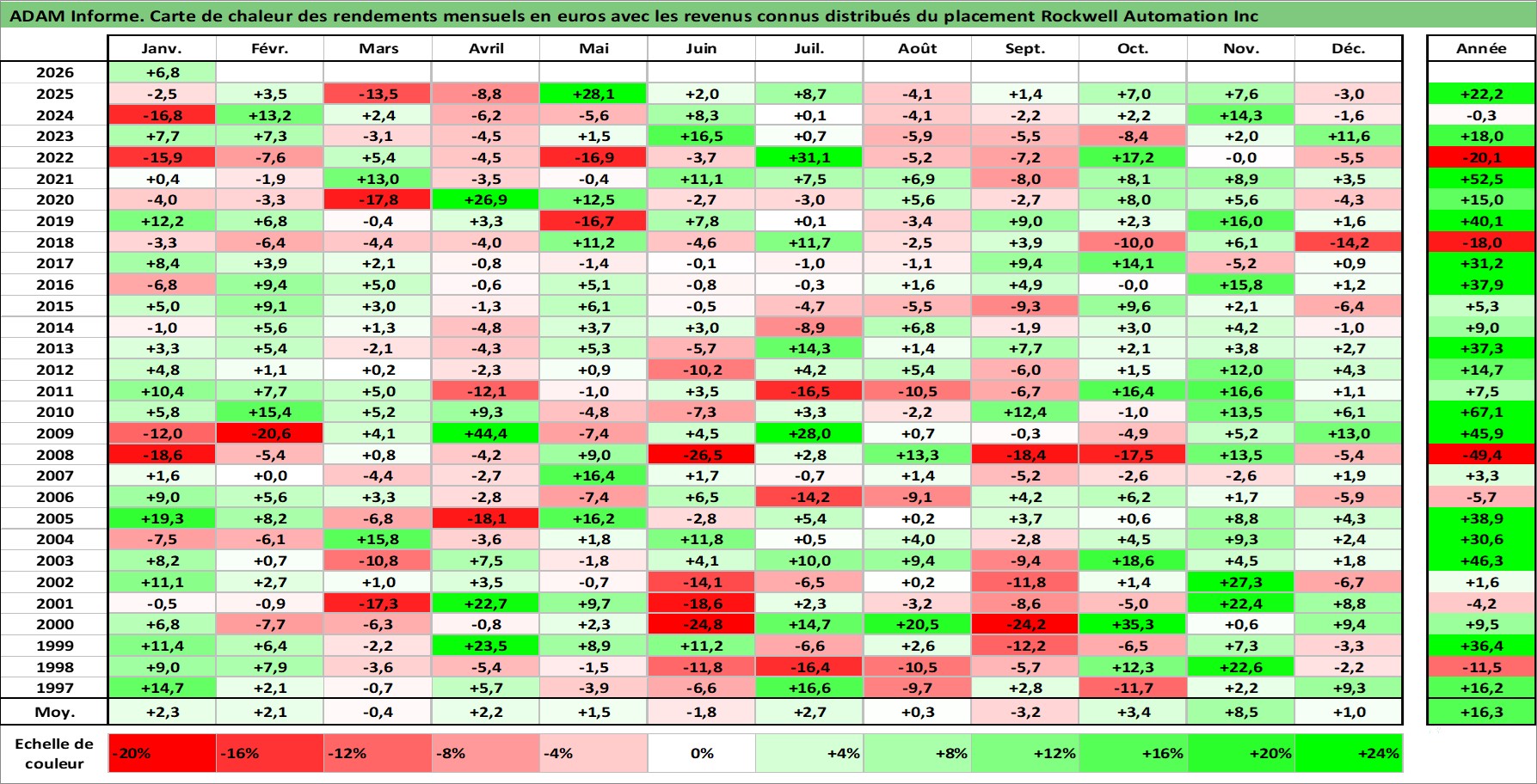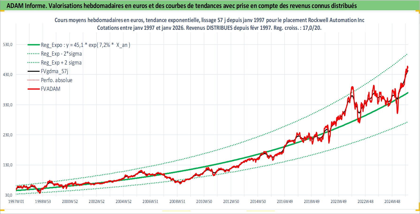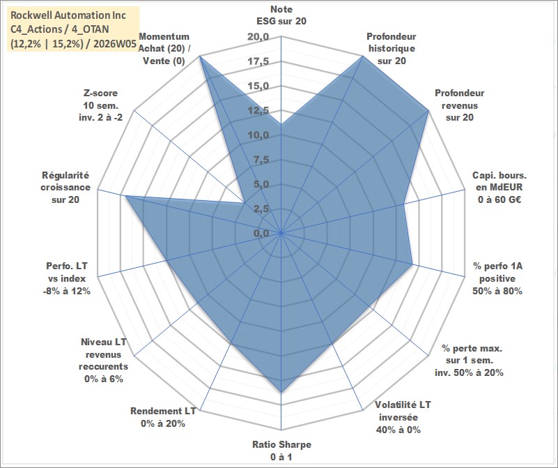 Site dédié aux investisseursPage dédiée sur site financeAnalyse des valorisations hebdomadaires de l'action Rockwell Automation Inc. Cet actif est cote en USD. Les valorisations sont en contrevaleur EURO et couvrent les semaines 1997W01 a 2026W05. Les revenus de cet actif financier sont pris en compte depuis la semaine 1997W07. La note globale ESG de cet actif est estimee a 11.0 (apres rebasage entre 0 et 20).
