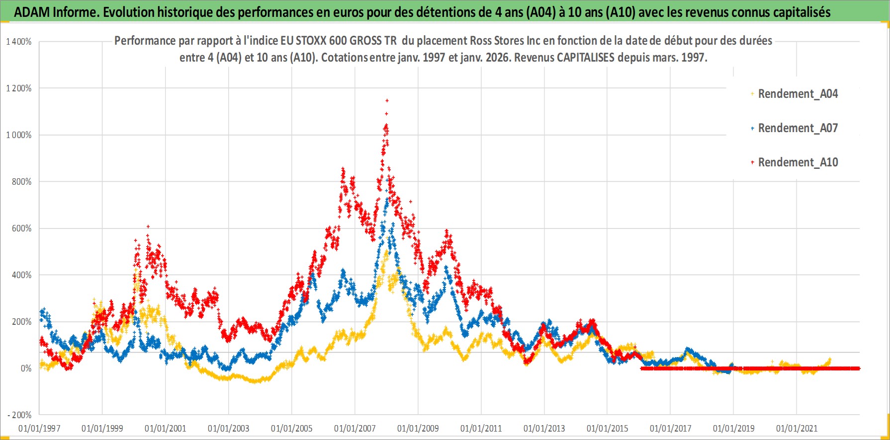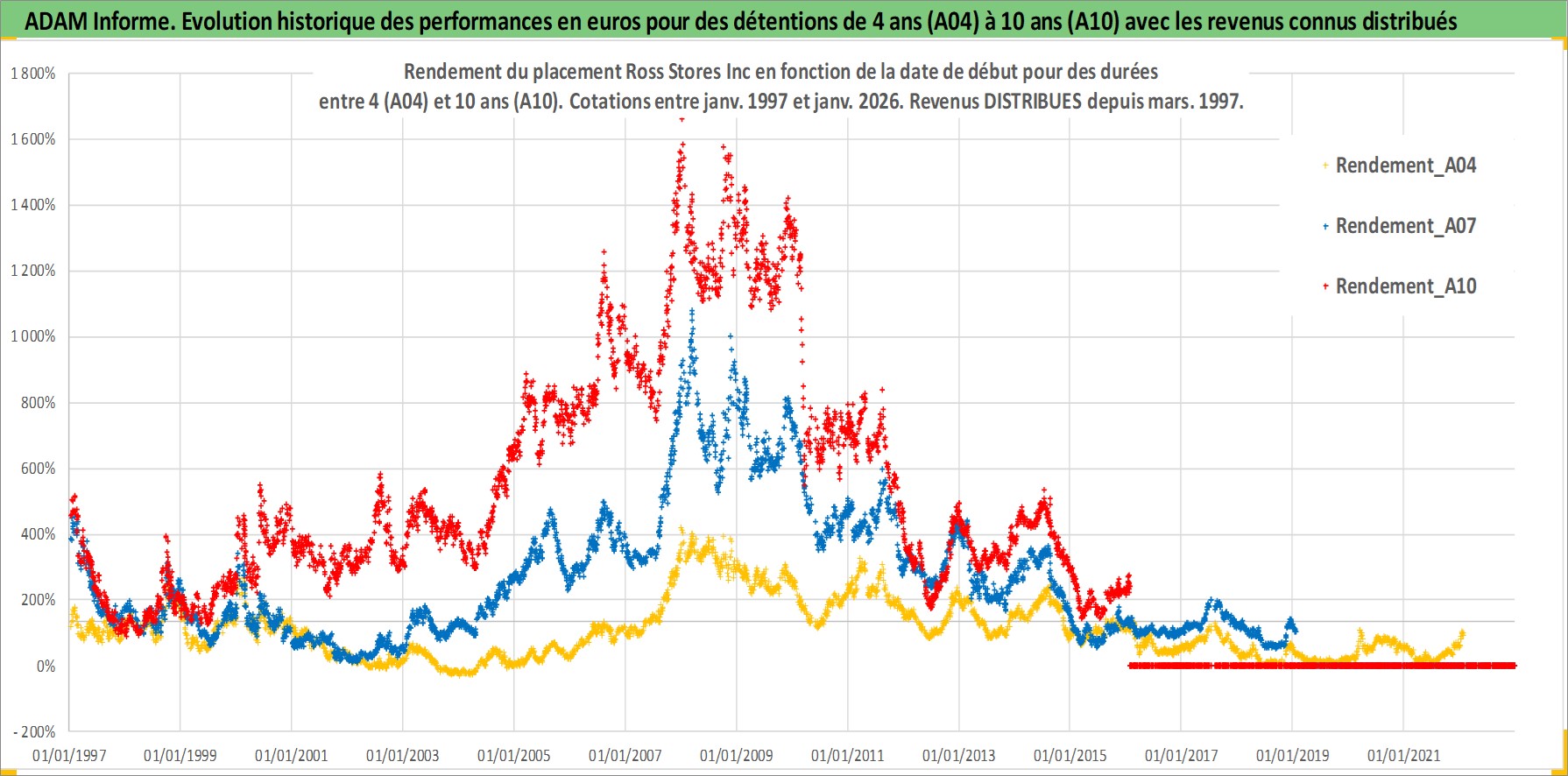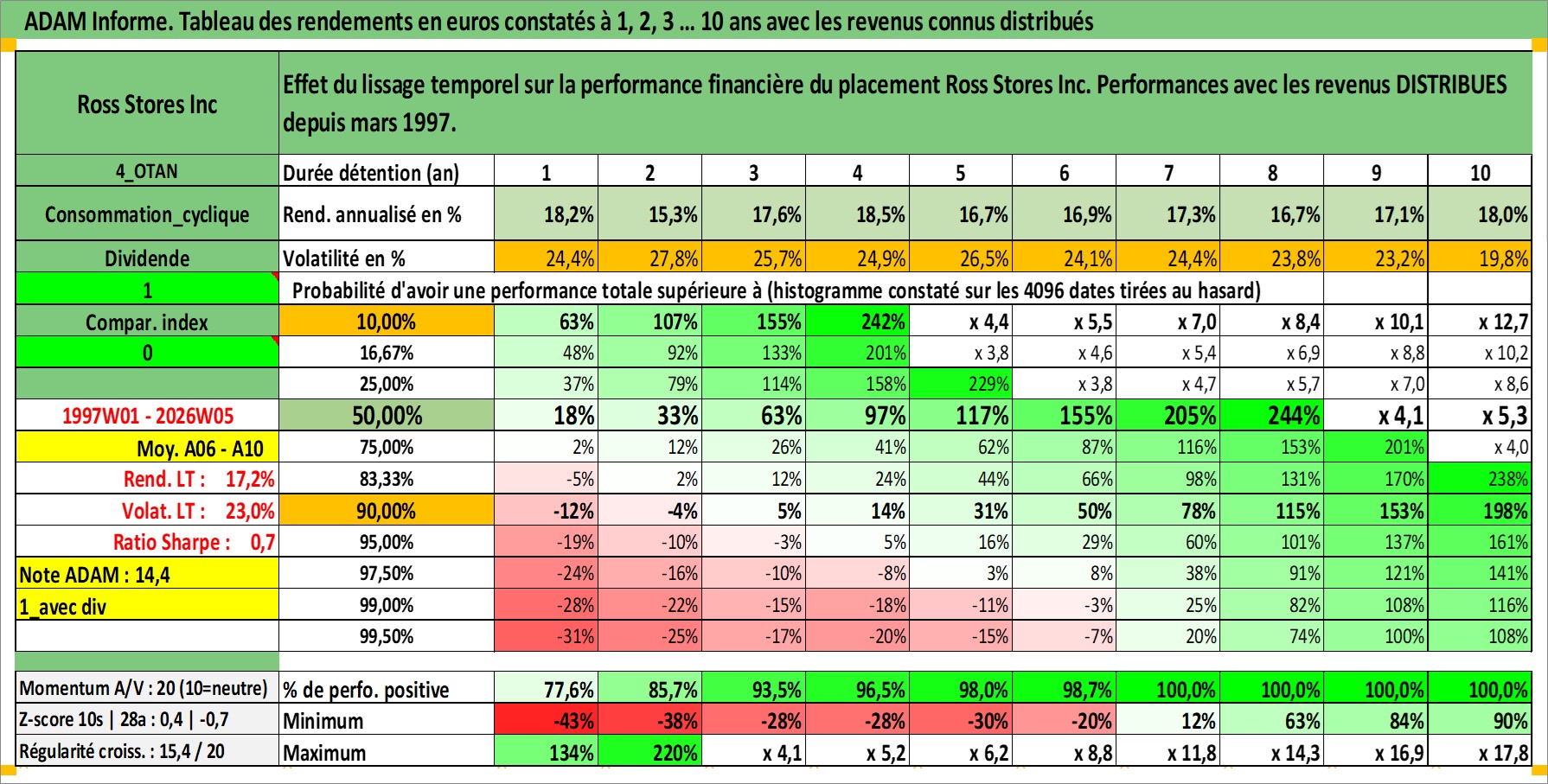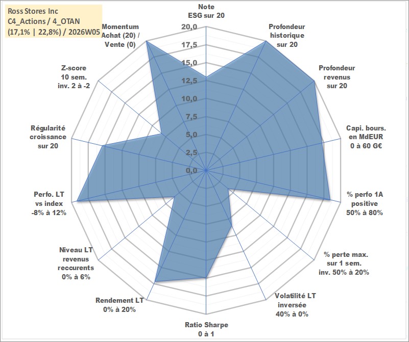 Site dédié aux investisseursPage dédiée sur site financeAnalyse des valorisations hebdomadaires de l'action Ross Stores Inc. Cet actif est cote en USD. Les valorisations sont en contrevaleur EURO et couvrent les semaines 1997W01 a 2026W05. Les revenus de cet actif financier sont pris en compte depuis la semaine 1997W10. La note globale ESG de cet actif est estimee a 13.0 (apres rebasage entre 0 et 20).
