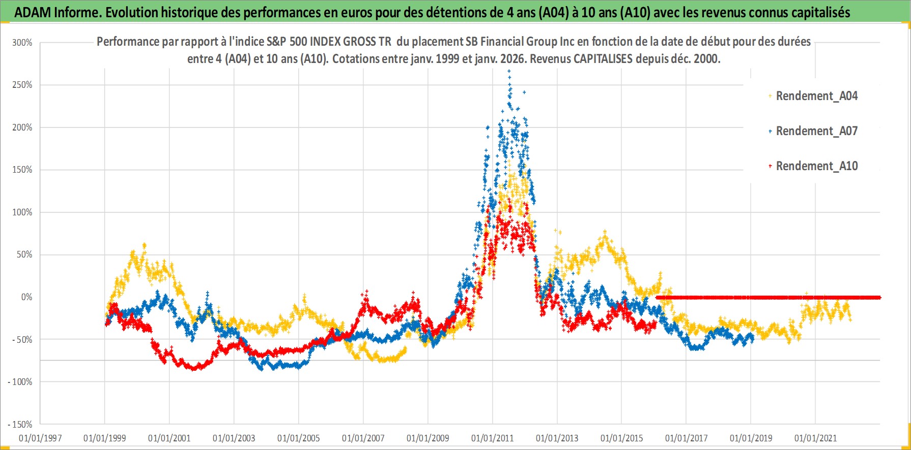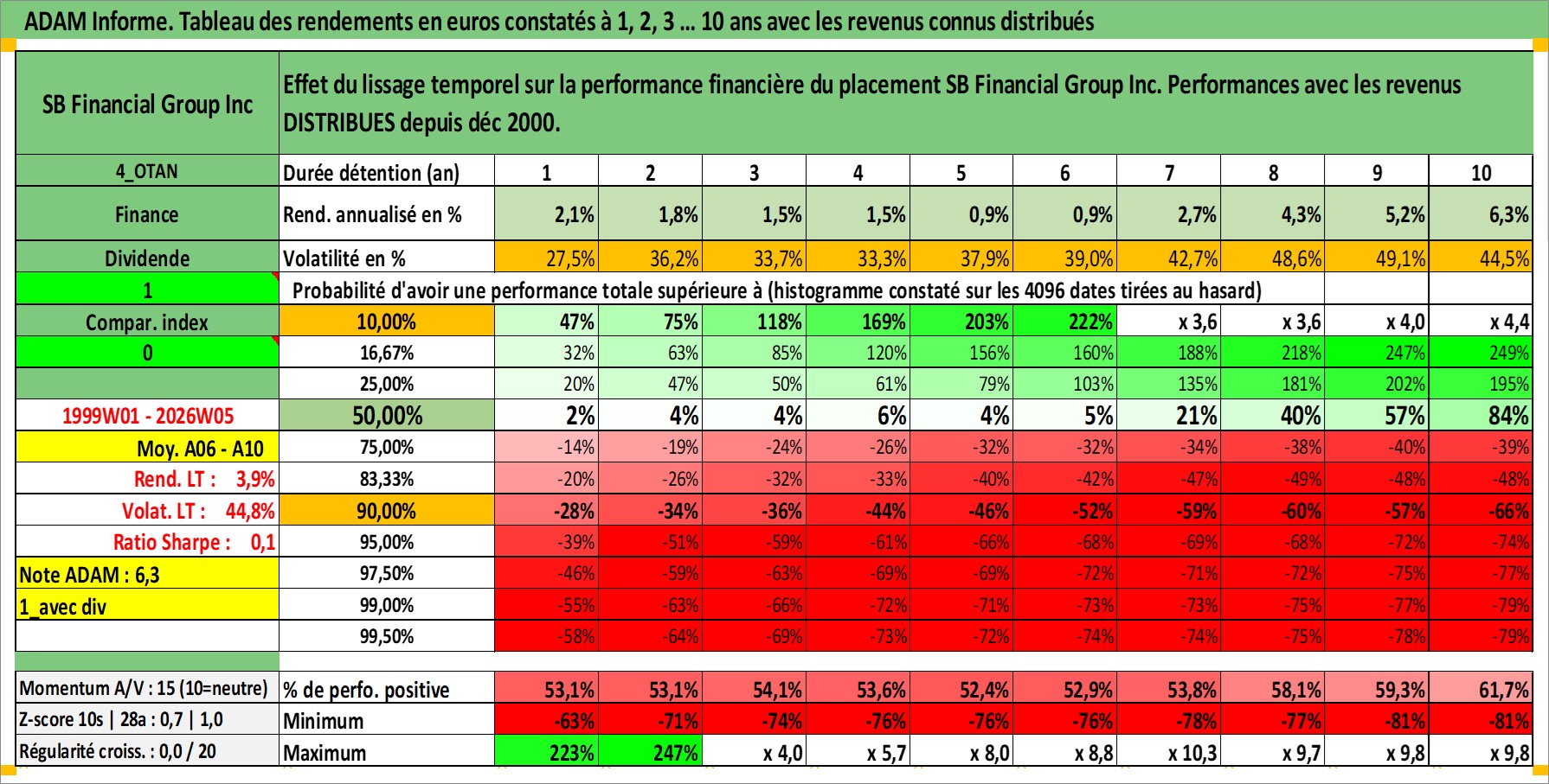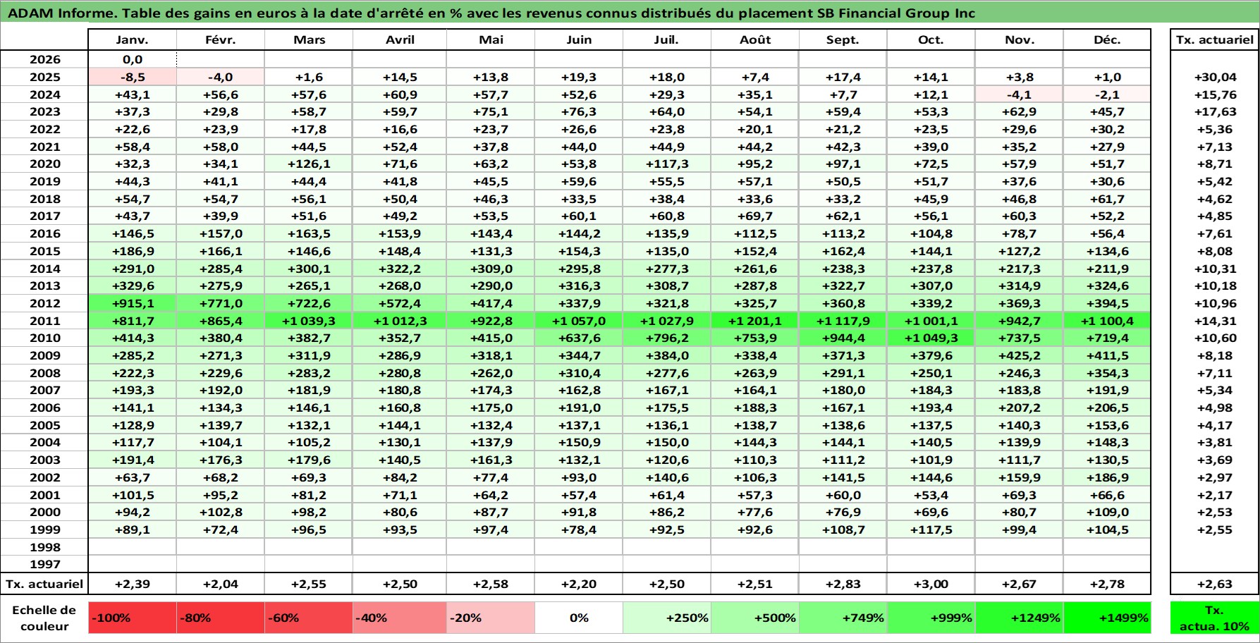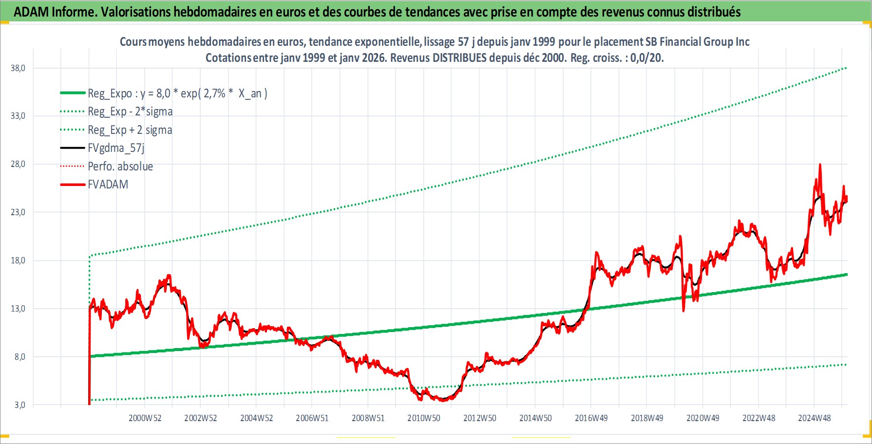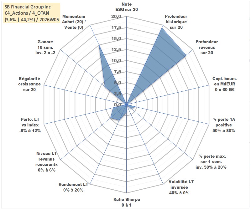 Site dédié aux investisseursPage dédiée sur site financeAnalyse des valorisations hebdomadaires de l'action SB Financial Group Inc. Cet actif est cote en USD. Les valorisations sont en contrevaleur EURO et couvrent les semaines 1999W01 a 2026W05. Les revenus de cet actif financier sont pris en compte depuis la semaine 2000W50. La note ESG de cet actif n'est pas connue.