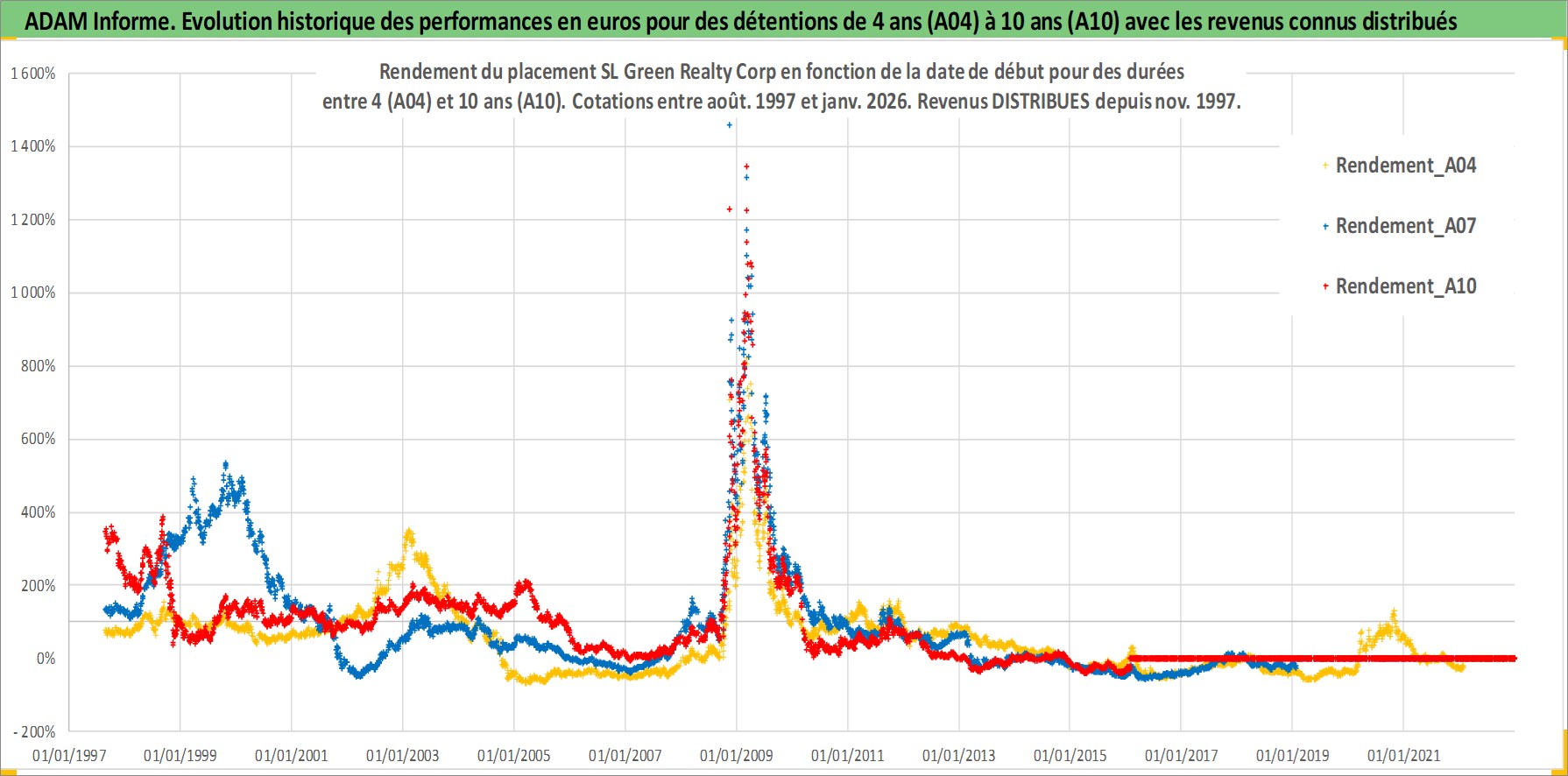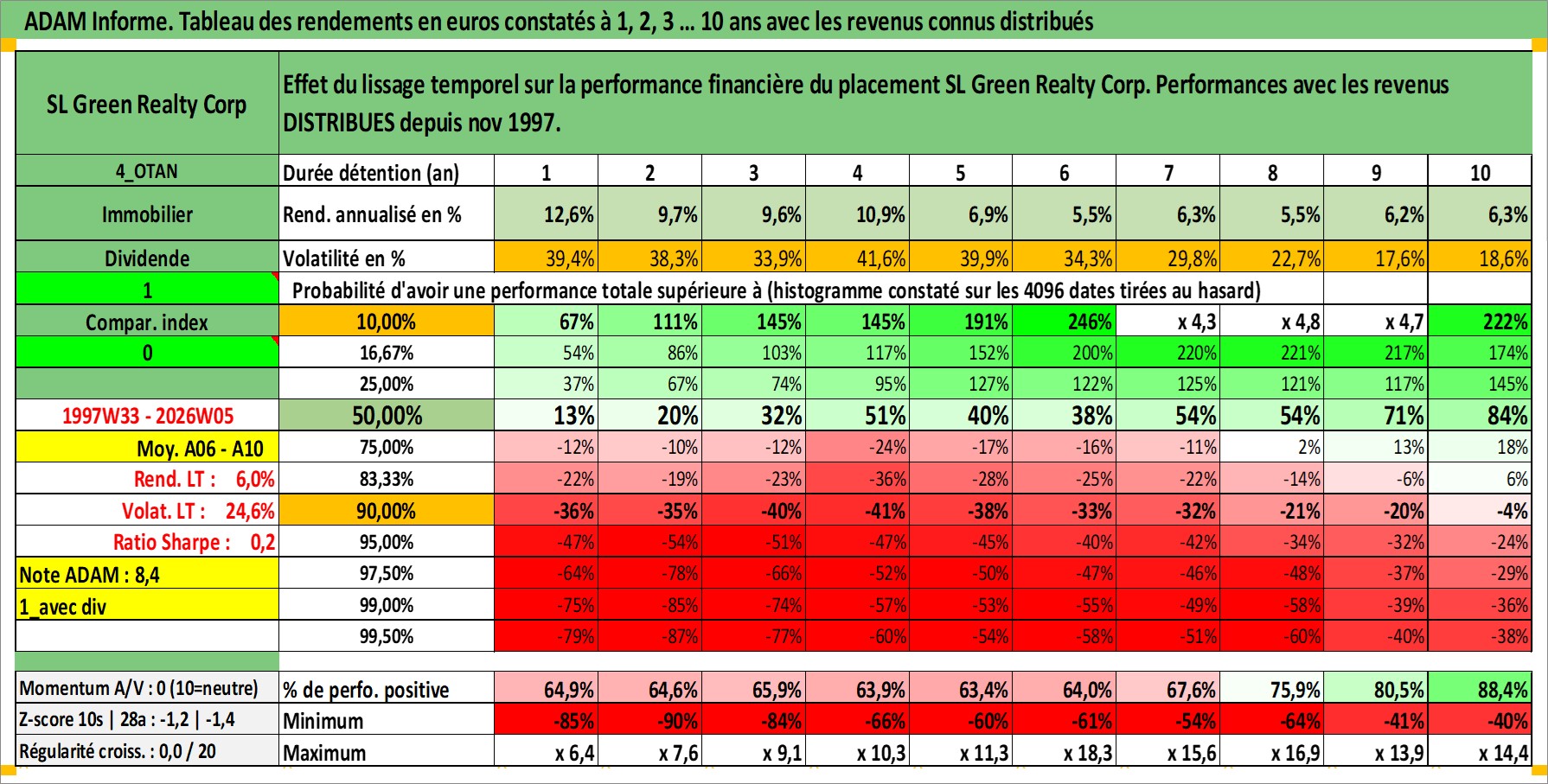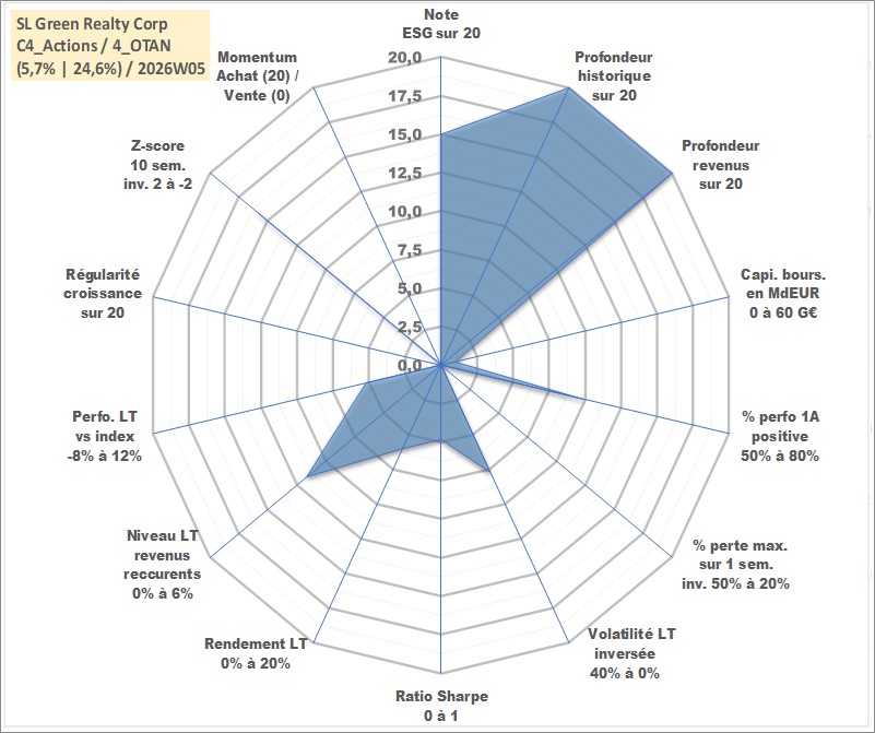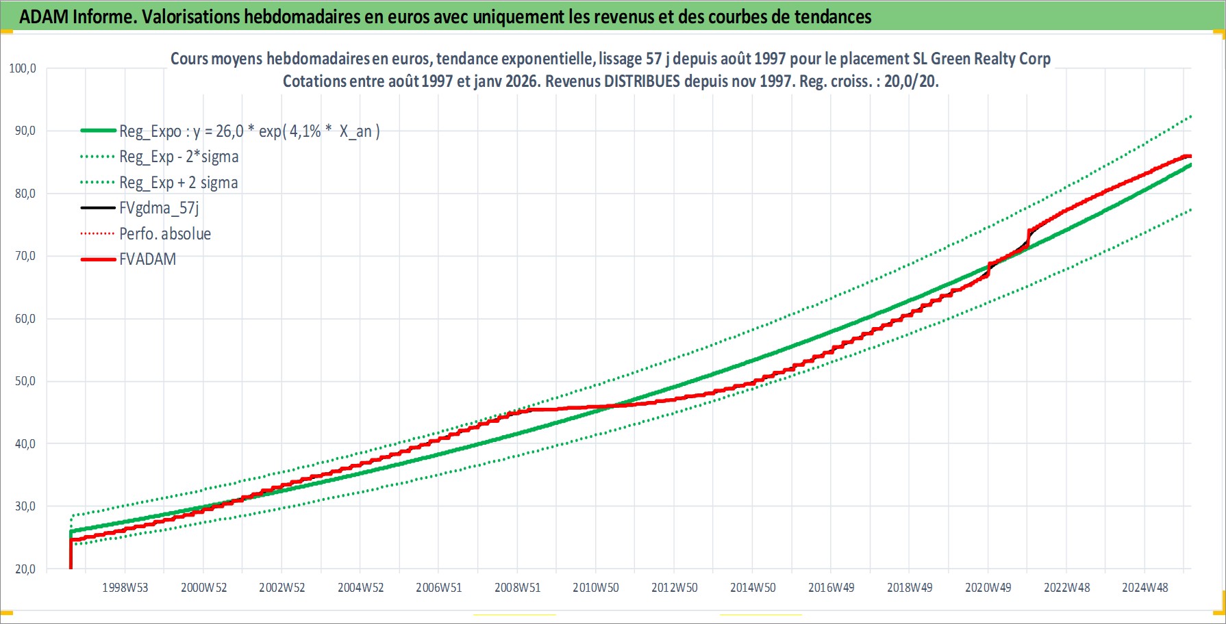 Site dédié aux investisseursPage dédiée sur site financeAnalyse des valorisations hebdomadaires de l'action SL Green Realty Corp. Cet actif est cote en USD. Les valorisations sont en contrevaleur EURO et couvrent les semaines 1997W33 a 2026W05. Les revenus de cet actif financier sont pris en compte depuis la semaine 1997W46. La note globale ESG de cet actif est estimee a 15.0 (apres rebasage entre 0 et 20).