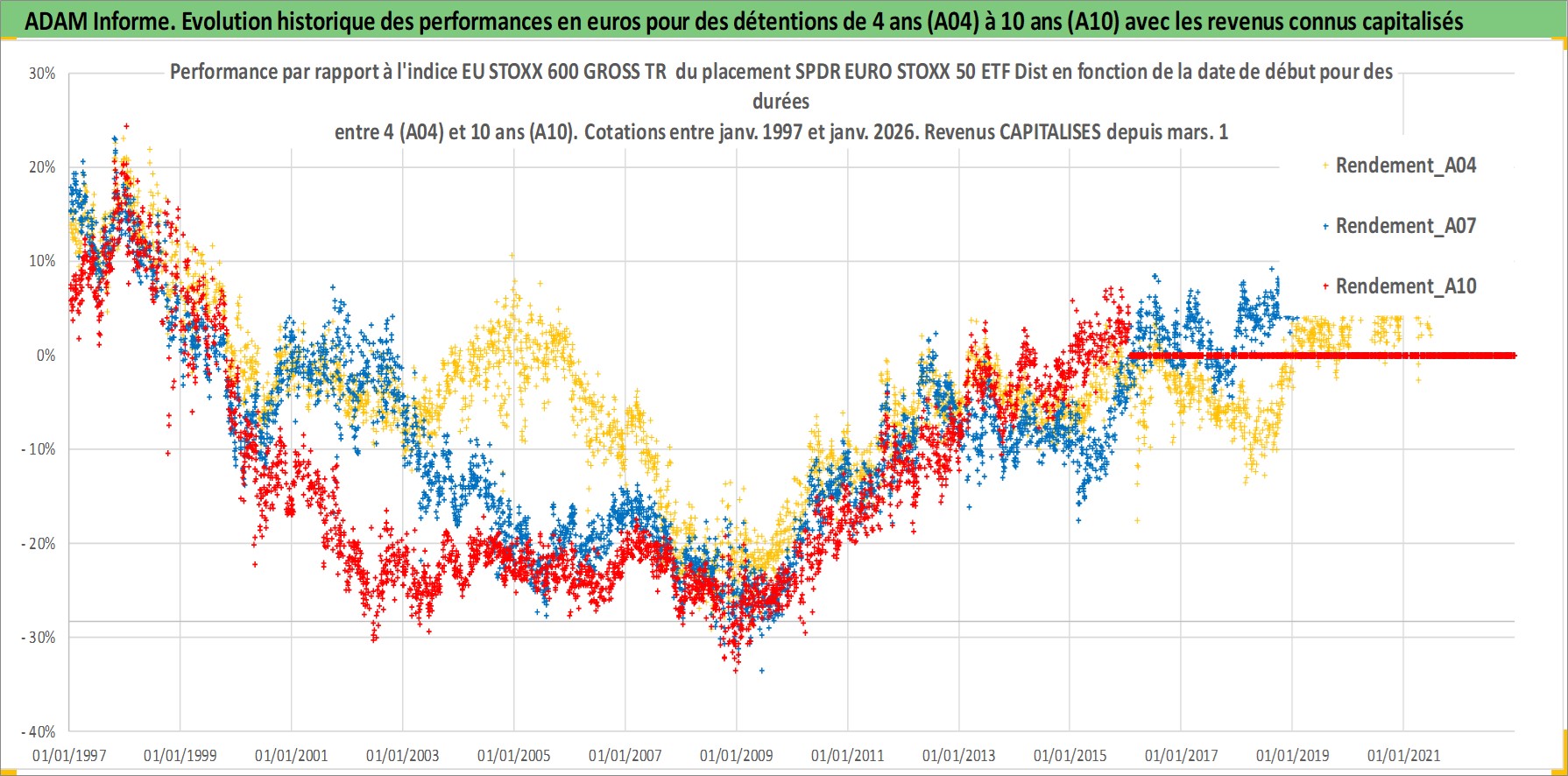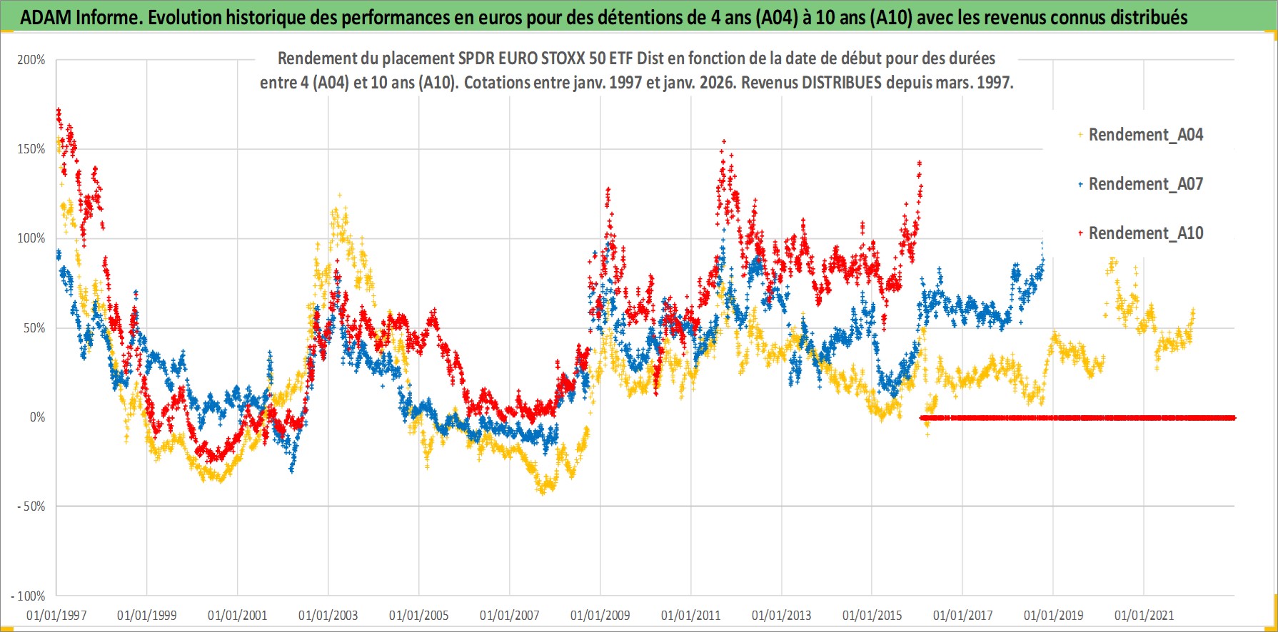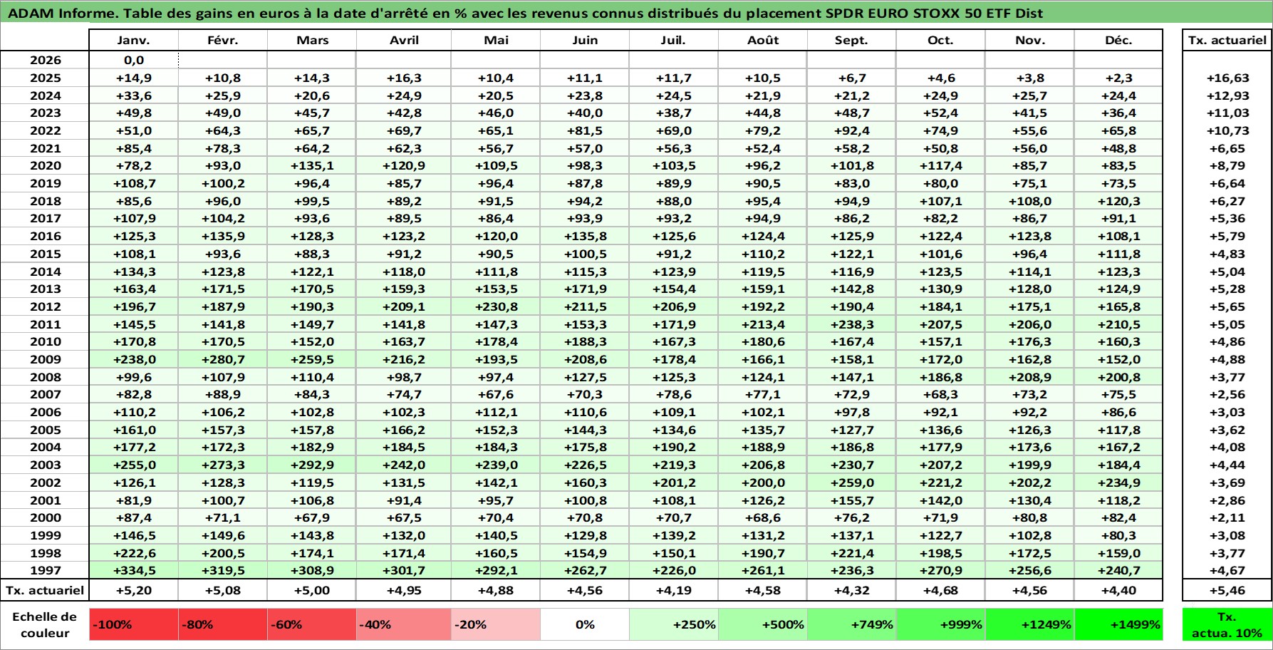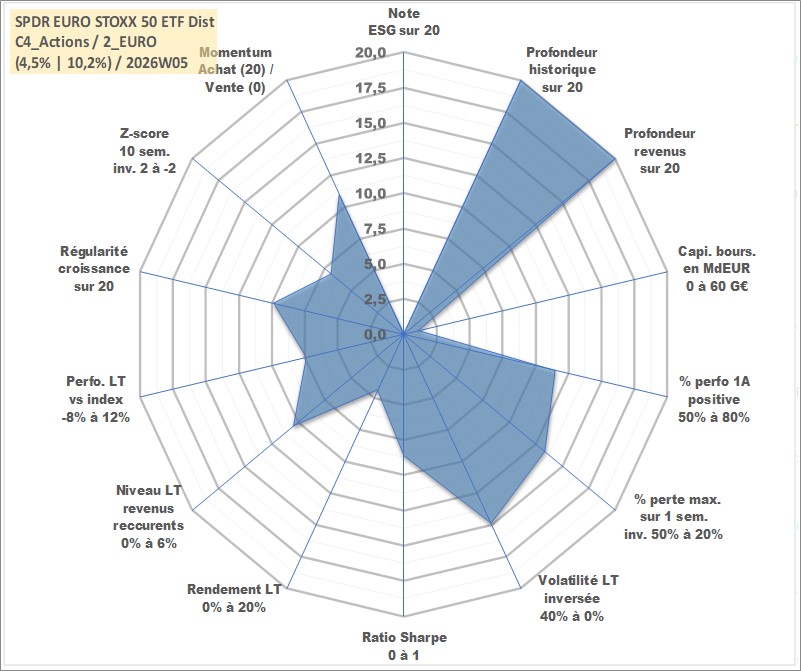 Site dédié aux investisseursPage dédiée sur site financeAnalyse des valorisations hebdomadaires du fonds SPDR EURO STOXX 50 ETF Dist. Cet actif est cote en USD. Les valorisations sont en contrevaleur EURO et couvrent les semaines 1997W01 a 2026W05. Les revenus de cet actif financier sont pris en compte depuis la semaine 1997W12. La note ESG de cet actif n'est pas connue.
