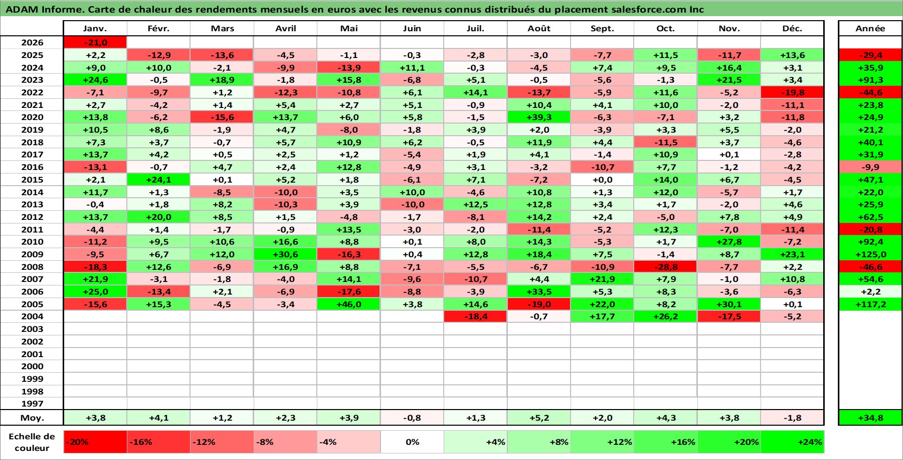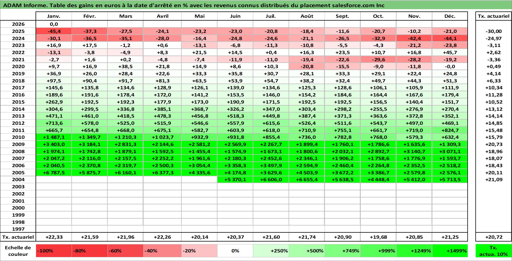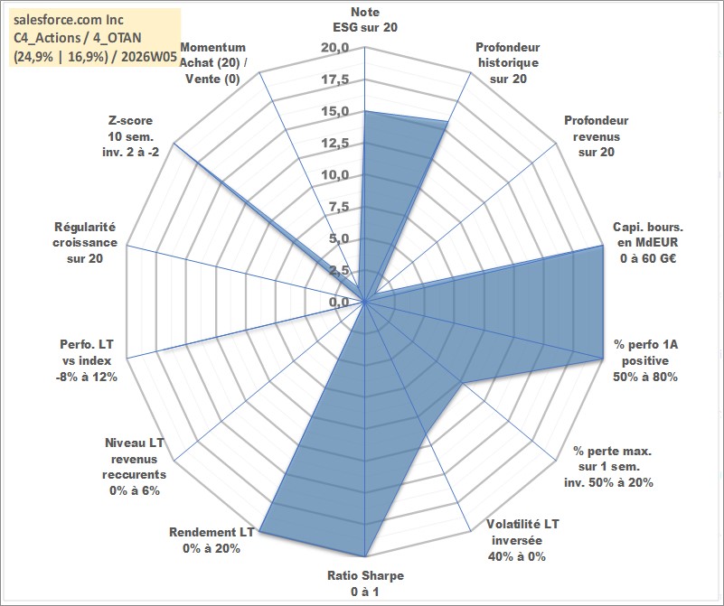 Site dédié aux investisseursPage dédiée sur site financeAnalyse des valorisations hebdomadaires de l'action salesforce.com Inc. Cet actif est cote en USD. Les valorisations sont en contrevaleur EURO et couvrent les semaines 2004W26 a 2026W05. Les revenus de cet actif financier sont pris en compte depuis la semaine 2024W11. La note globale ESG de cet actif est estimee a 15.0 (apres rebasage entre 0 et 20).