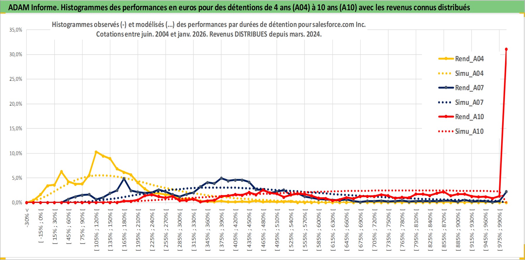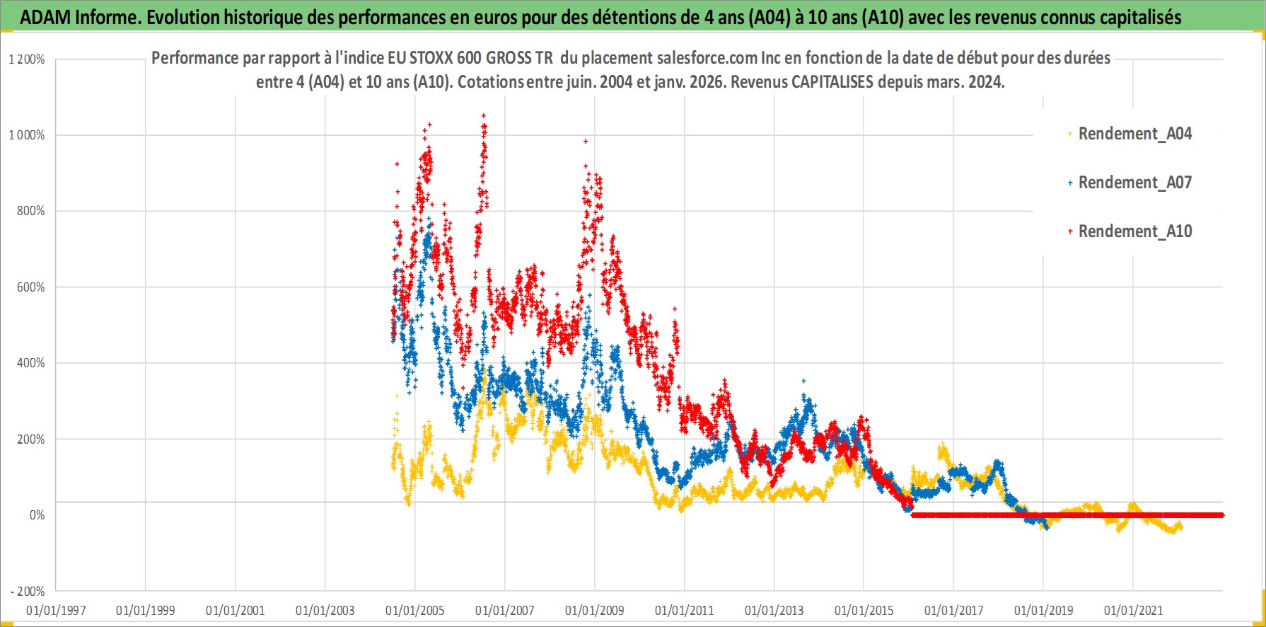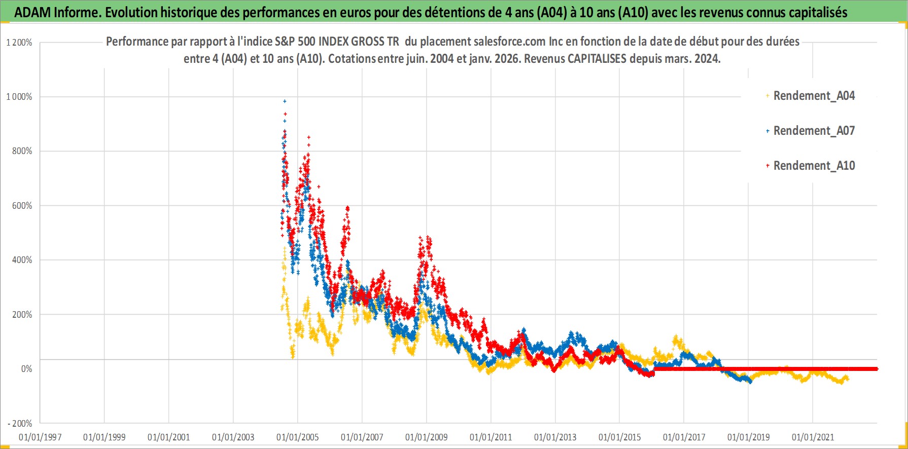 Site dédié aux investisseursPage dédiée sur site financeAnalyse des valorisations hebdomadaires de l'action salesforce.com Inc. Cet actif est cote en USD. Les valorisations sont en contrevaleur EURO et couvrent les semaines 2004W26 a 2026W05. Les revenus de cet actif financier sont pris en compte depuis la semaine 2024W11. La note globale ESG de cet actif est estimee a 15.0 (apres rebasage entre 0 et 20).