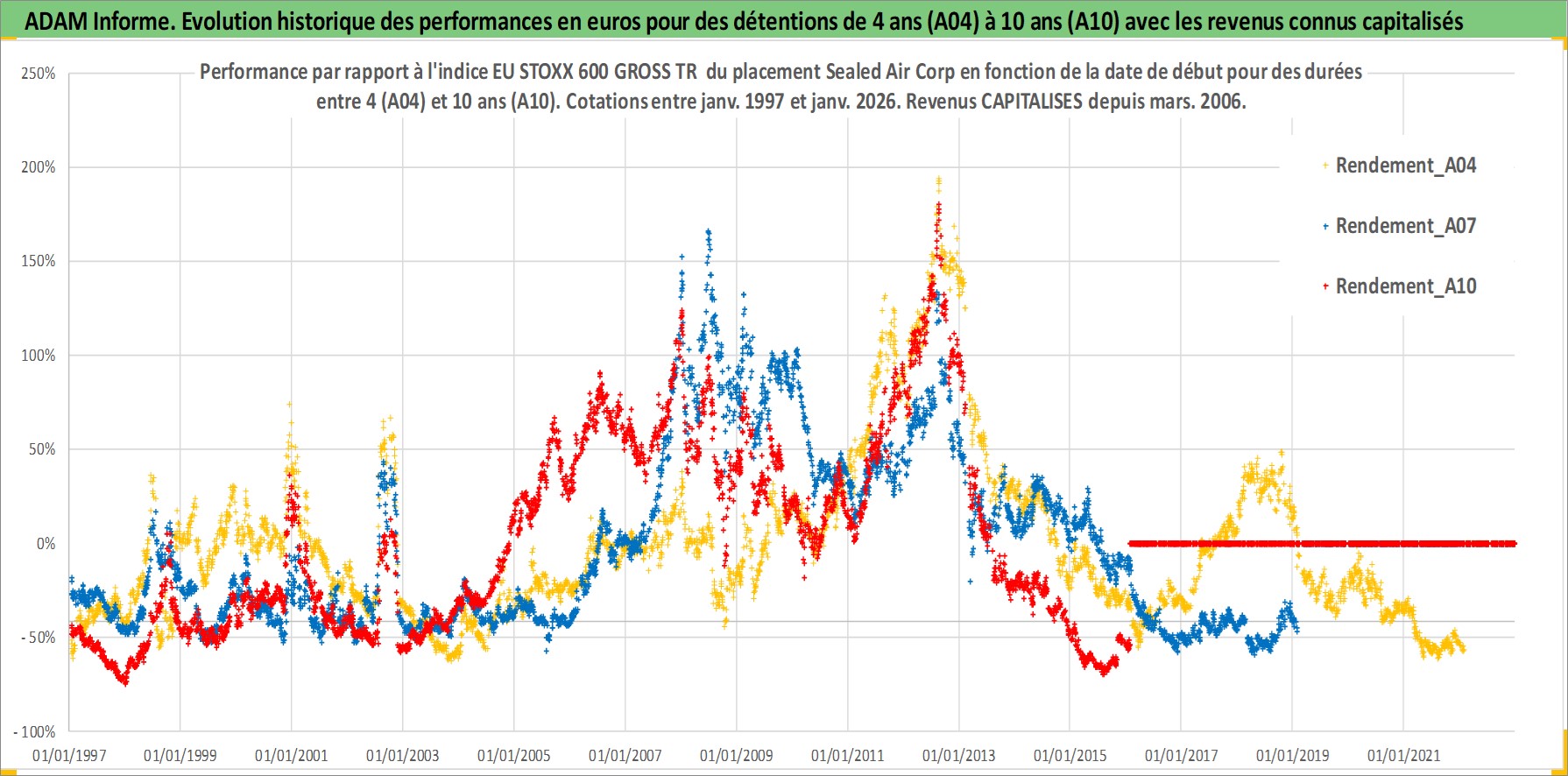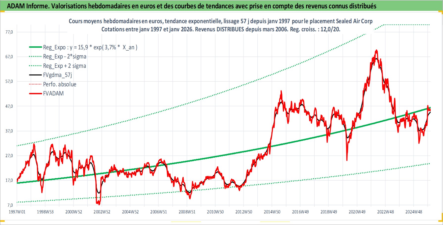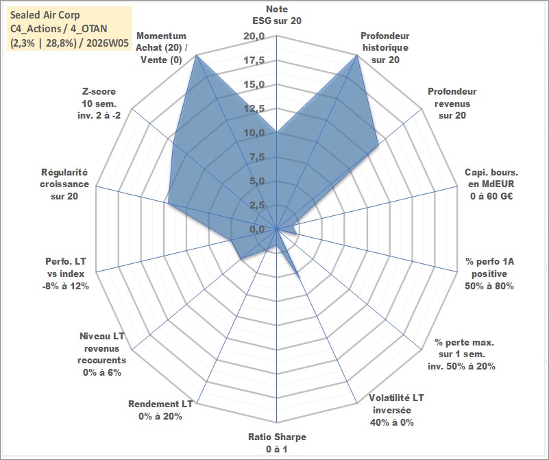 Site dédié aux investisseursPage dédiée sur site financeAnalyse des valorisations hebdomadaires de l'action Sealed Air Corp. Cet actif est cote en USD. Les valorisations sont en contrevaleur EURO et couvrent les semaines 1997W01 a 2026W05. Les revenus de cet actif financier sont pris en compte depuis la semaine 2006W09. La note globale ESG de cet actif est estimee a 10.0 (apres rebasage entre 0 et 20).