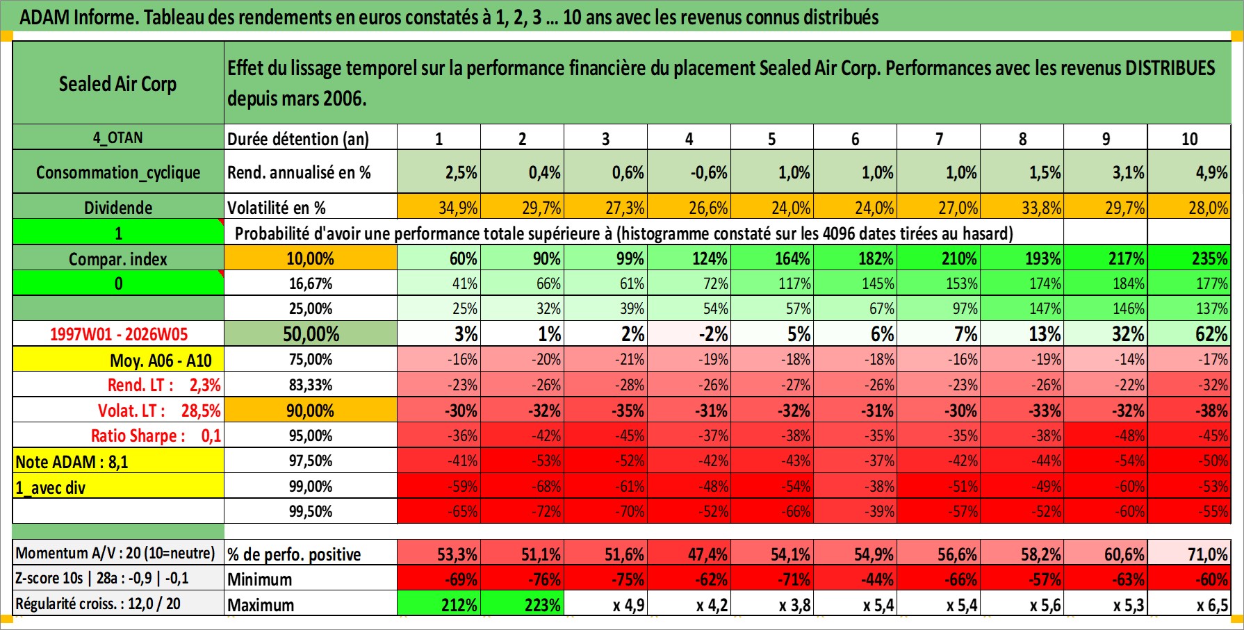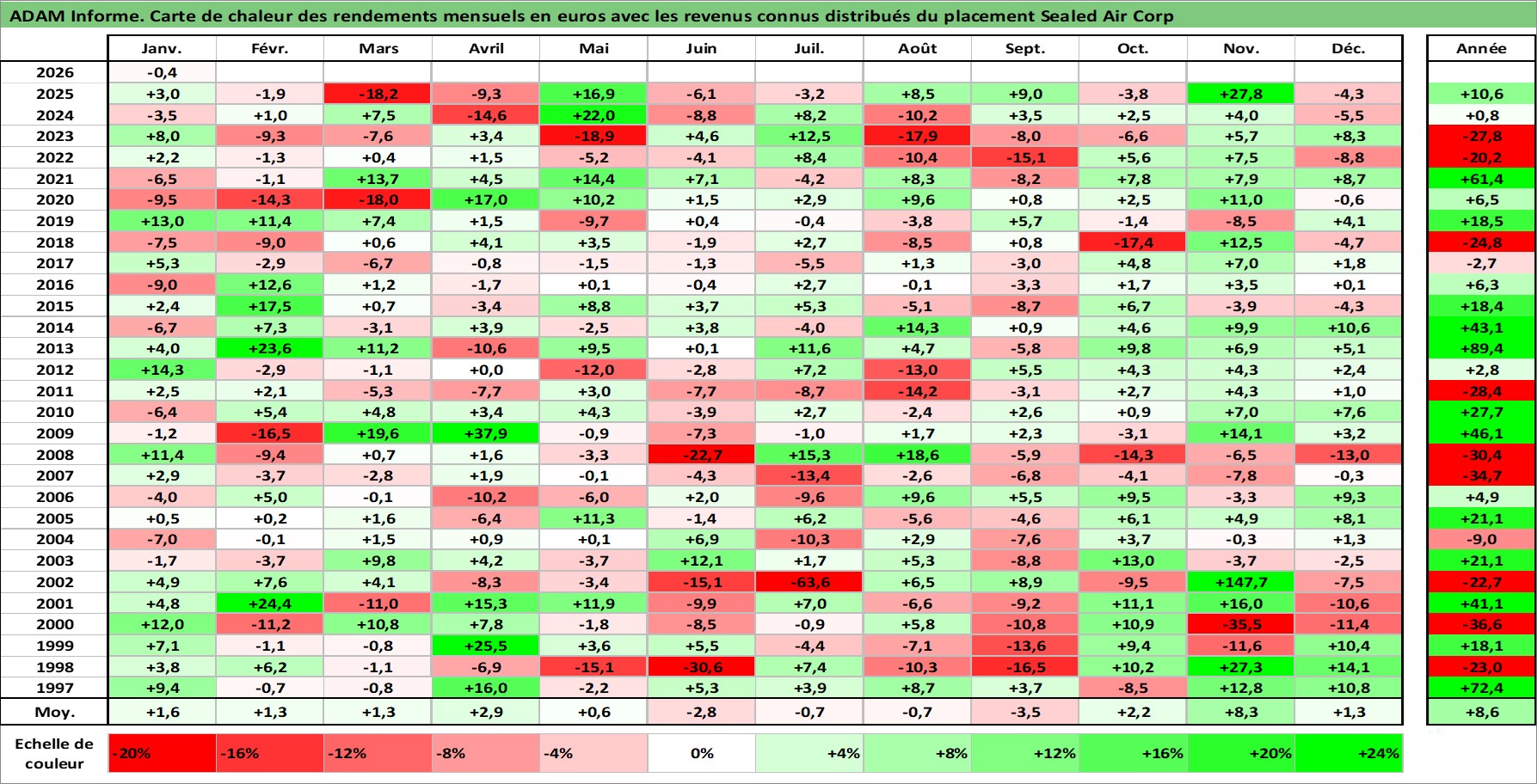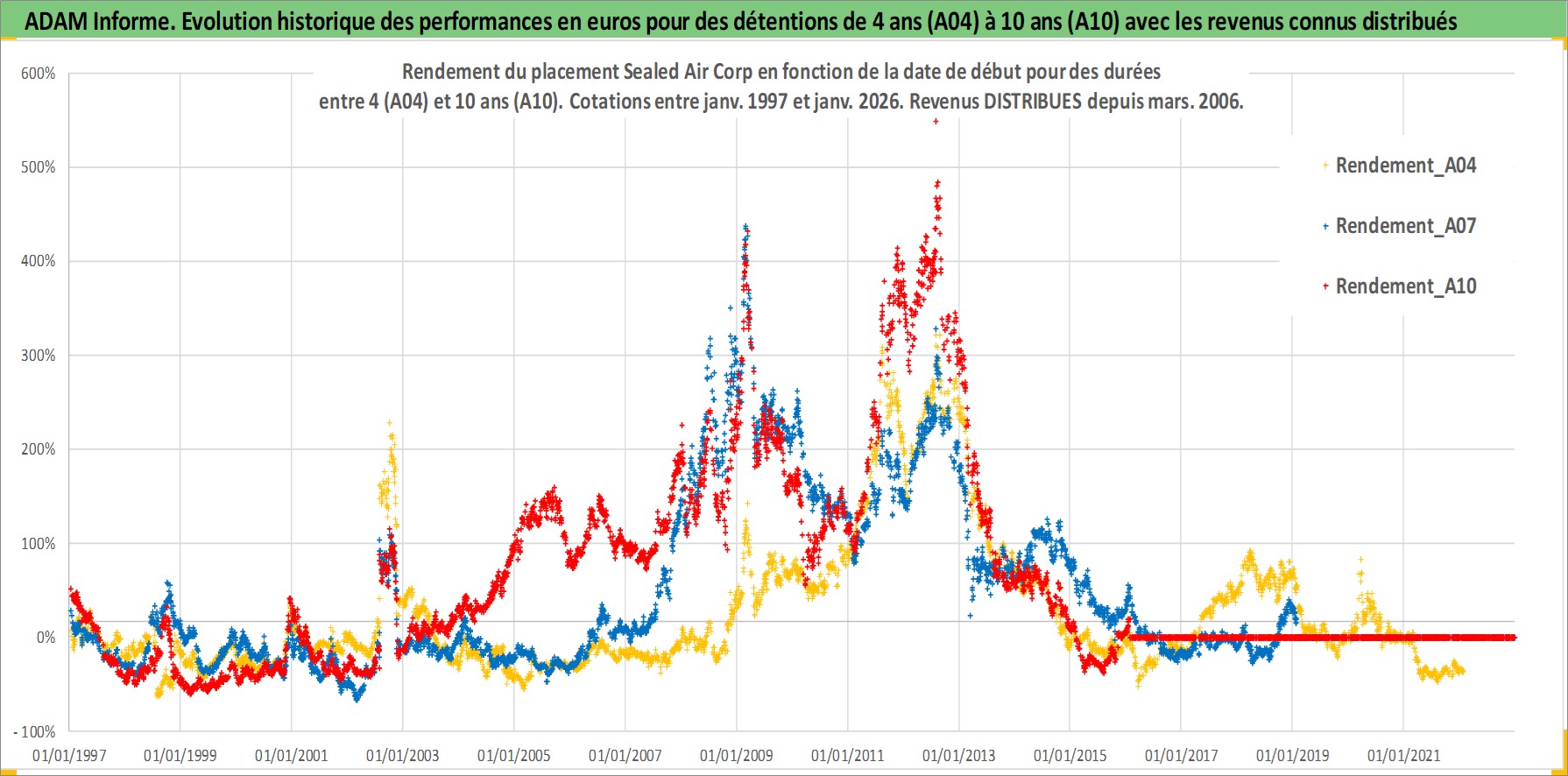 Site dédié aux investisseursPage dédiée sur site financeAnalyse des valorisations hebdomadaires de l'action Sealed Air Corp. Cet actif est cote en USD. Les valorisations sont en contrevaleur EURO et couvrent les semaines 1997W01 a 2026W05. Les revenus de cet actif financier sont pris en compte depuis la semaine 2006W09. La note globale ESG de cet actif est estimee a 10.0 (apres rebasage entre 0 et 20).