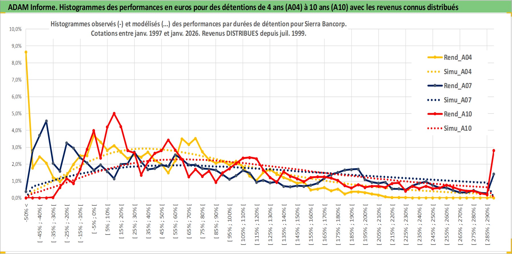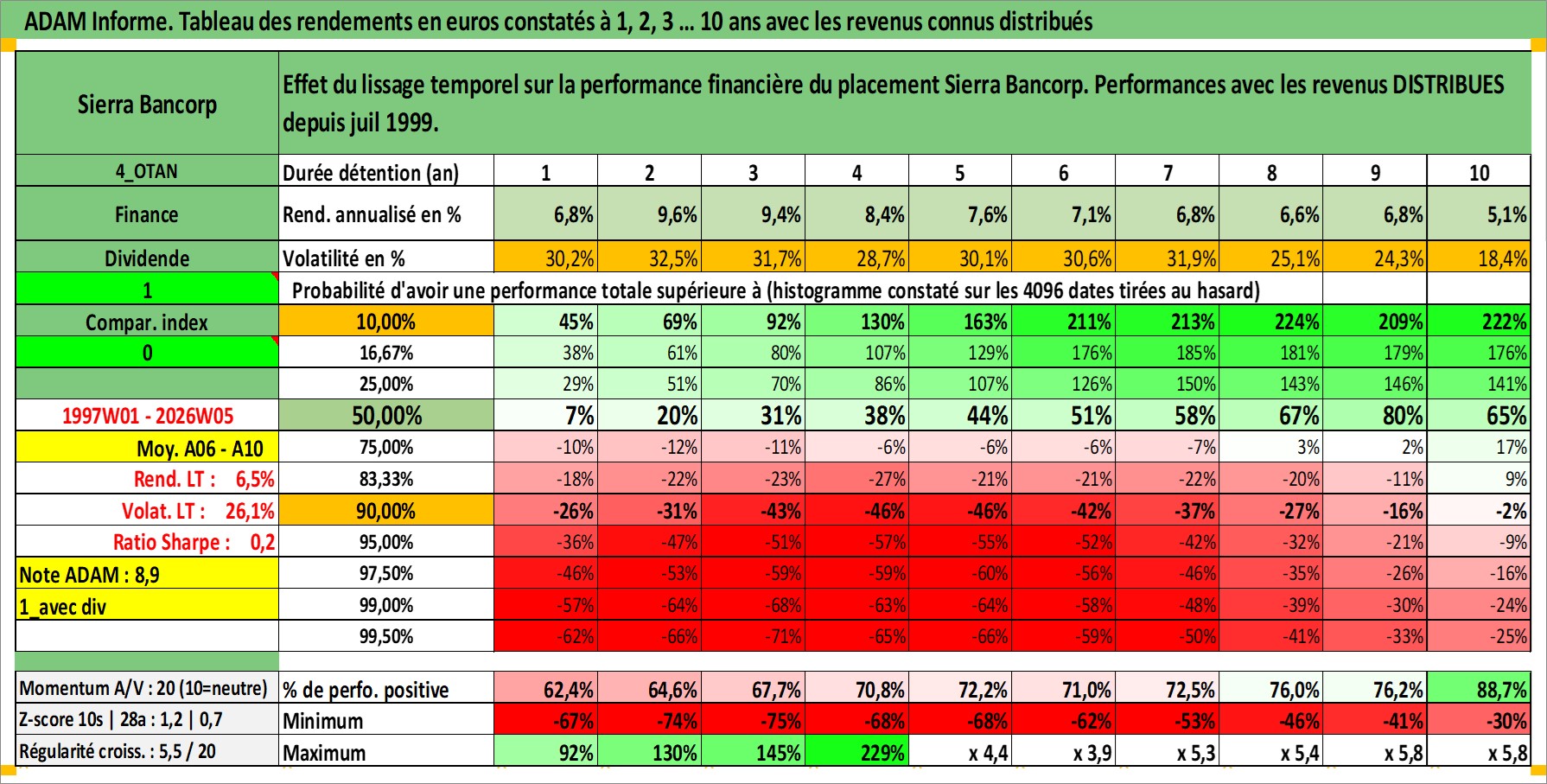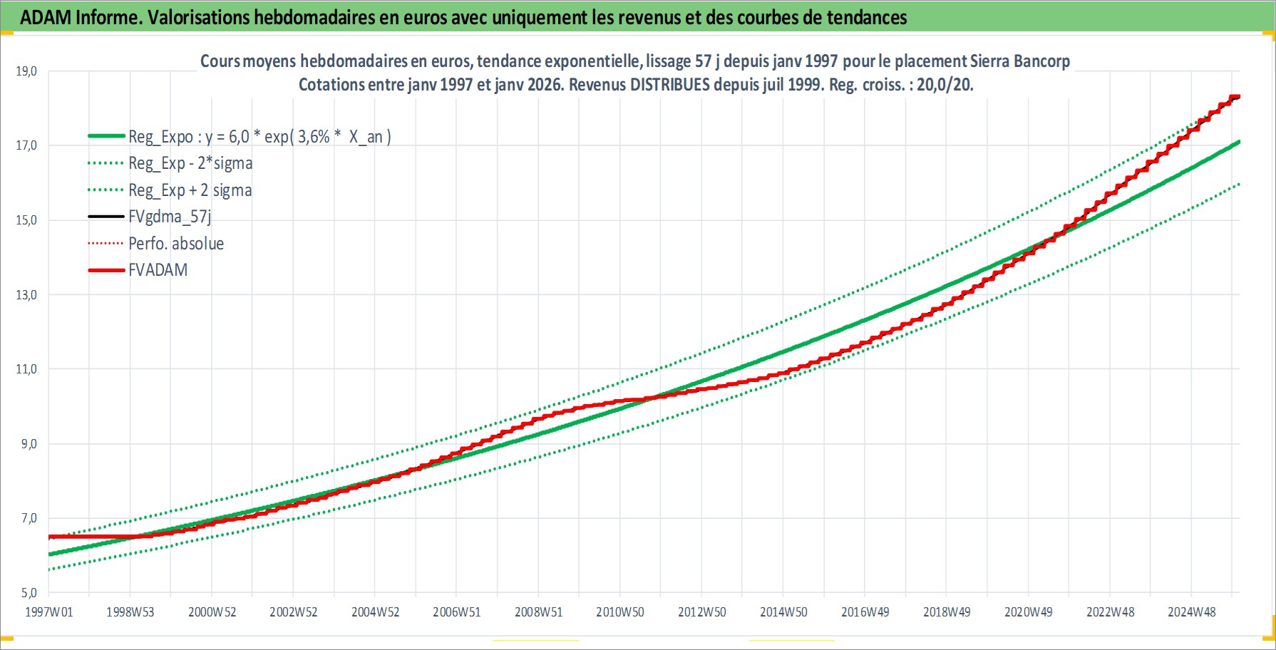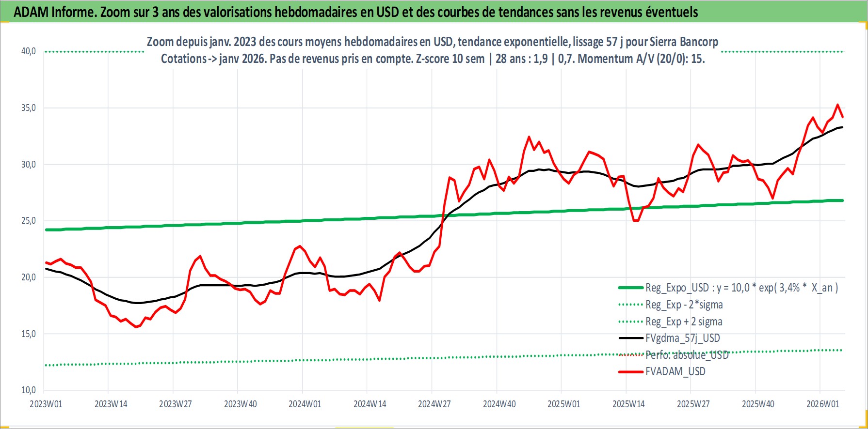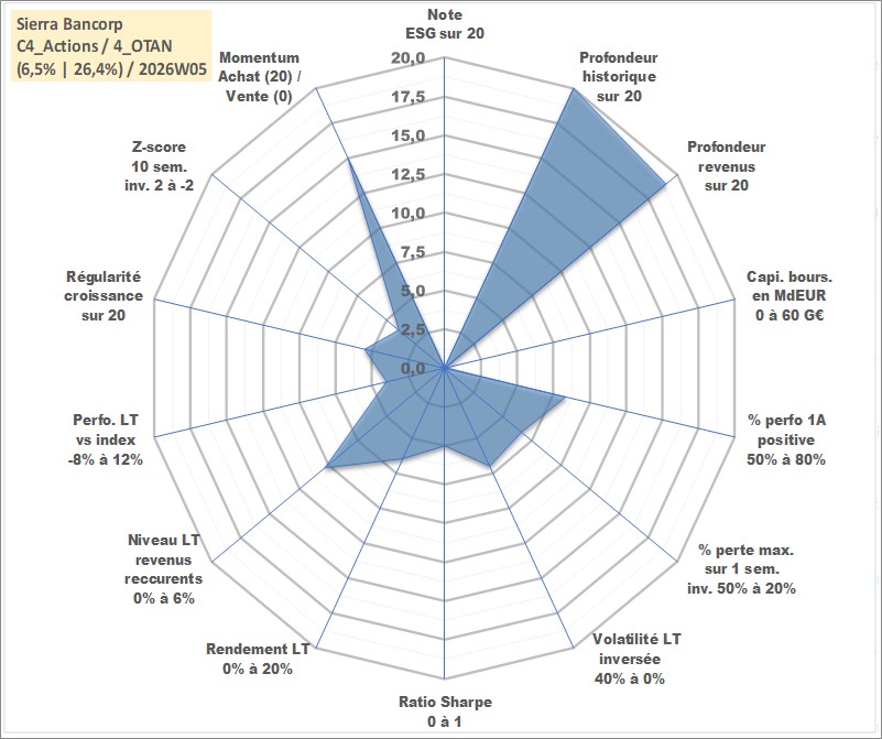Site dédié aux investisseursPage dédiée sur site financeAnalyse des valorisations hebdomadaires de l'action Sierra Bancorp. Cet actif est cote en USD. Les valorisations sont en contrevaleur EURO et couvrent les semaines 1997W01 a 2026W05. Les revenus de cet actif financier sont pris en compte depuis la semaine 1999W29. La note ESG de cet actif n'est pas connue.