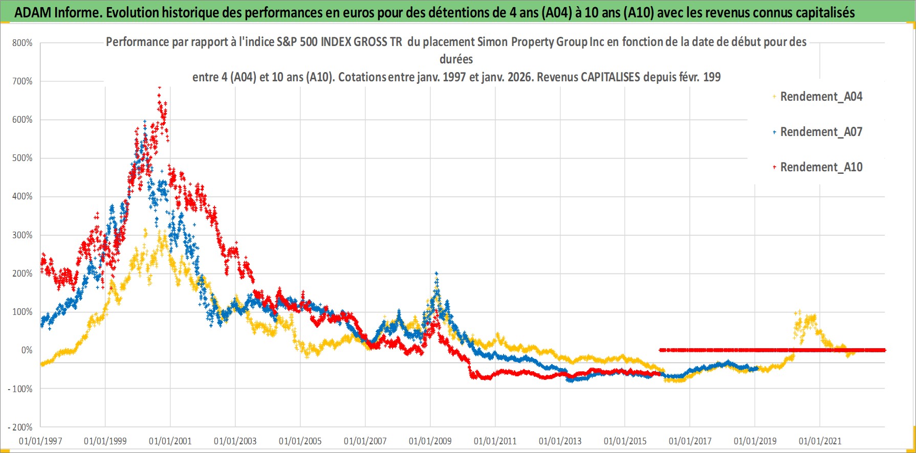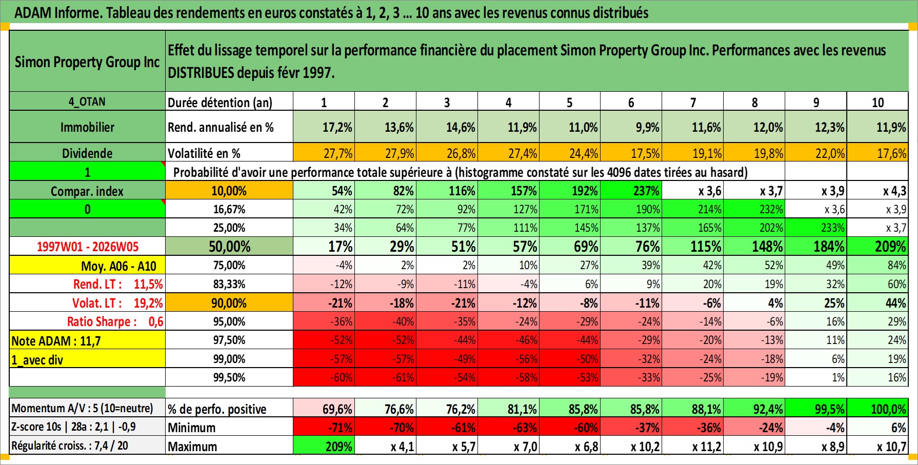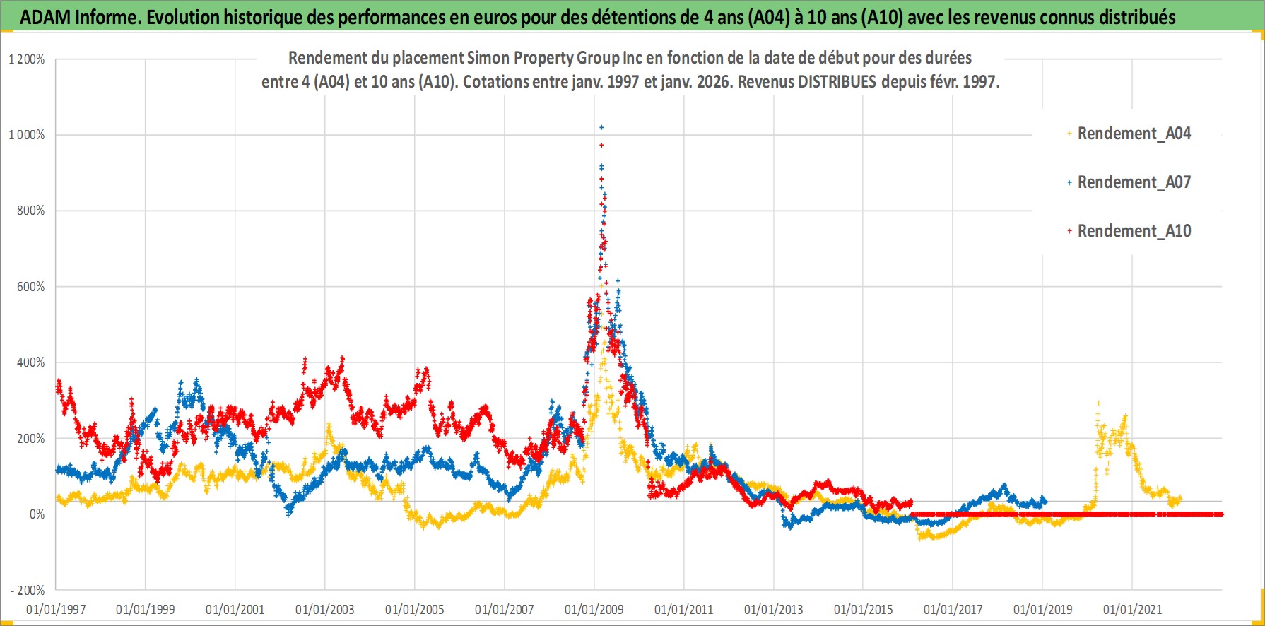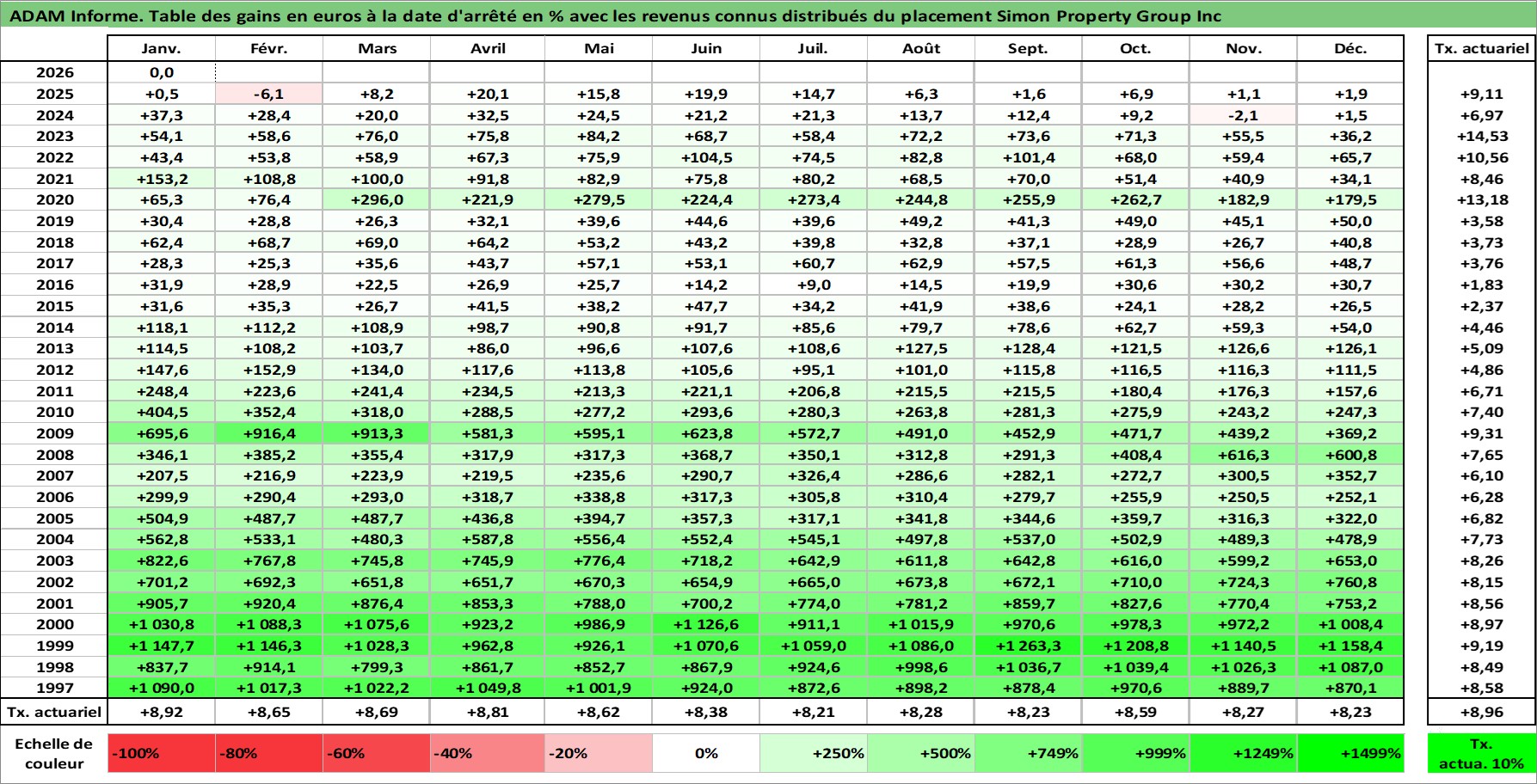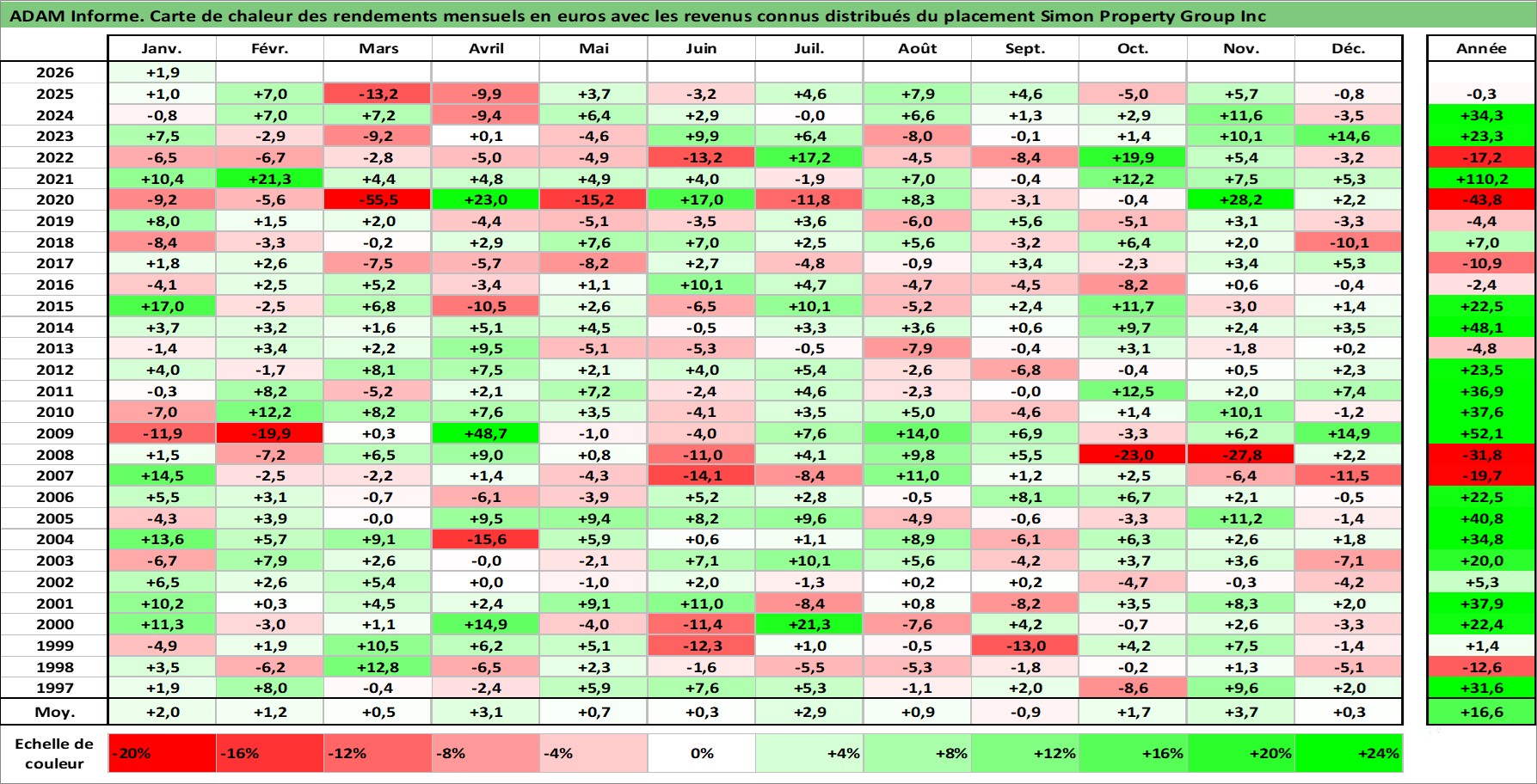 Site dédié aux investisseursPage dédiée sur site financeAnalyse des valorisations hebdomadaires de l'action Simon Property Group Inc. Cet actif est cote en USD. Les valorisations sont en contrevaleur EURO et couvrent les semaines 1997W01 a 2026W05. Les revenus de cet actif financier sont pris en compte depuis la semaine 1997W06. La note globale ESG de cet actif est estimee a 14.0 (apres rebasage entre 0 et 20).