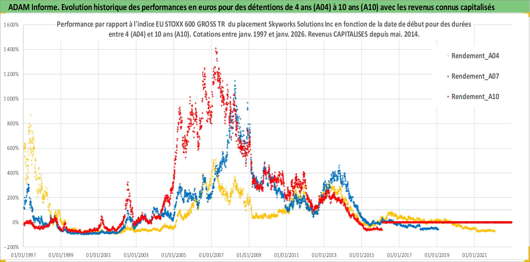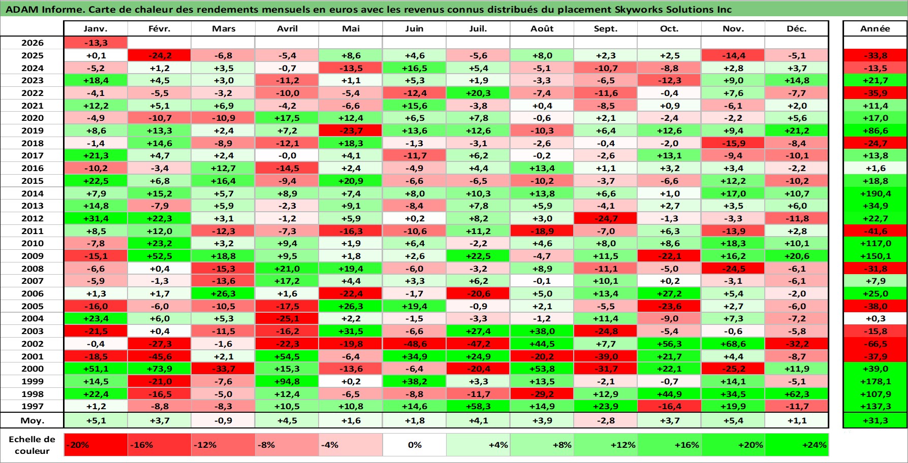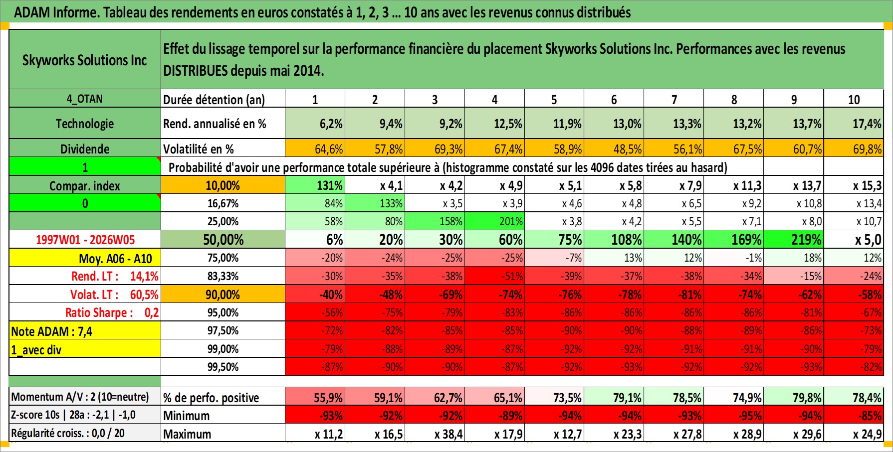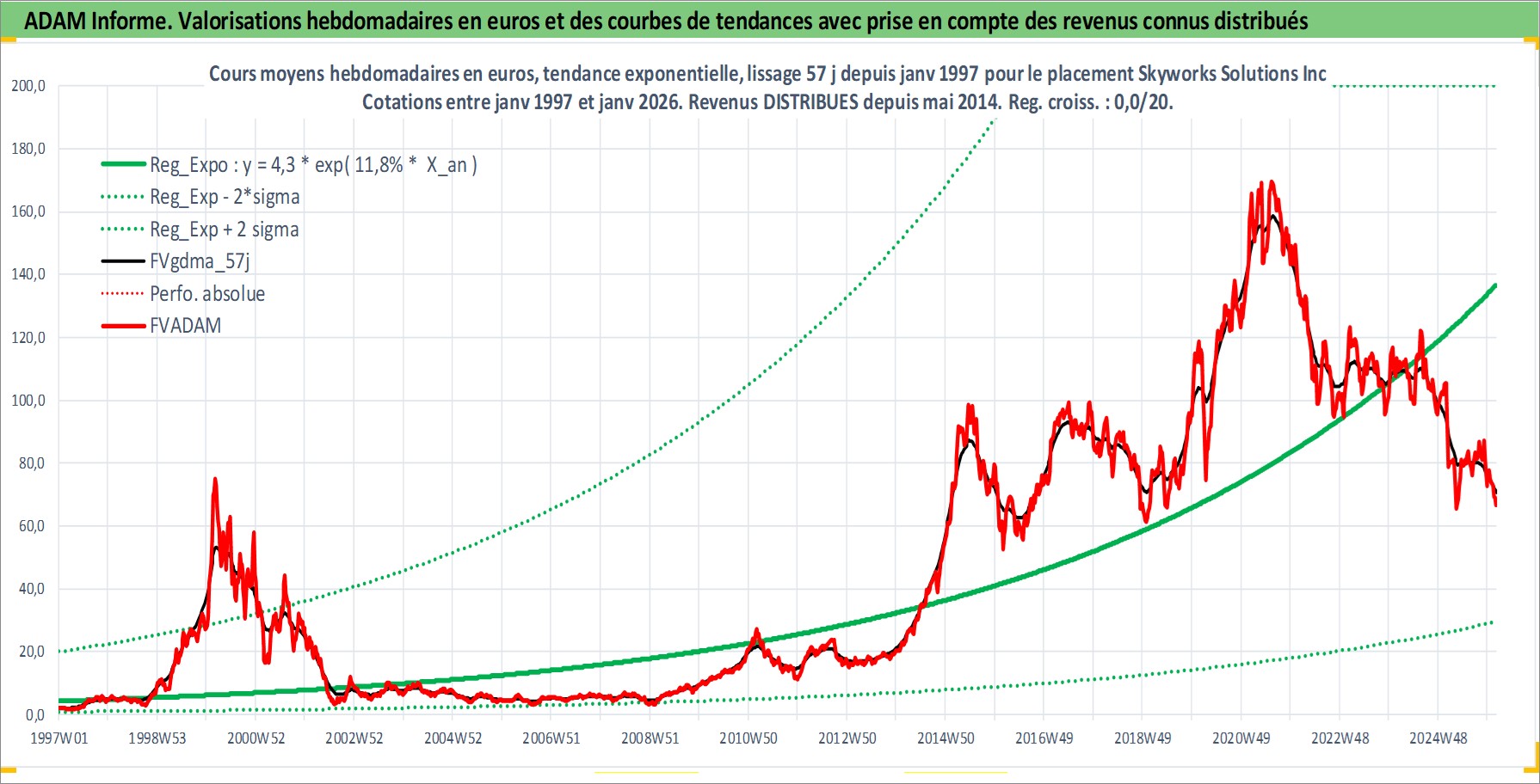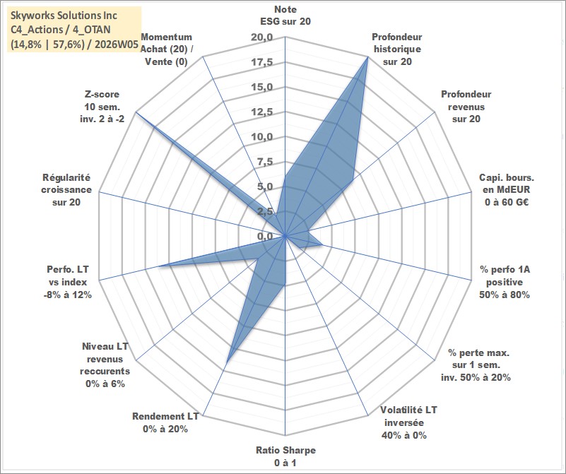 Site dédié aux investisseursPage dédiée sur site financeAnalyse des valorisations hebdomadaires de l'action Skyworks Solutions Inc. Cet actif est cote en USD. Les valorisations sont en contrevaleur EURO et couvrent les semaines 1997W01 a 2026W05. Les revenus de cet actif financier sont pris en compte depuis la semaine 2014W19. La note globale ESG de cet actif est estimee a 6.0 (apres rebasage entre 0 et 20).