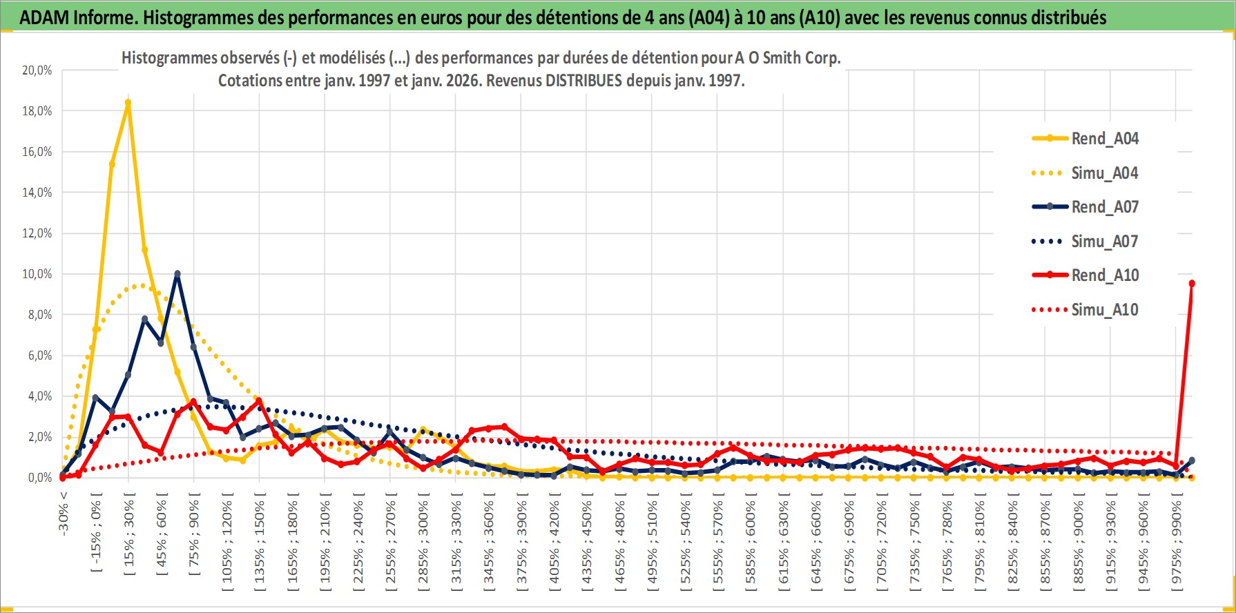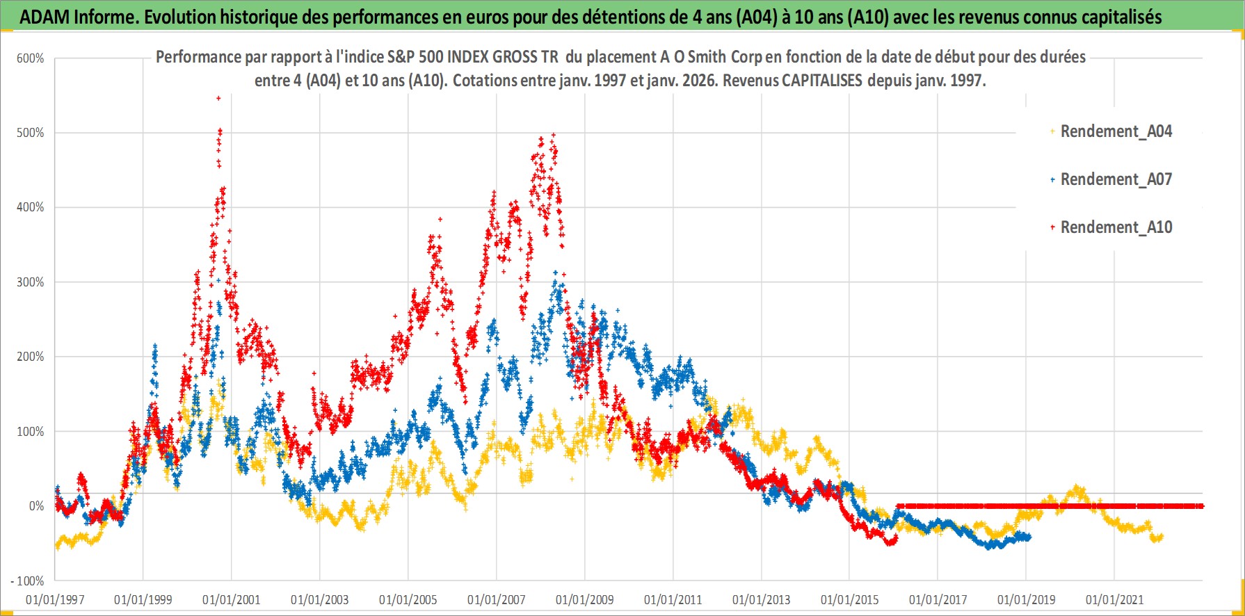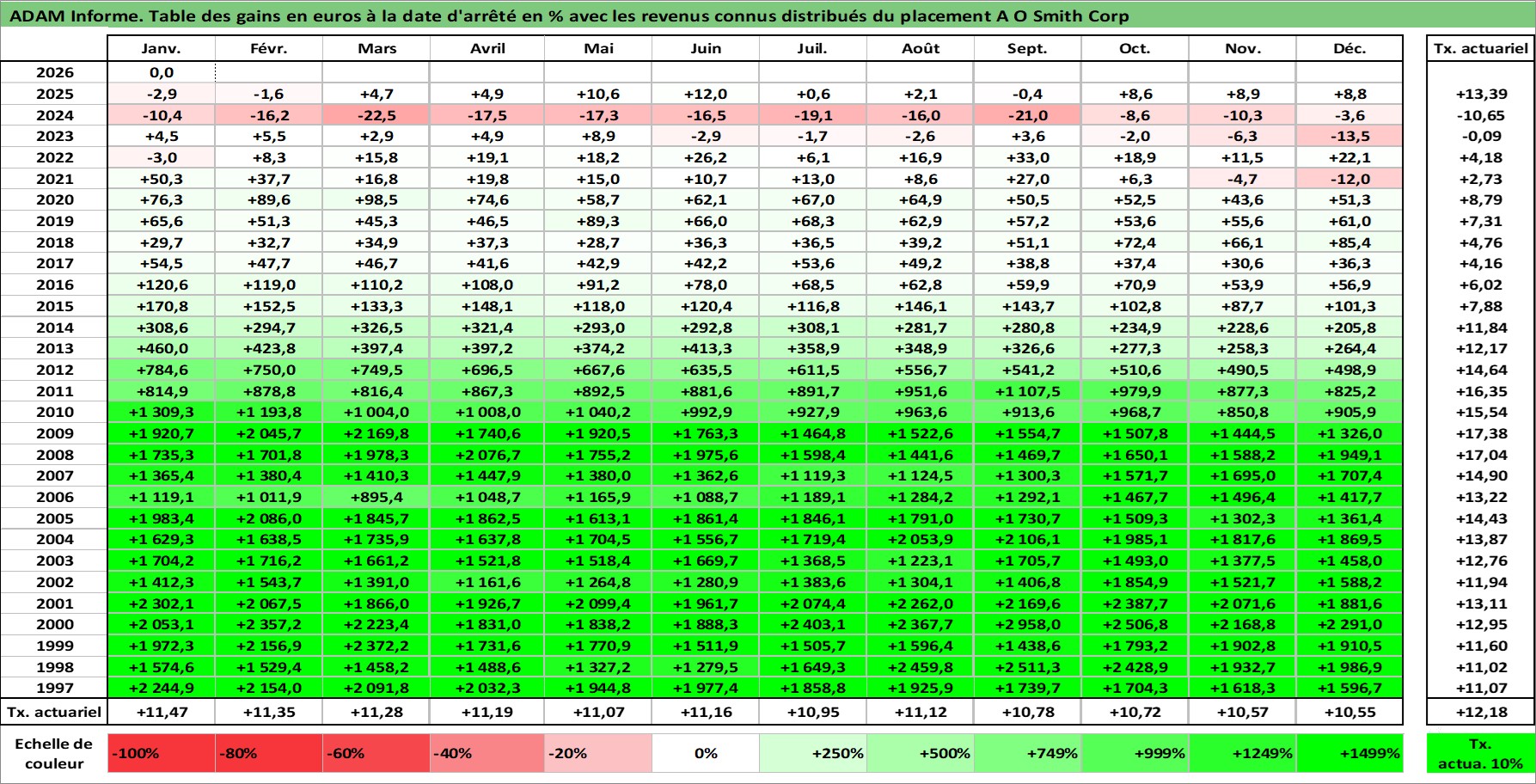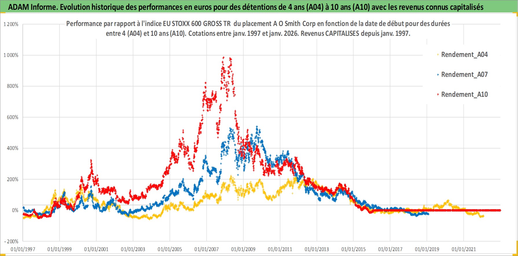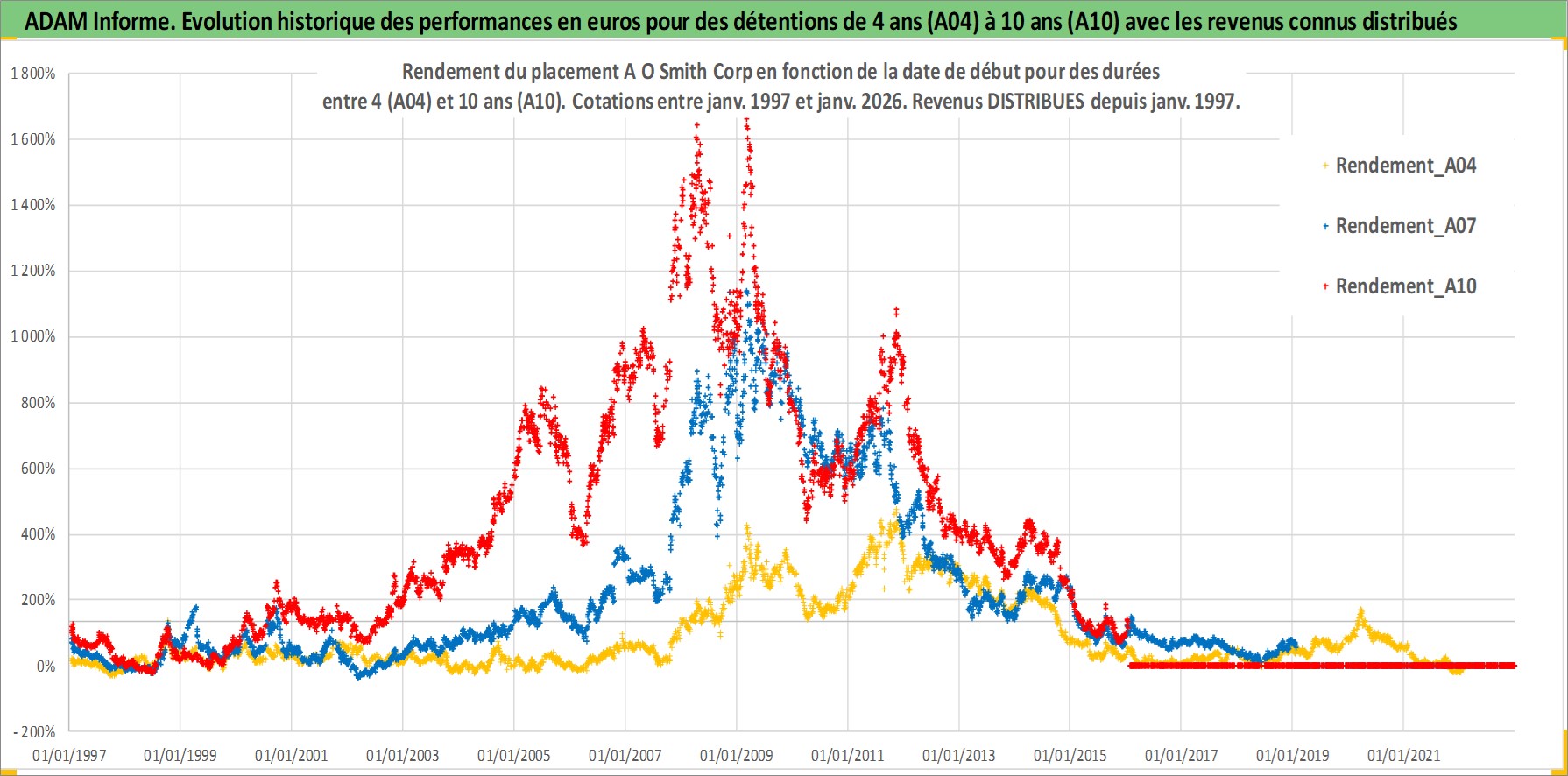 Site dédié aux investisseursPage dédiée sur site financeAnalyse des valorisations hebdomadaires de l'action A O Smith Corp. Cet actif est cote en USD. Les valorisations sont en contrevaleur EURO et couvrent les semaines 1997W01 a 2026W05. Les revenus de cet actif financier sont pris en compte depuis la semaine 1997W05. La note globale ESG de cet actif est estimee a 7.0 (apres rebasage entre 0 et 20).