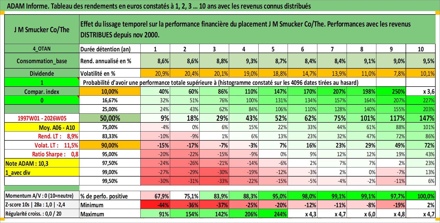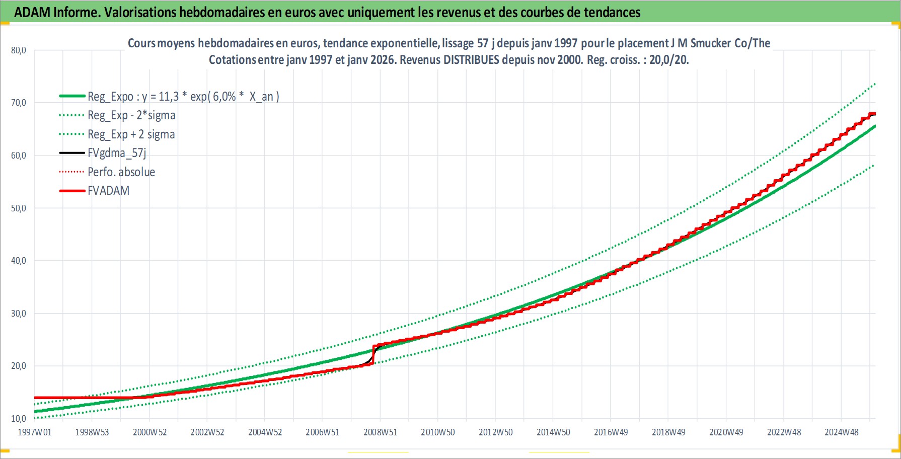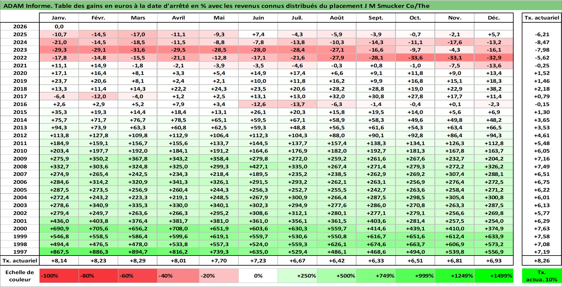 Site dédié aux investisseursPage dédiée sur site financeAnalyse des valorisations hebdomadaires de l'action J M Smucker Co/The. Cet actif est cote en USD. Les valorisations sont en contrevaleur EURO et couvrent les semaines 1997W01 a 2026W05. Les revenus de cet actif financier sont pris en compte depuis la semaine 2000W46. La note globale ESG de cet actif est estimee a 5.0 (apres rebasage entre 0 et 20).