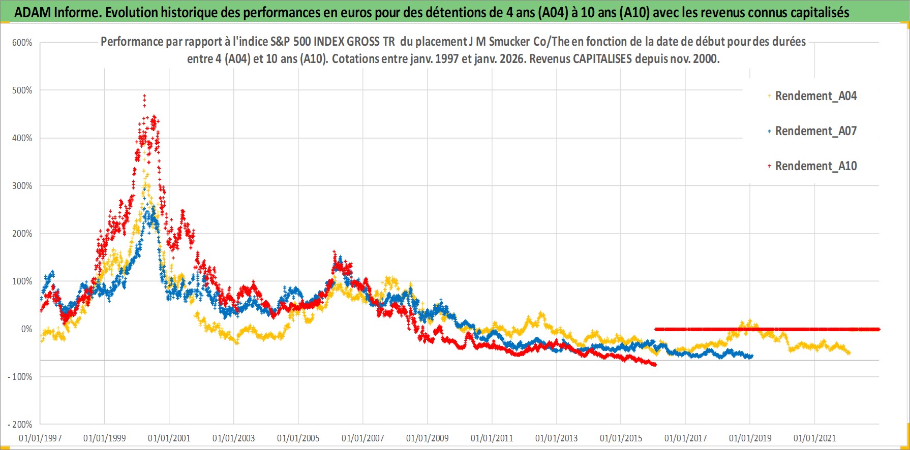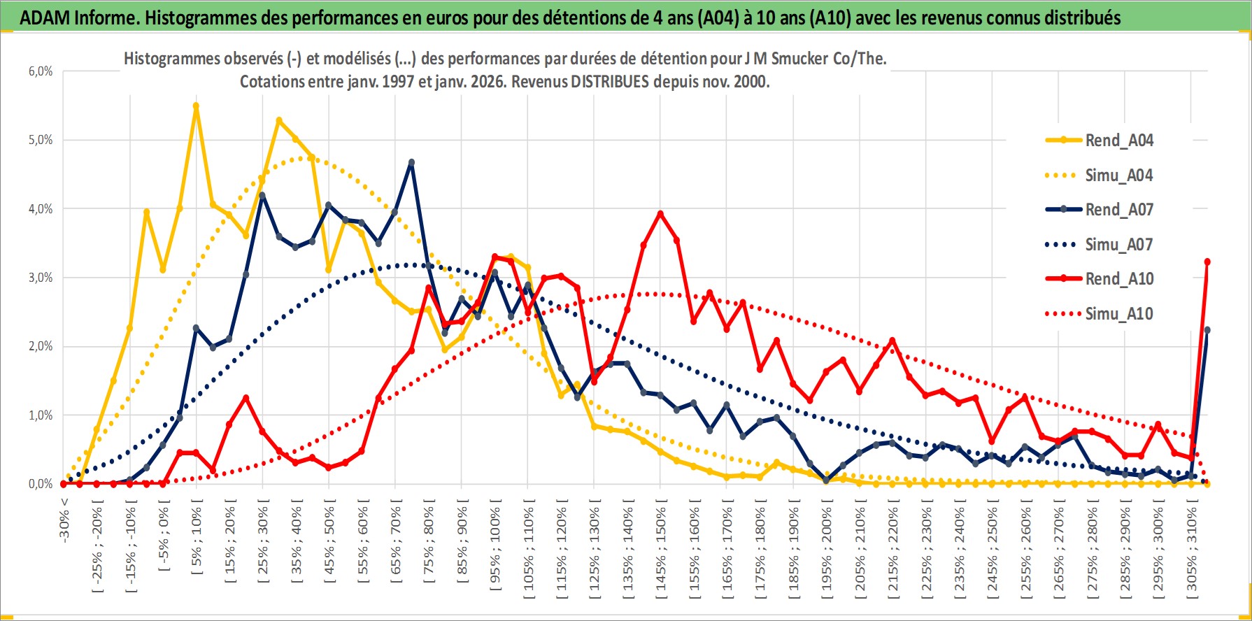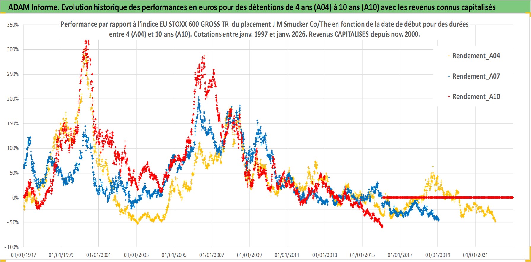 Site dédié aux investisseursPage dédiée sur site financeAnalyse des valorisations hebdomadaires de l'action J M Smucker Co/The. Cet actif est cote en USD. Les valorisations sont en contrevaleur EURO et couvrent les semaines 1997W01 a 2026W05. Les revenus de cet actif financier sont pris en compte depuis la semaine 2000W46. La note globale ESG de cet actif est estimee a 5.0 (apres rebasage entre 0 et 20).