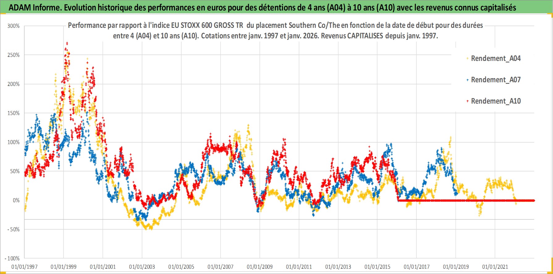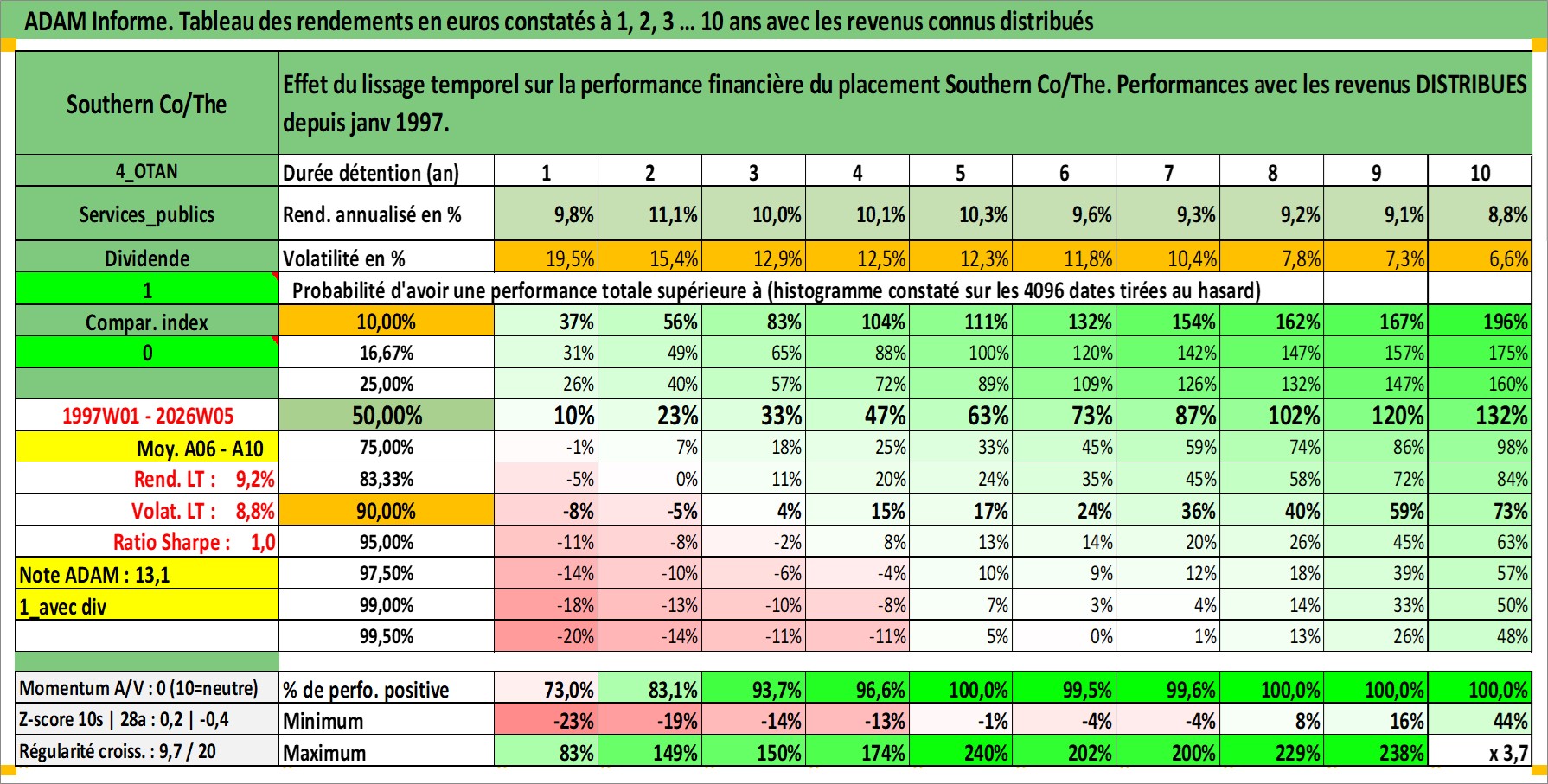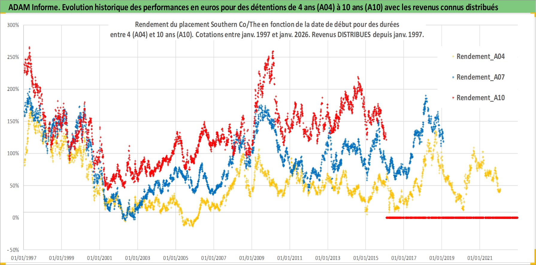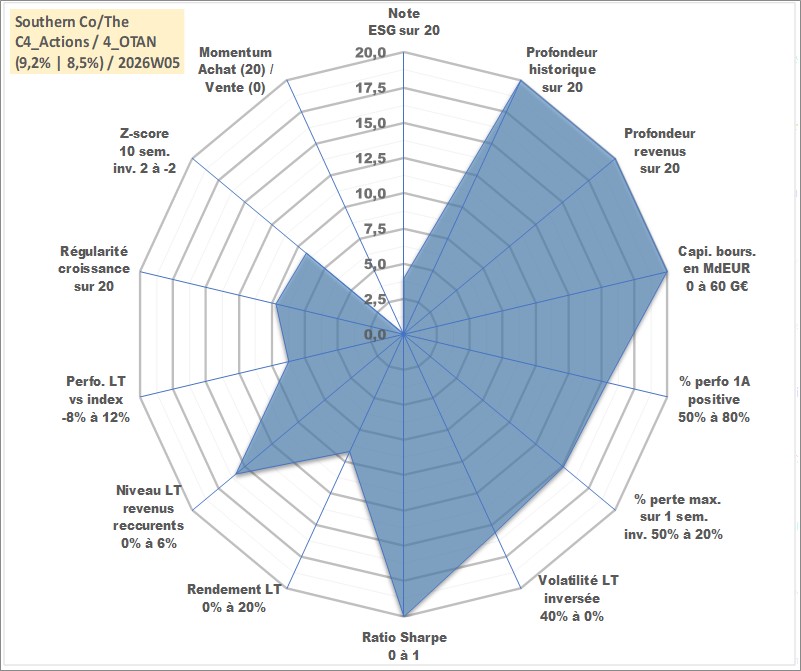 Site dédié aux investisseursPage dédiée sur site financeAnalyse des valorisations hebdomadaires de l'action Southern Co/The. Cet actif est cote en USD. Les valorisations sont en contrevaleur EURO et couvrent les semaines 1997W01 a 2026W05. Les revenus de cet actif financier sont pris en compte depuis la semaine 1997W05. La note globale ESG de cet actif est estimee a 4.0 (apres rebasage entre 0 et 20).