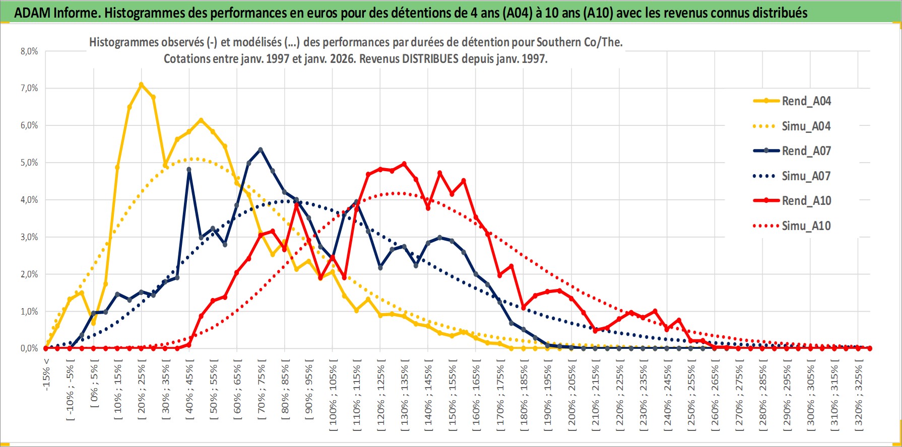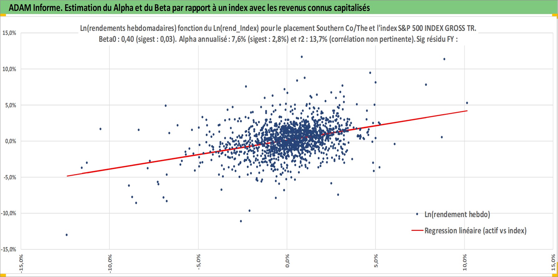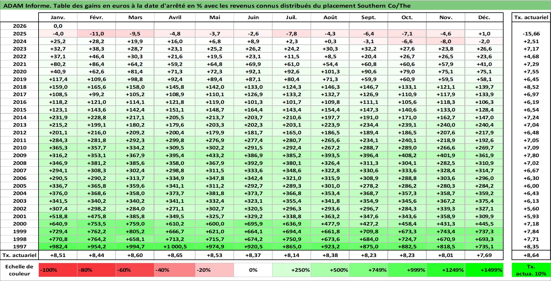Site dédié aux investisseursPage dédiée sur site financeAnalyse des valorisations hebdomadaires de l'action Southern Co/The. Cet actif est cote en USD. Les valorisations sont en contrevaleur EURO et couvrent les semaines 1997W01 a 2026W05. Les revenus de cet actif financier sont pris en compte depuis la semaine 1997W05. La note globale ESG de cet actif est estimee a 4.0 (apres rebasage entre 0 et 20).