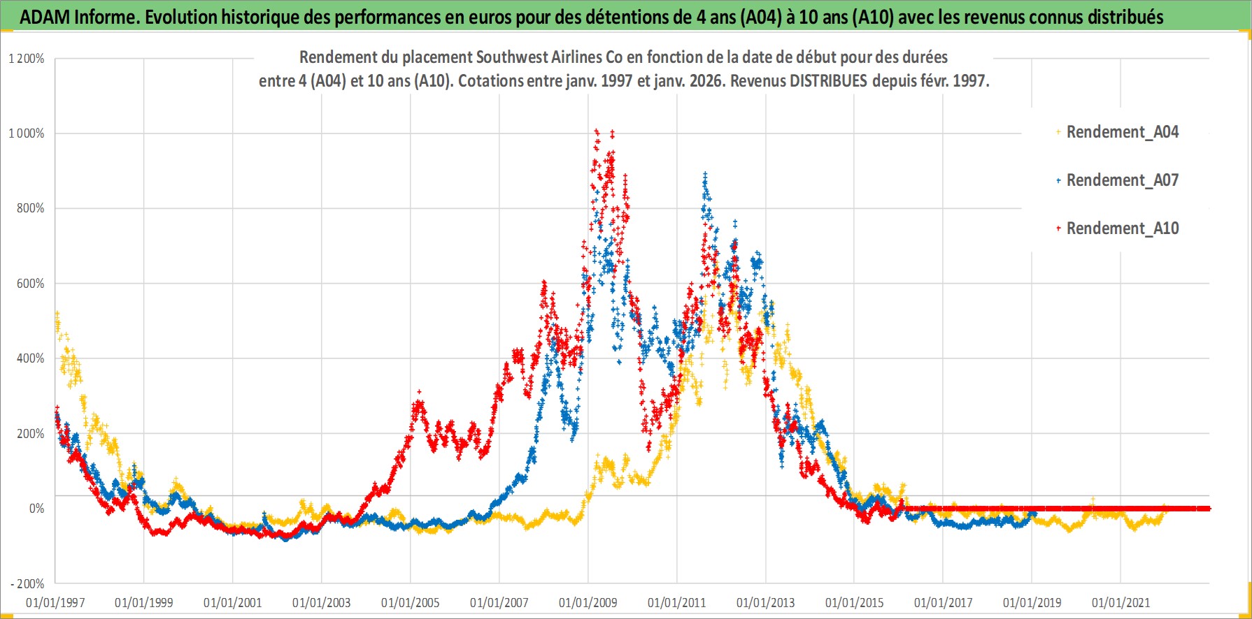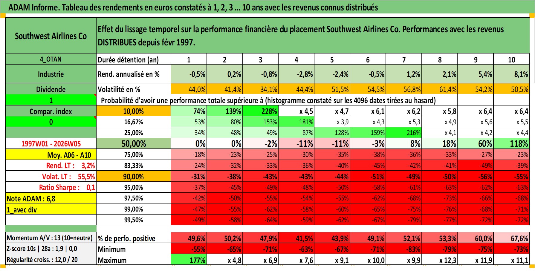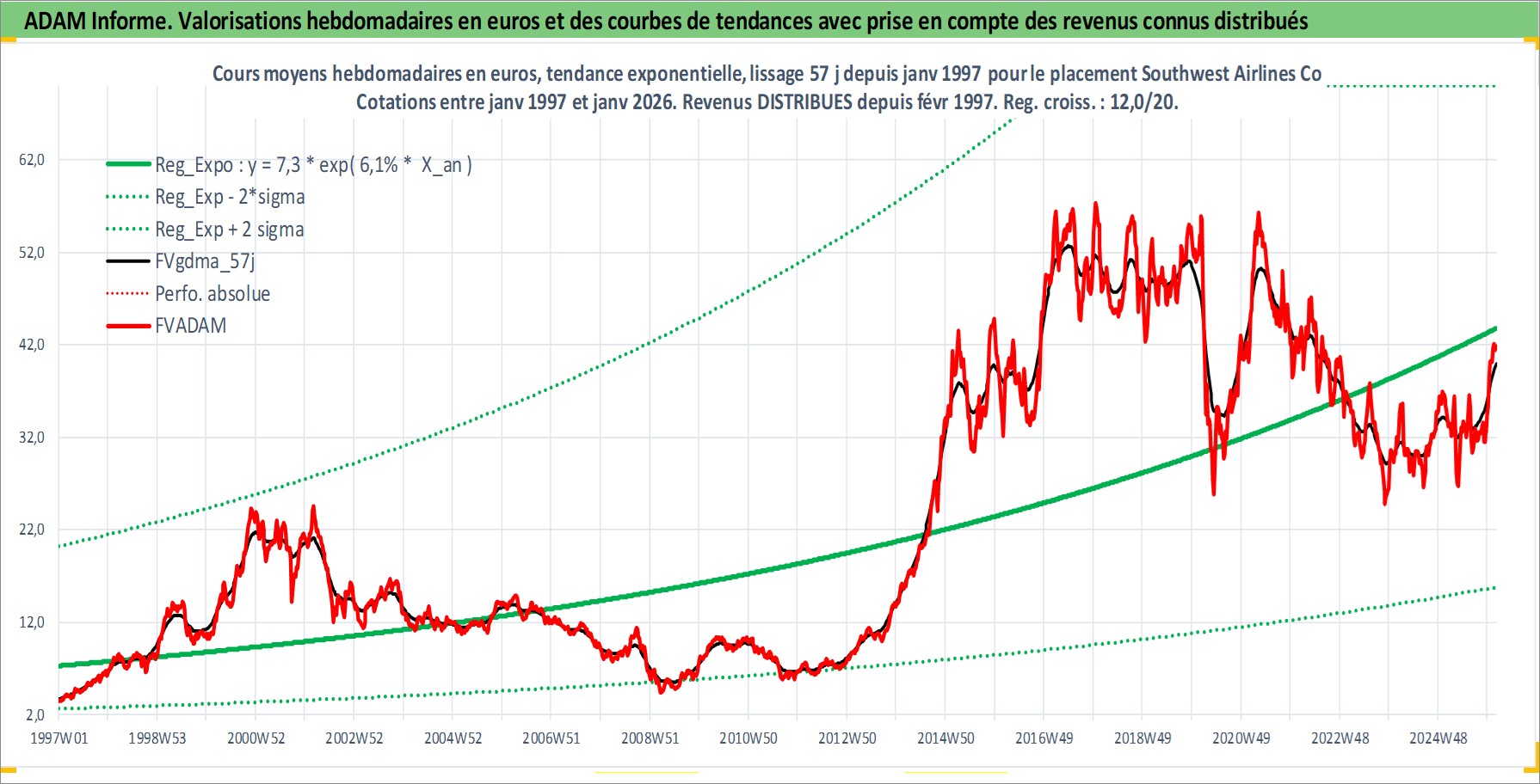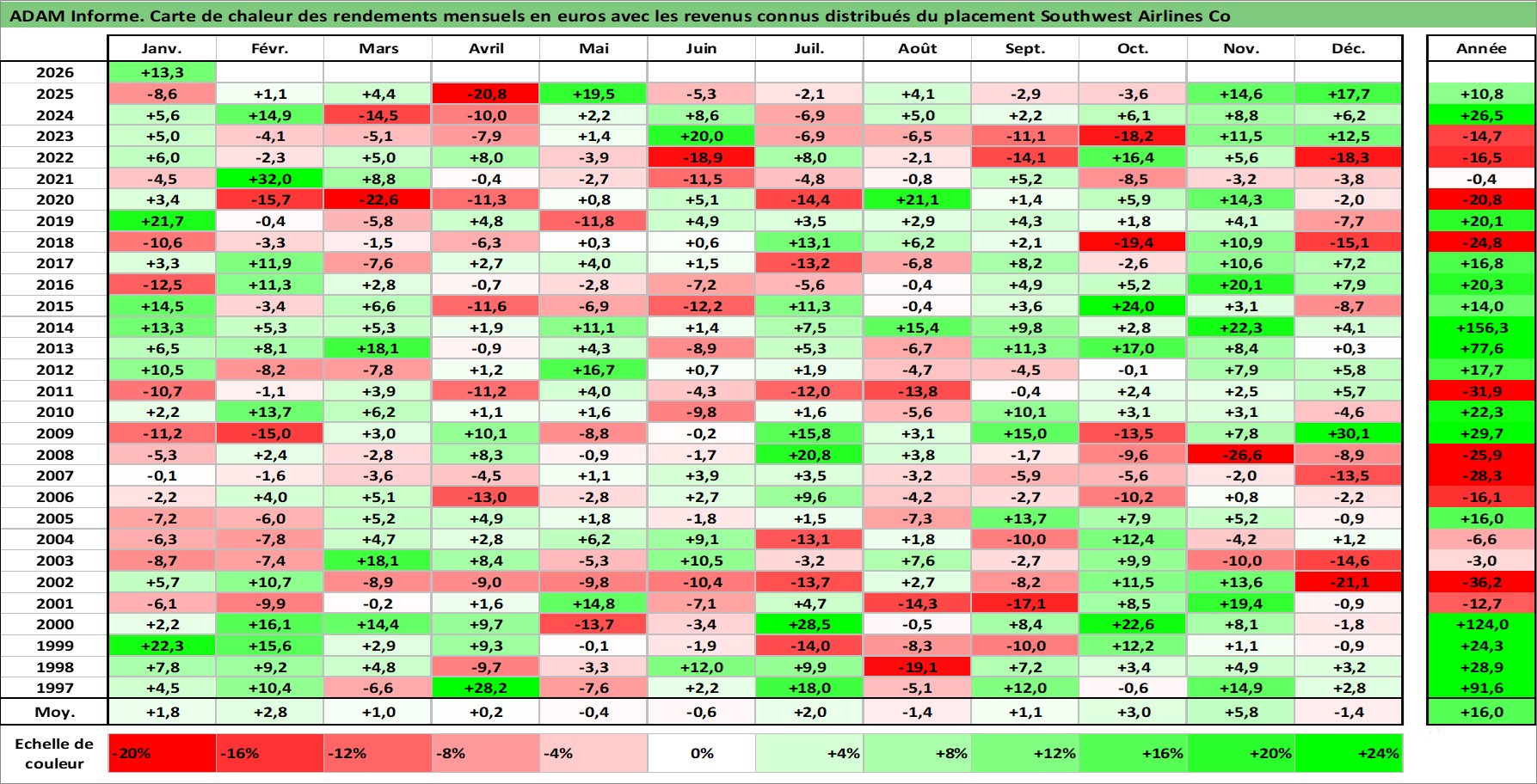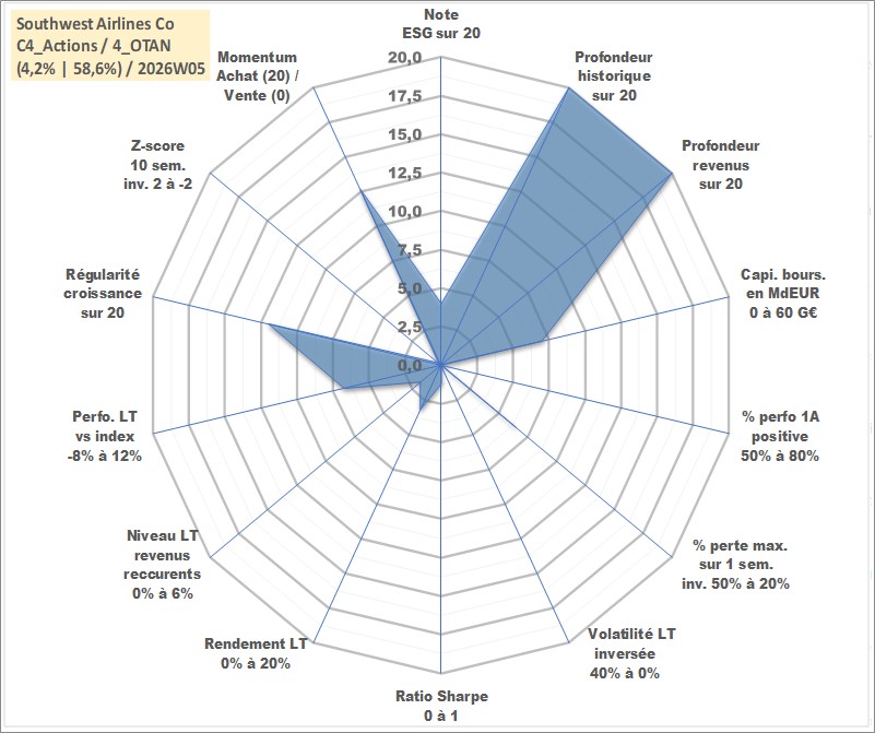 Site dédié aux investisseursPage dédiée sur site financeAnalyse des valorisations hebdomadaires de l'action Southwest Airlines Co. Cet actif est cote en USD. Les valorisations sont en contrevaleur EURO et couvrent les semaines 1997W01 a 2026W05. Les revenus de cet actif financier sont pris en compte depuis la semaine 1997W09. La note globale ESG de cet actif est estimee a 4.0 (apres rebasage entre 0 et 20).