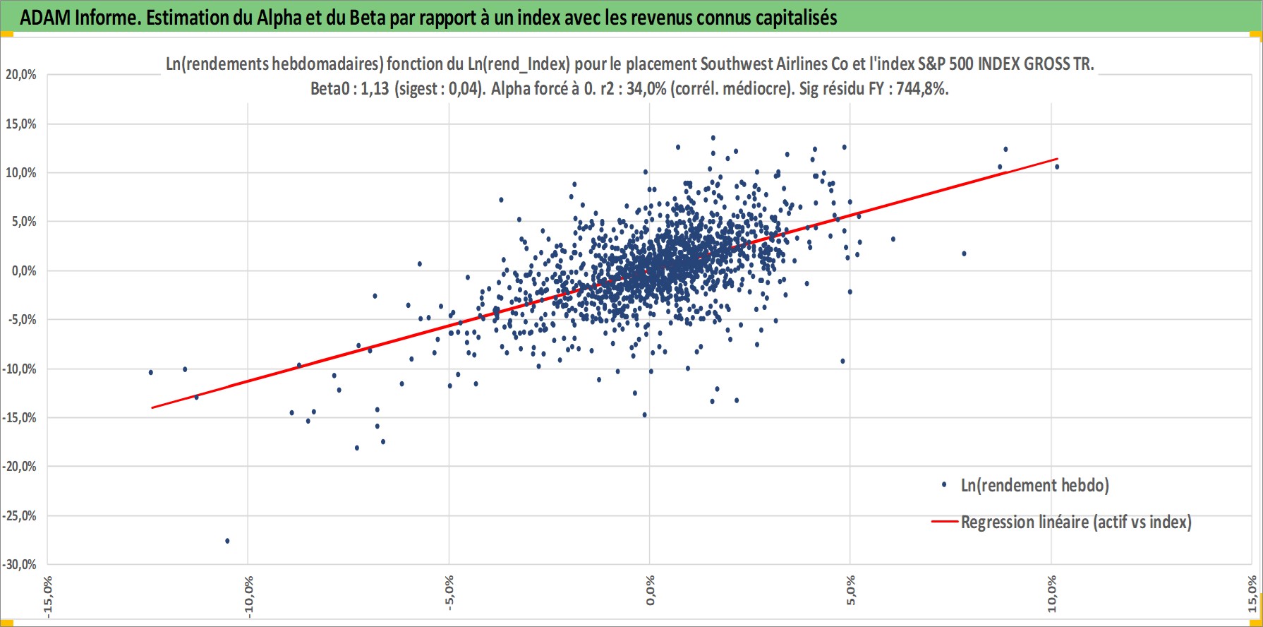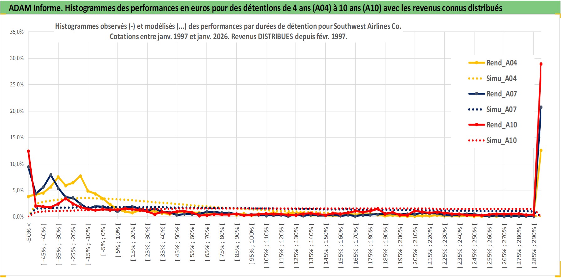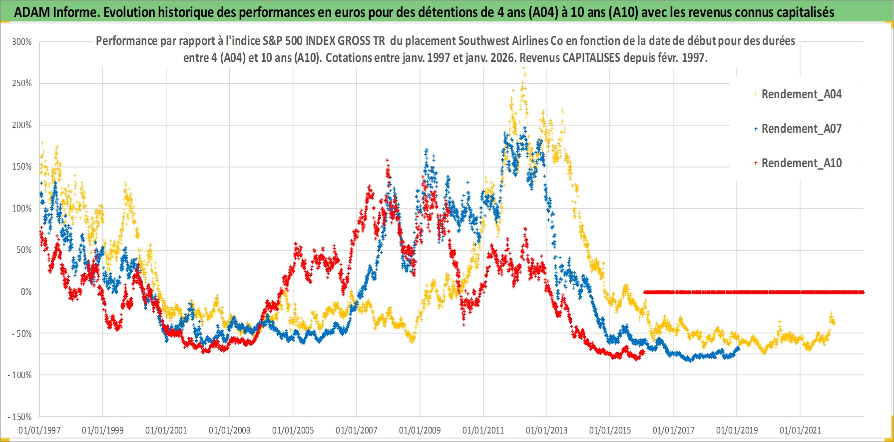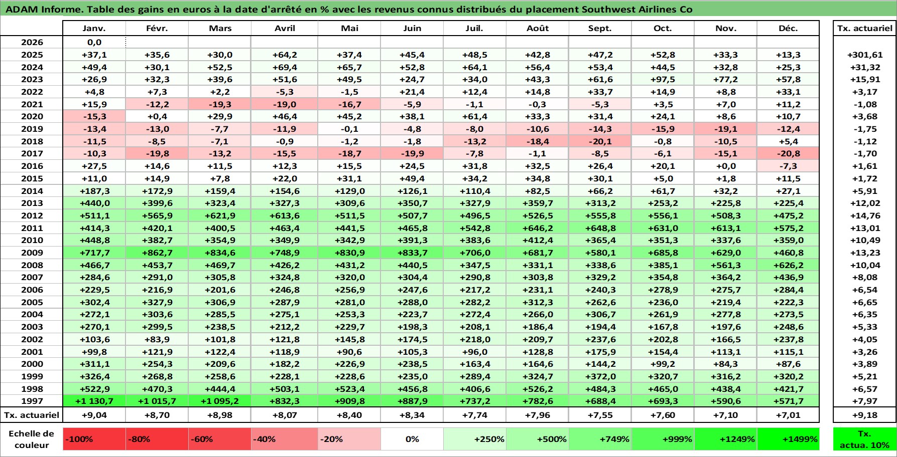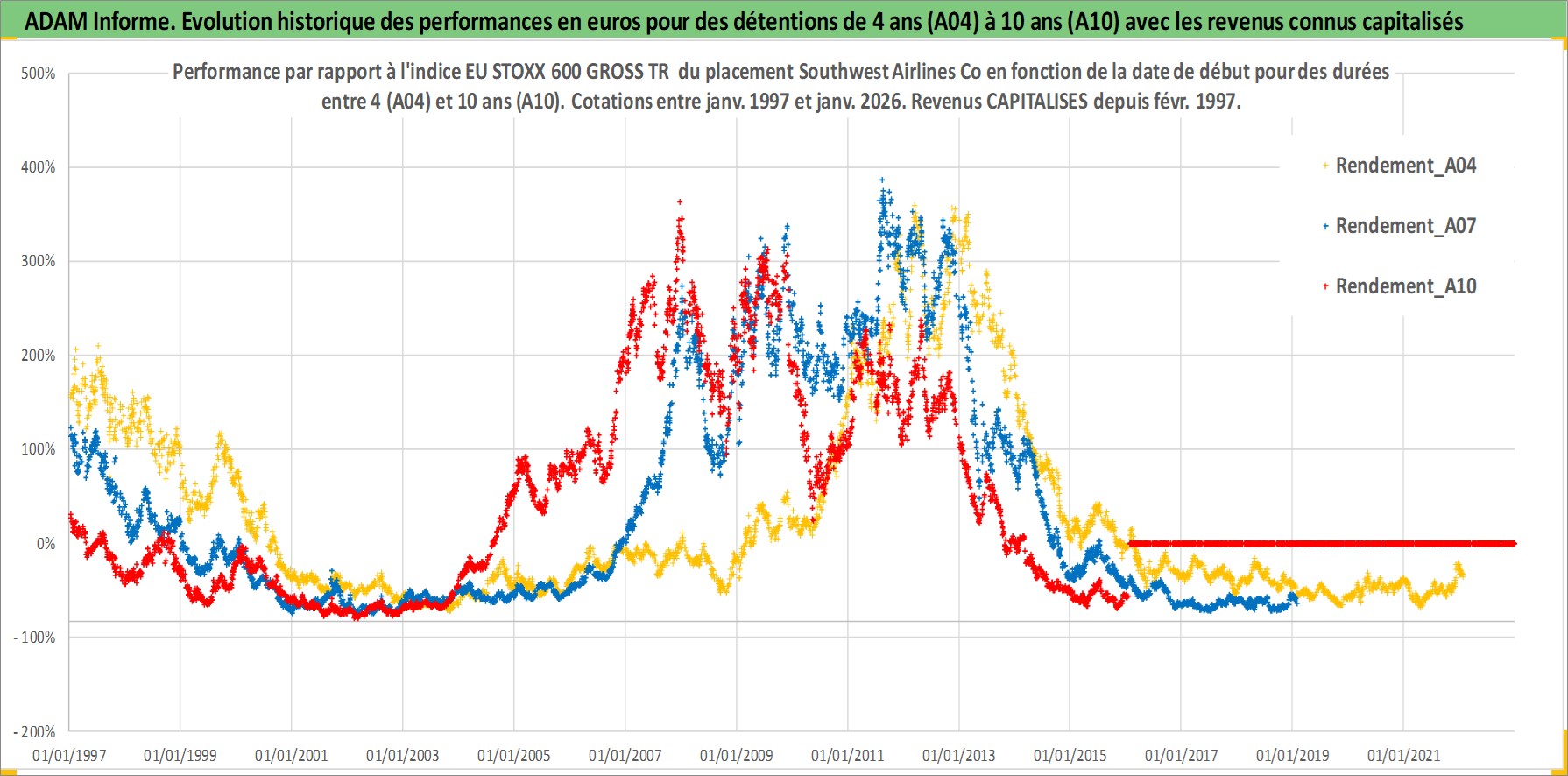 Site dédié aux investisseursPage dédiée sur site financeAnalyse des valorisations hebdomadaires de l'action Southwest Airlines Co. Cet actif est cote en USD. Les valorisations sont en contrevaleur EURO et couvrent les semaines 1997W01 a 2026W05. Les revenus de cet actif financier sont pris en compte depuis la semaine 1997W09. La note globale ESG de cet actif est estimee a 4.0 (apres rebasage entre 0 et 20).
