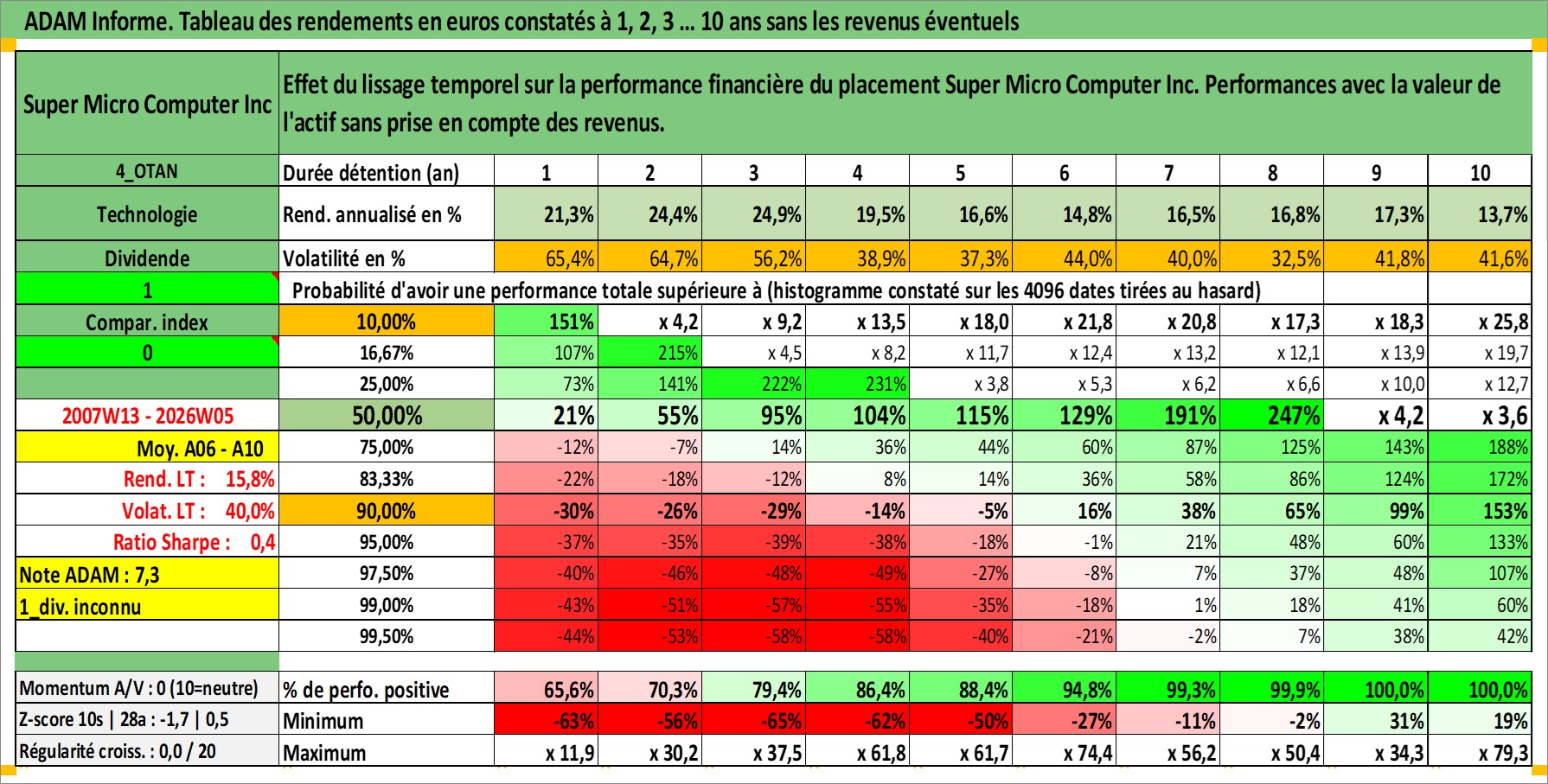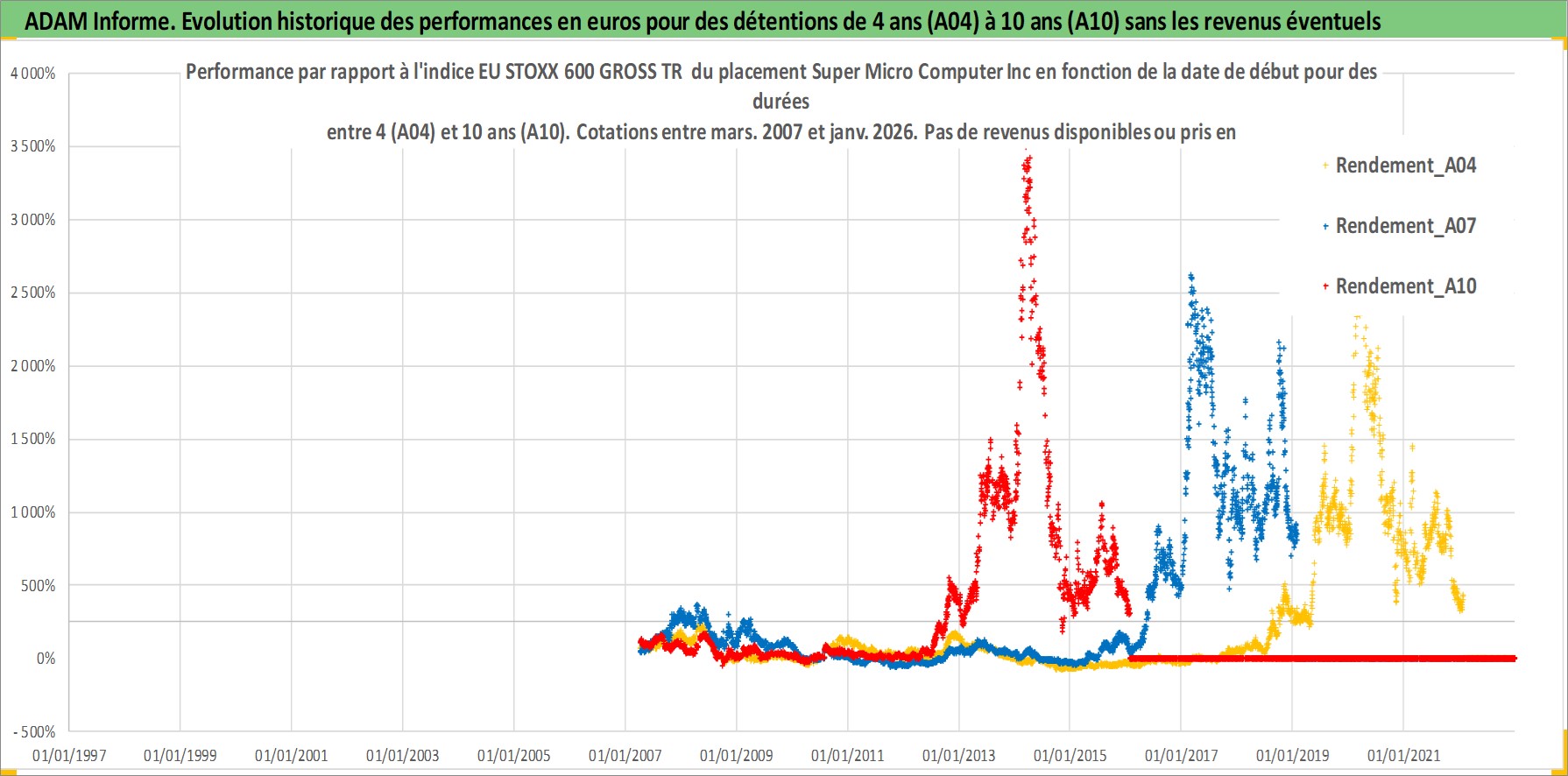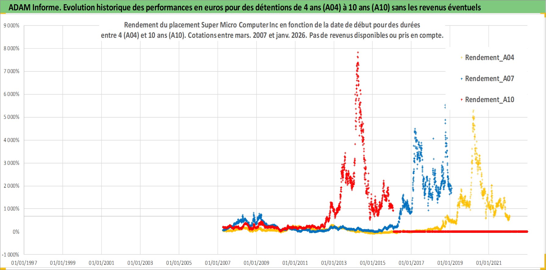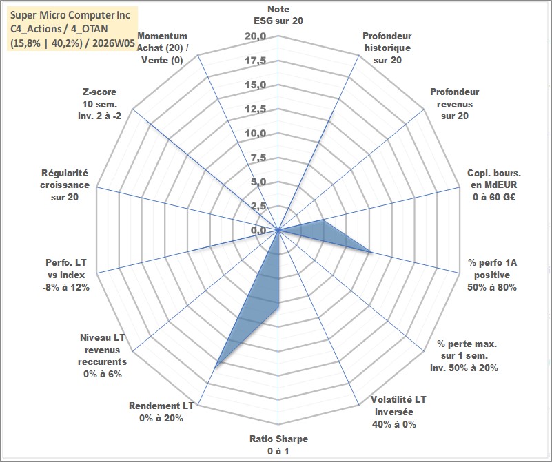 Site dédié aux investisseursPage dédiée sur site financeAnalyse des valorisations hebdomadaires de l'action Super Micro Computer Inc. Cet actif est cote en USD. Les valorisations sont en contrevaleur EURO et couvrent les semaines 2007W13 a 2026W05. Les revenus de cet actif financier ne sont pas connus car non existants ou non disponibles sur le site Yahoo Finance. La note ESG de cet actif n'est pas connue.