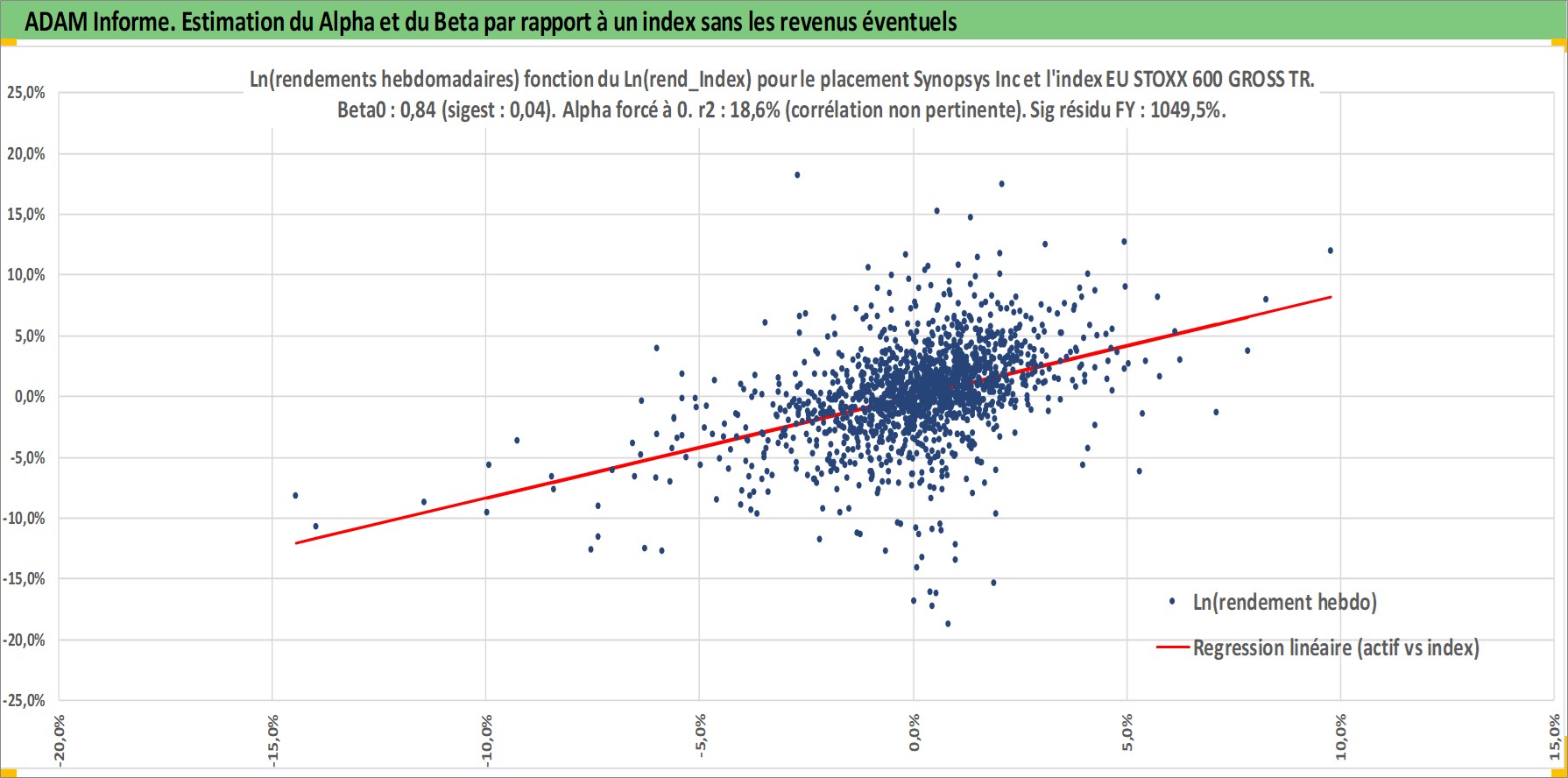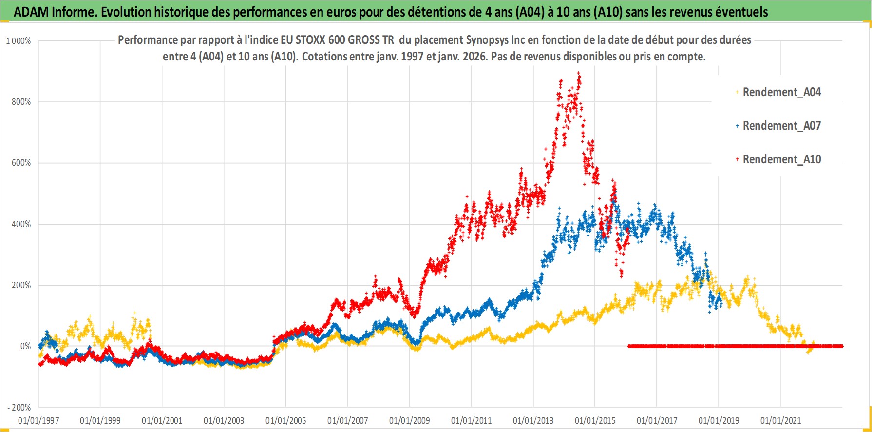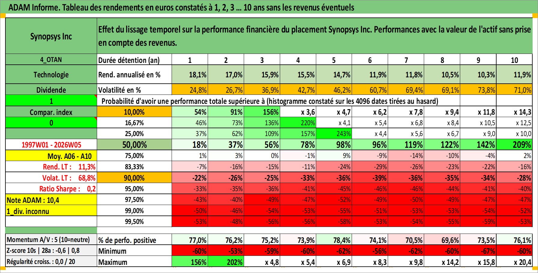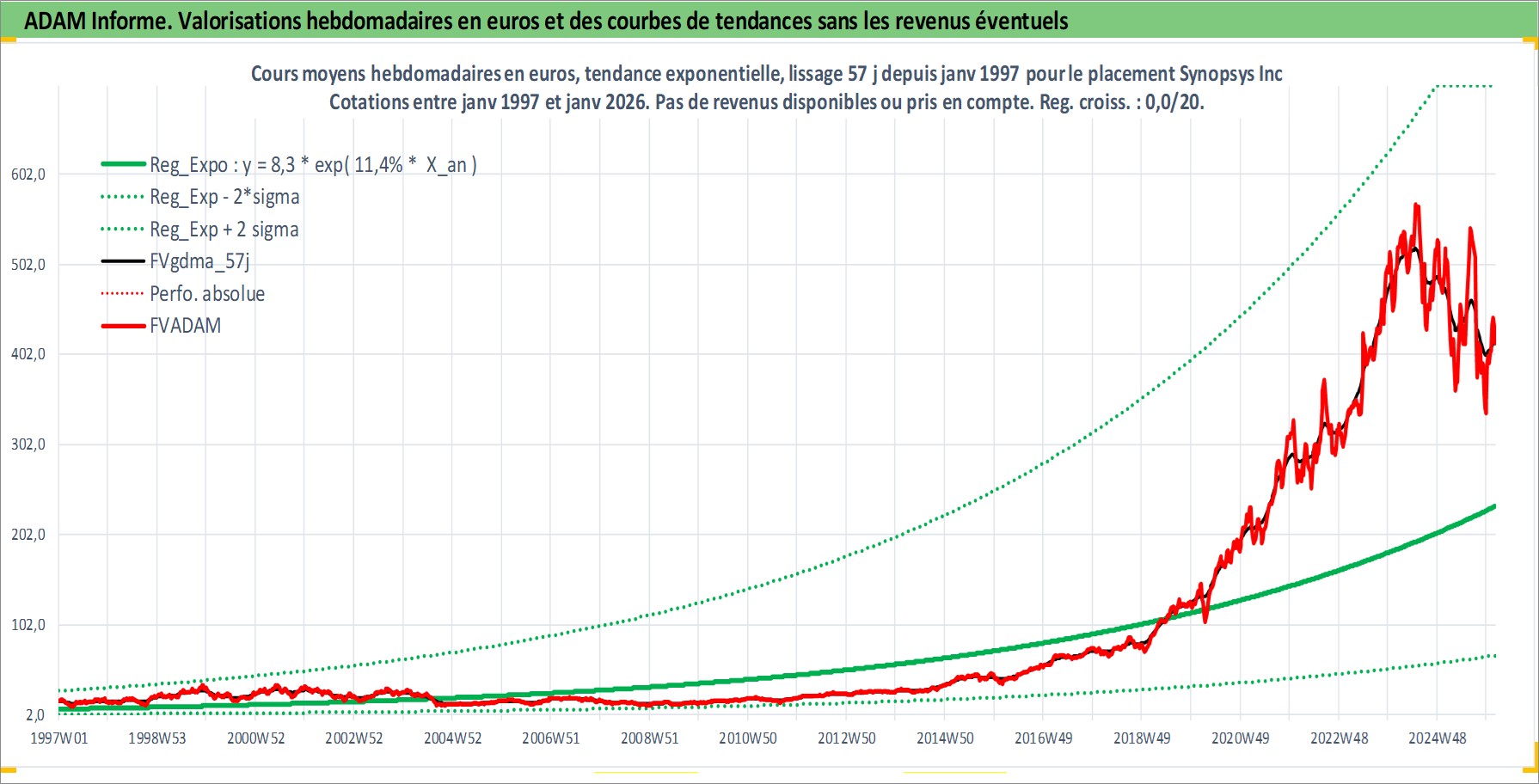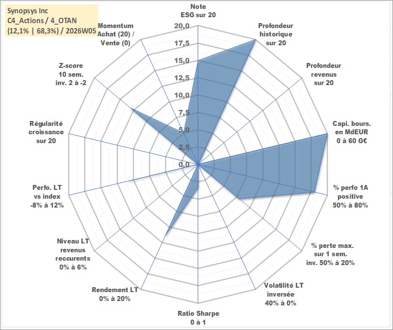 Site dédié aux investisseursPage dédiée sur site financeAnalyse des valorisations hebdomadaires de l'action Synopsys Inc. Cet actif est cote en USD. Les valorisations sont en contrevaleur EURO et couvrent les semaines 1997W01 a 2026W05. Les revenus de cet actif financier ne sont pas connus car non existants ou non disponibles sur le site Yahoo Finance. La note globale ESG de cet actif est estimee a 15.0 (apres rebasage entre 0 et 20).