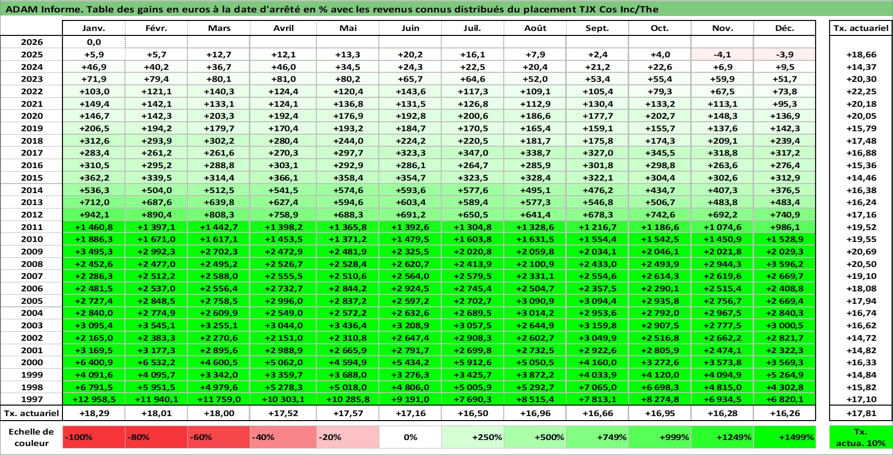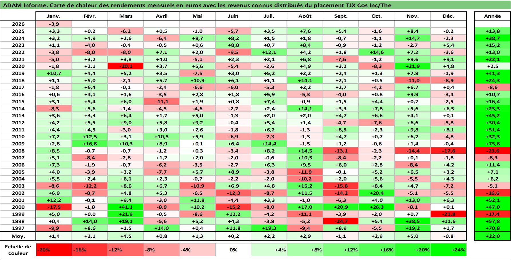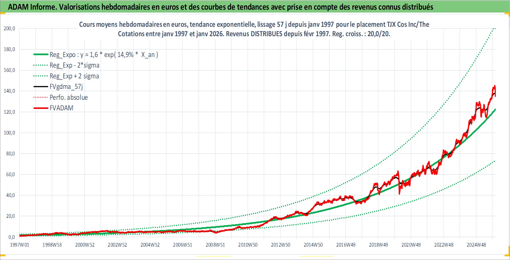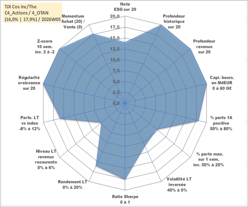 Site dédié aux investisseursPage dédiée sur site financeAnalyse des valorisations hebdomadaires de l'action TJX Cos Inc/The. Cet actif est cote en USD. Les valorisations sont en contrevaleur EURO et couvrent les semaines 1997W01 a 2026W05. Les revenus de cet actif financier sont pris en compte depuis la semaine 1997W06. La note globale ESG de cet actif est estimee a 14.0 (apres rebasage entre 0 et 20).