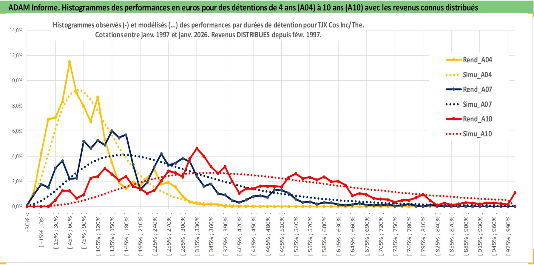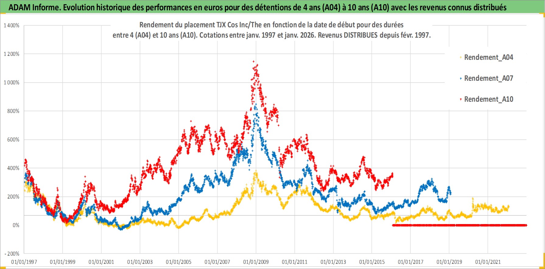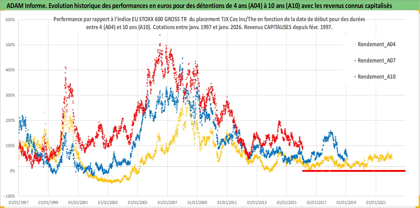 Site dédié aux investisseursPage dédiée sur site financeAnalyse des valorisations hebdomadaires de l'action TJX Cos Inc/The. Cet actif est cote en USD. Les valorisations sont en contrevaleur EURO et couvrent les semaines 1997W01 a 2026W05. Les revenus de cet actif financier sont pris en compte depuis la semaine 1997W06. La note globale ESG de cet actif est estimee a 14.0 (apres rebasage entre 0 et 20).